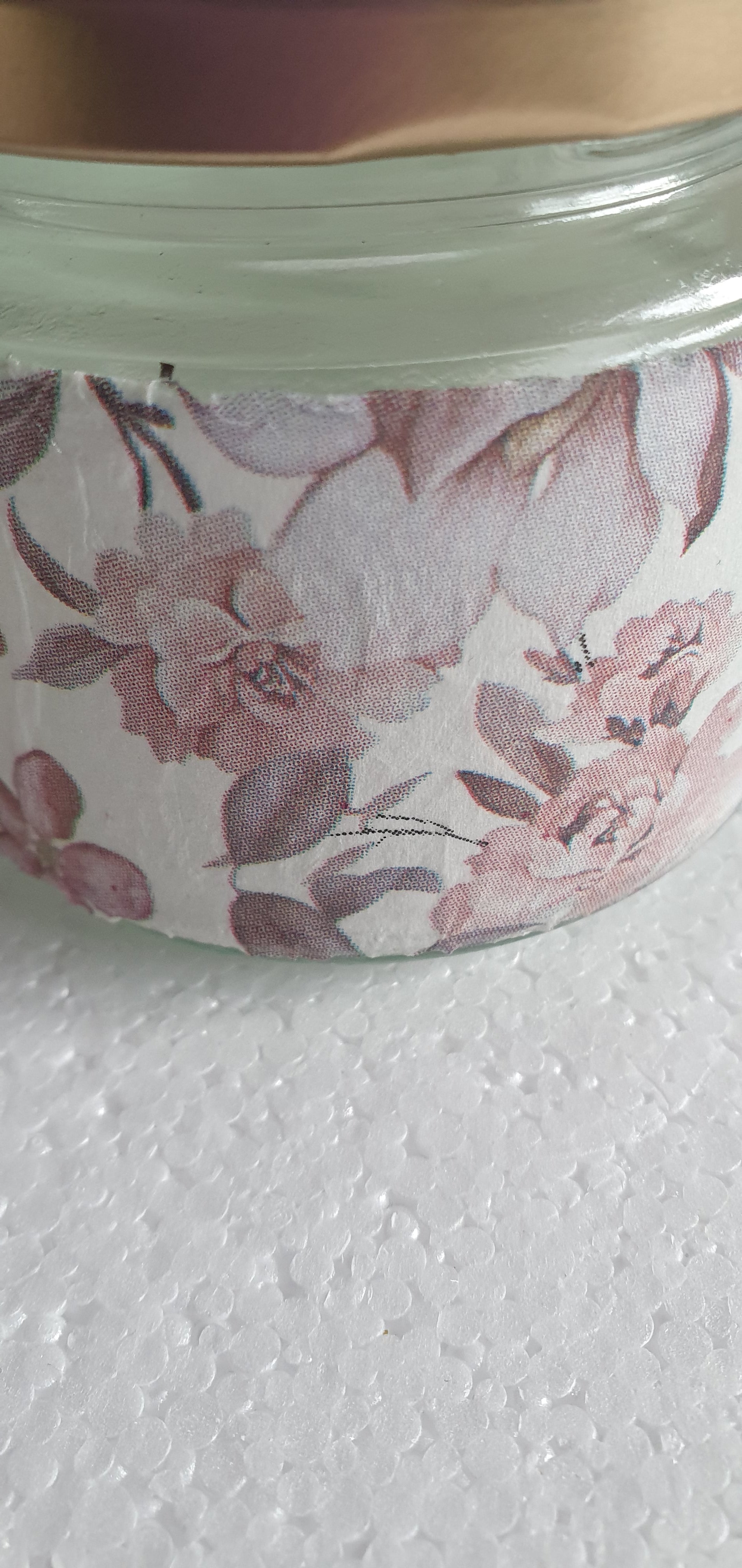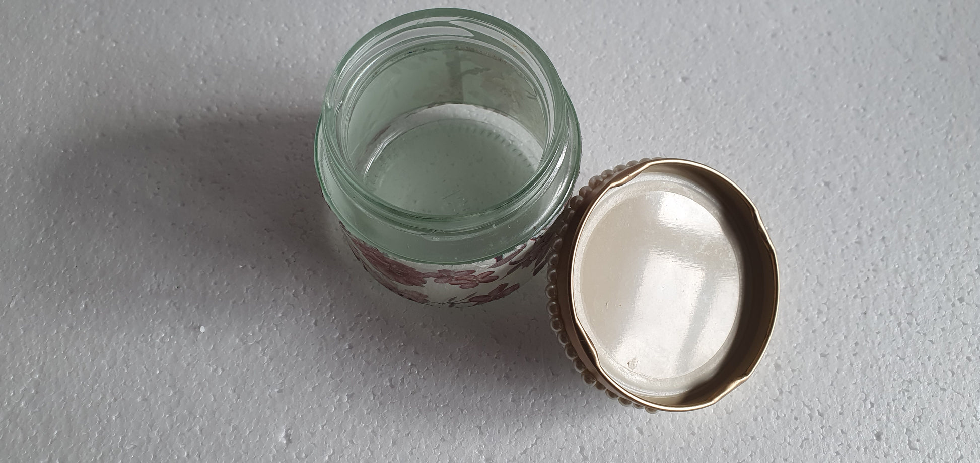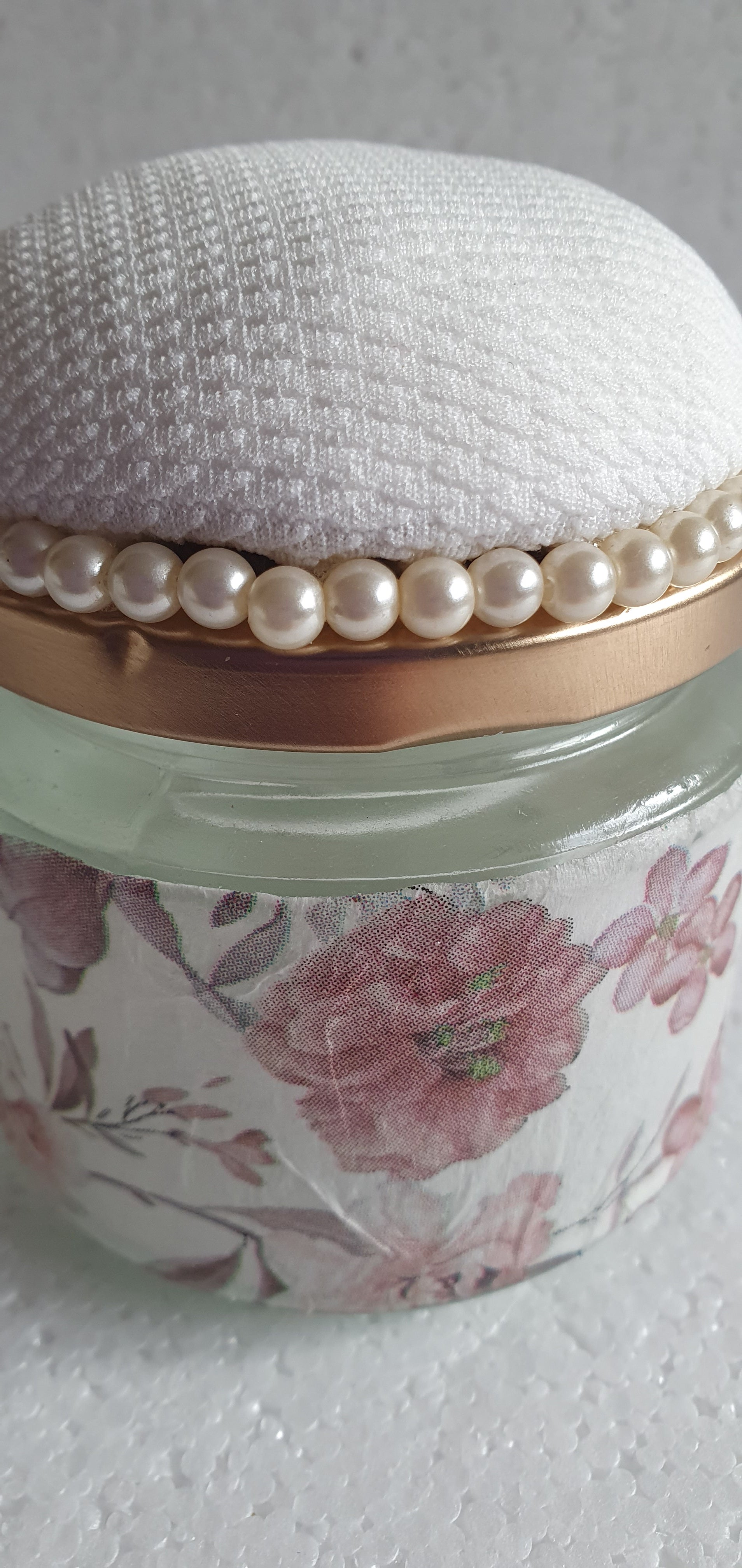 RESERVED for A-M Hand Decorated Glass Pin Cushion Jar Gold Cream Pink Floral Crafters Gift