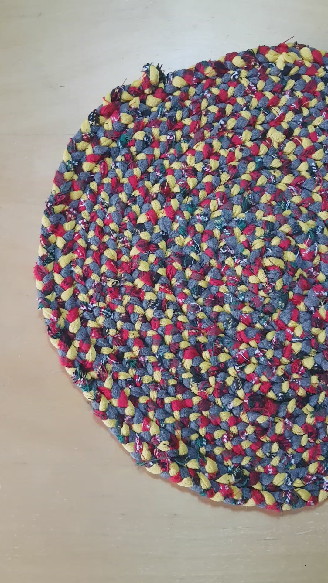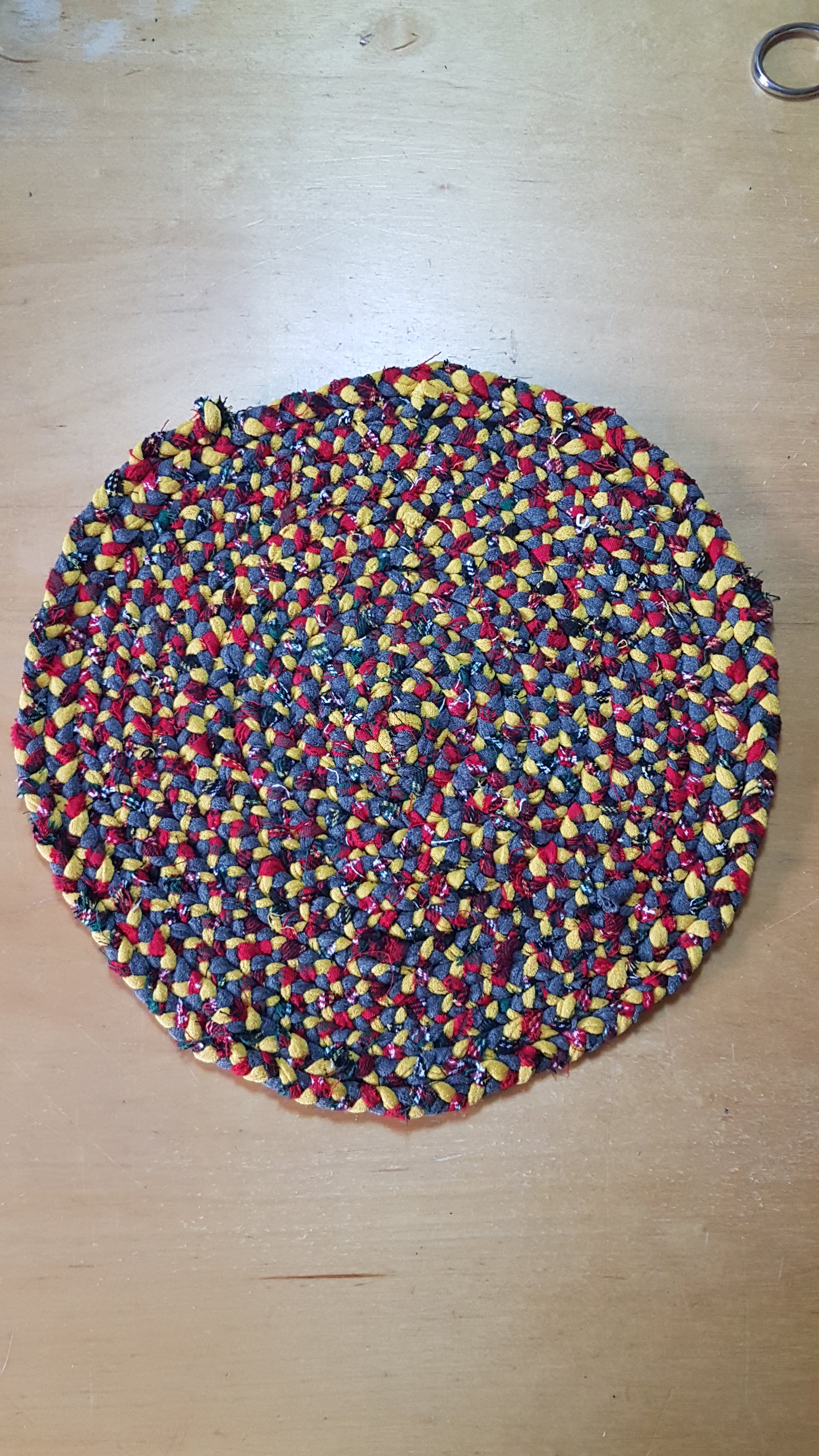 Up for sale here is a single hand-braided coaster place mat made with fabric recycled from my design studio, braided and stitched together into a round coaster.