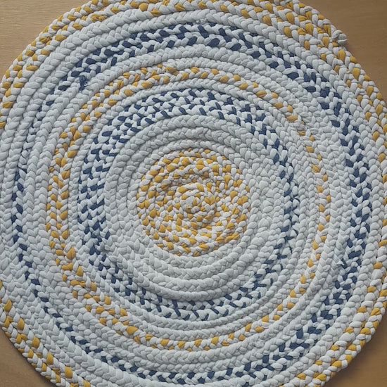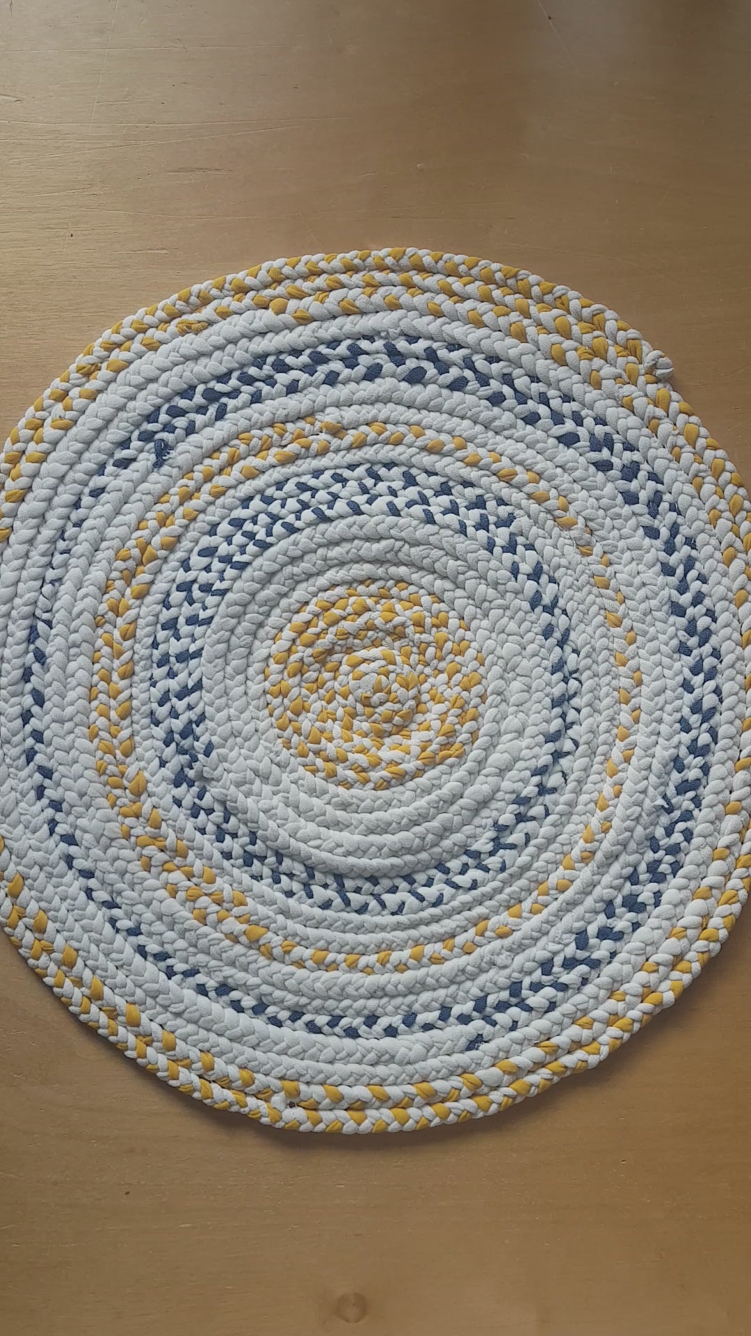 Up for sale here is a single hand-braided coaster place mat made with fabrics recycled from my design studio, braided and stitched together into a round coaster.