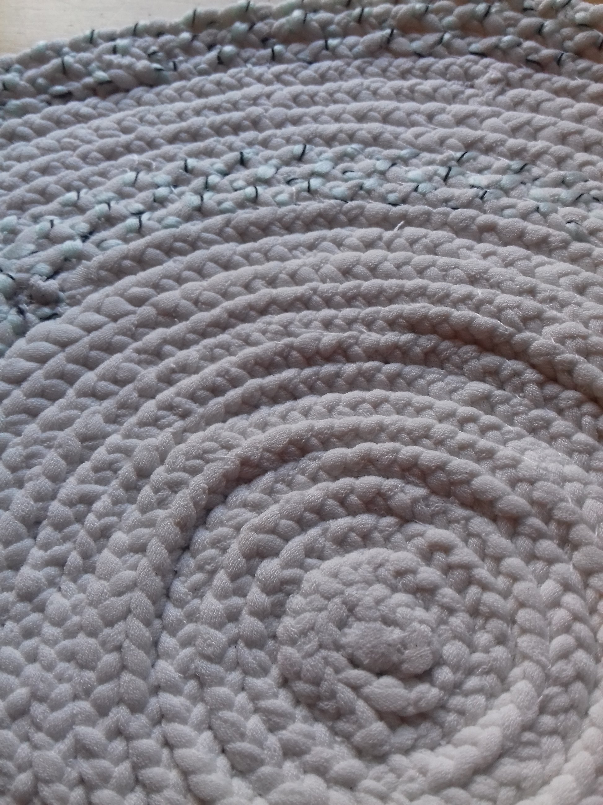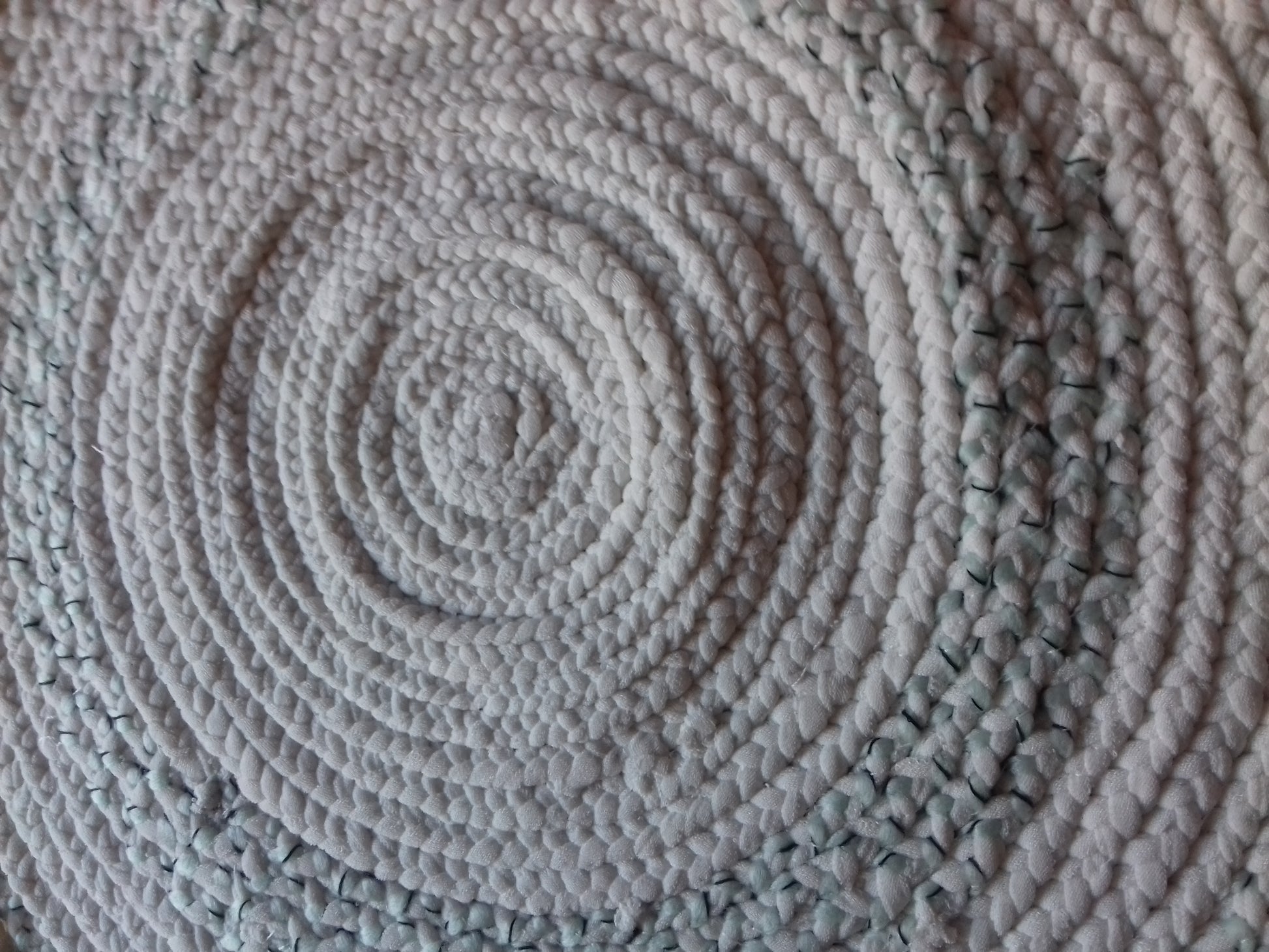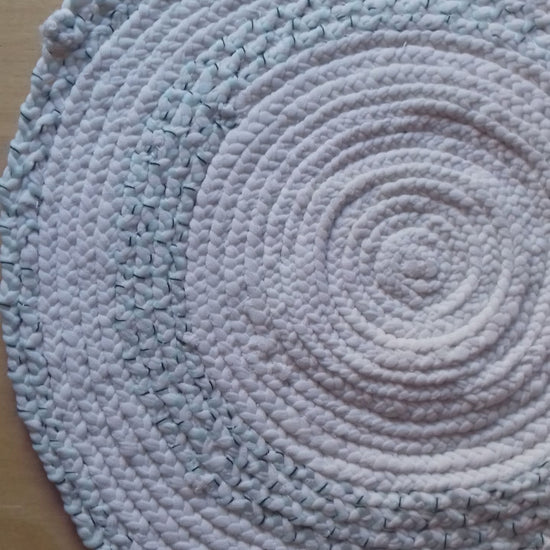 Up for sale here is a single hand-braided coaster place mat made with pale green yarn and ivory fabric recycled from my design studio, braided and stitched together into a round coaster. My fabrics are mostly a mixed blend of wool and man-made fibres. Unfortunately, I don't have the full content details as these are remnants and rescued materials.