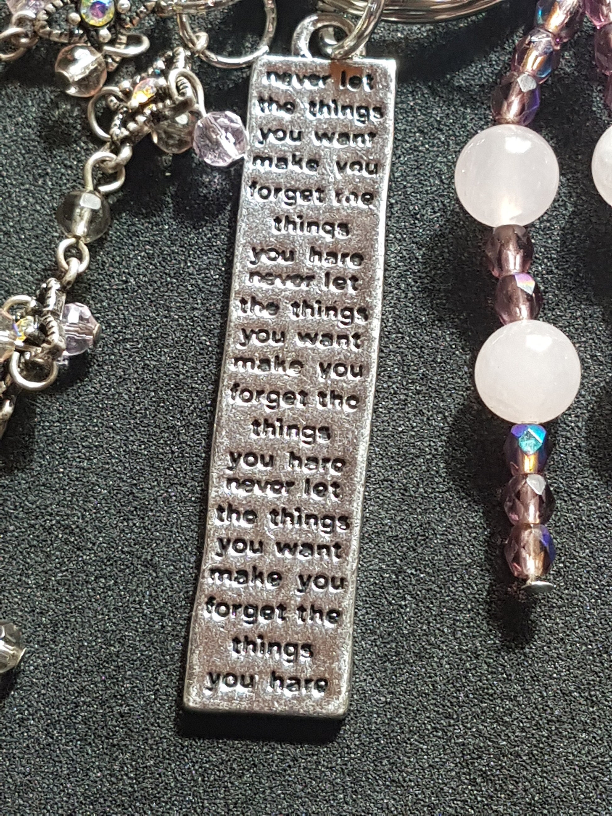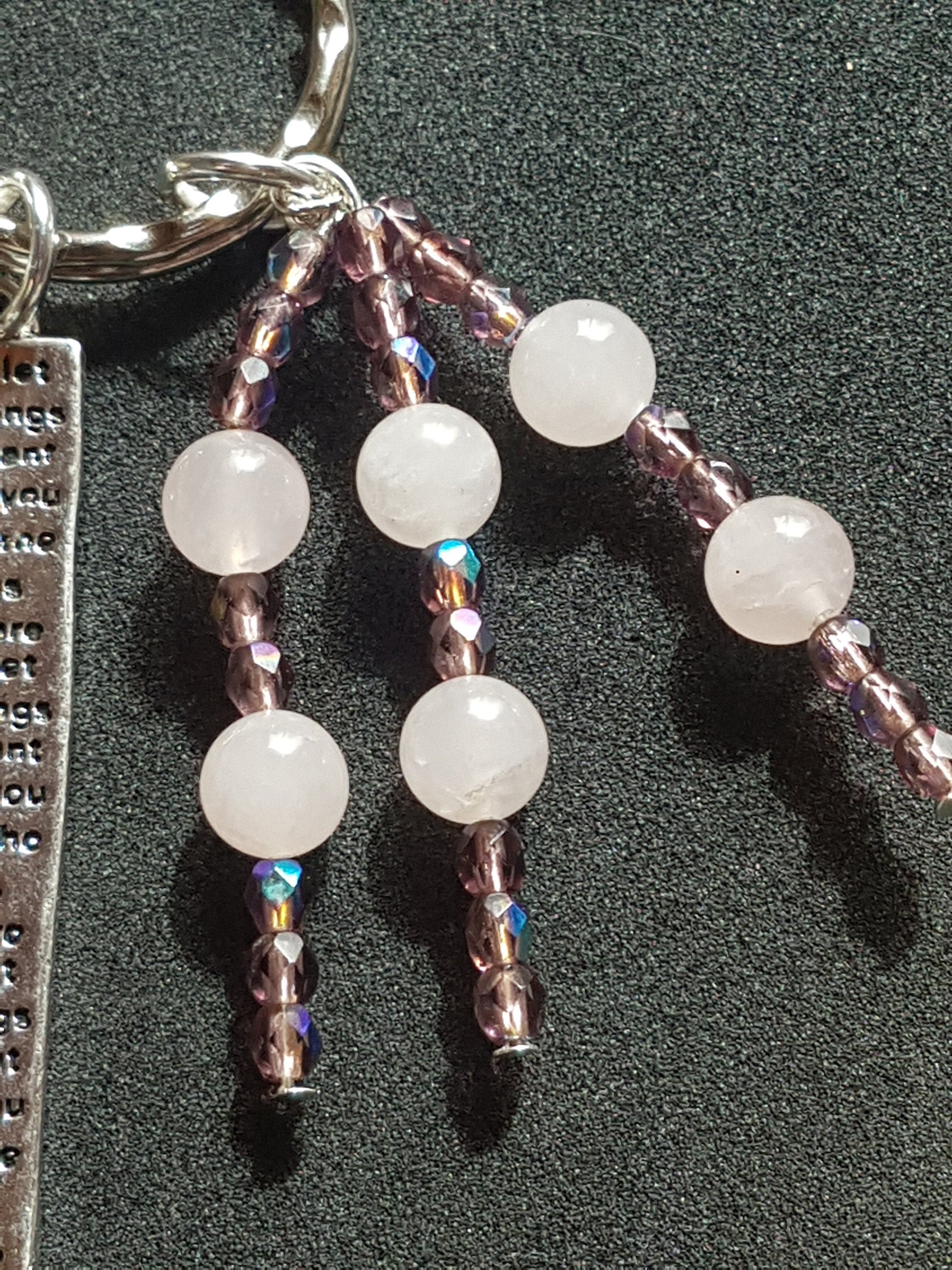 This is a gorgeous little keychain set on a silver chain and made from purple and pink beads, floral pendant pieces and an affectionate motivational text tablet in silver metal.