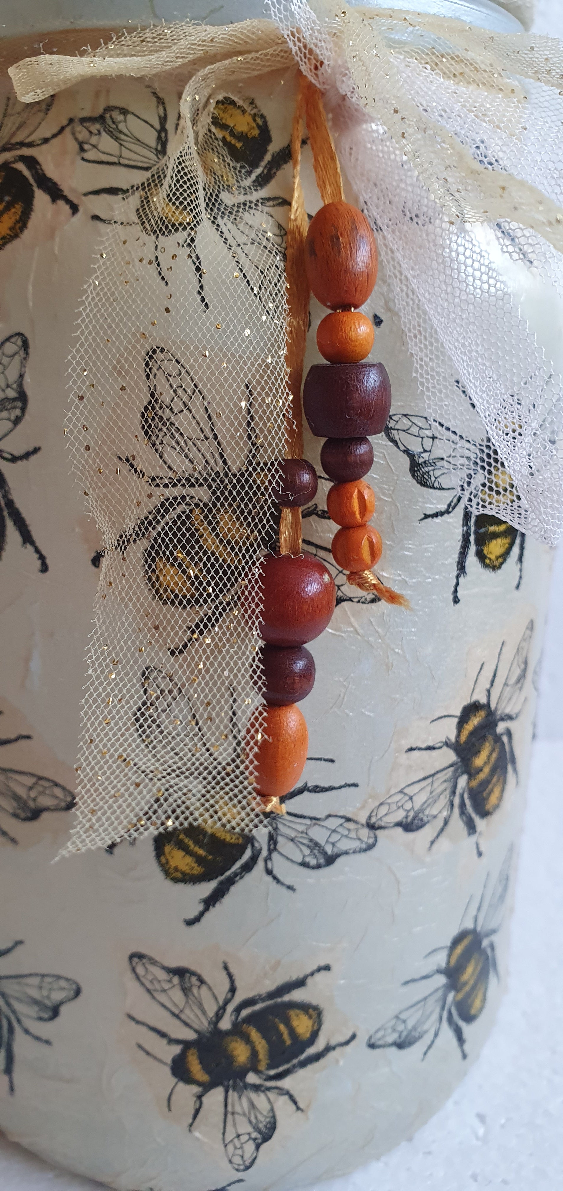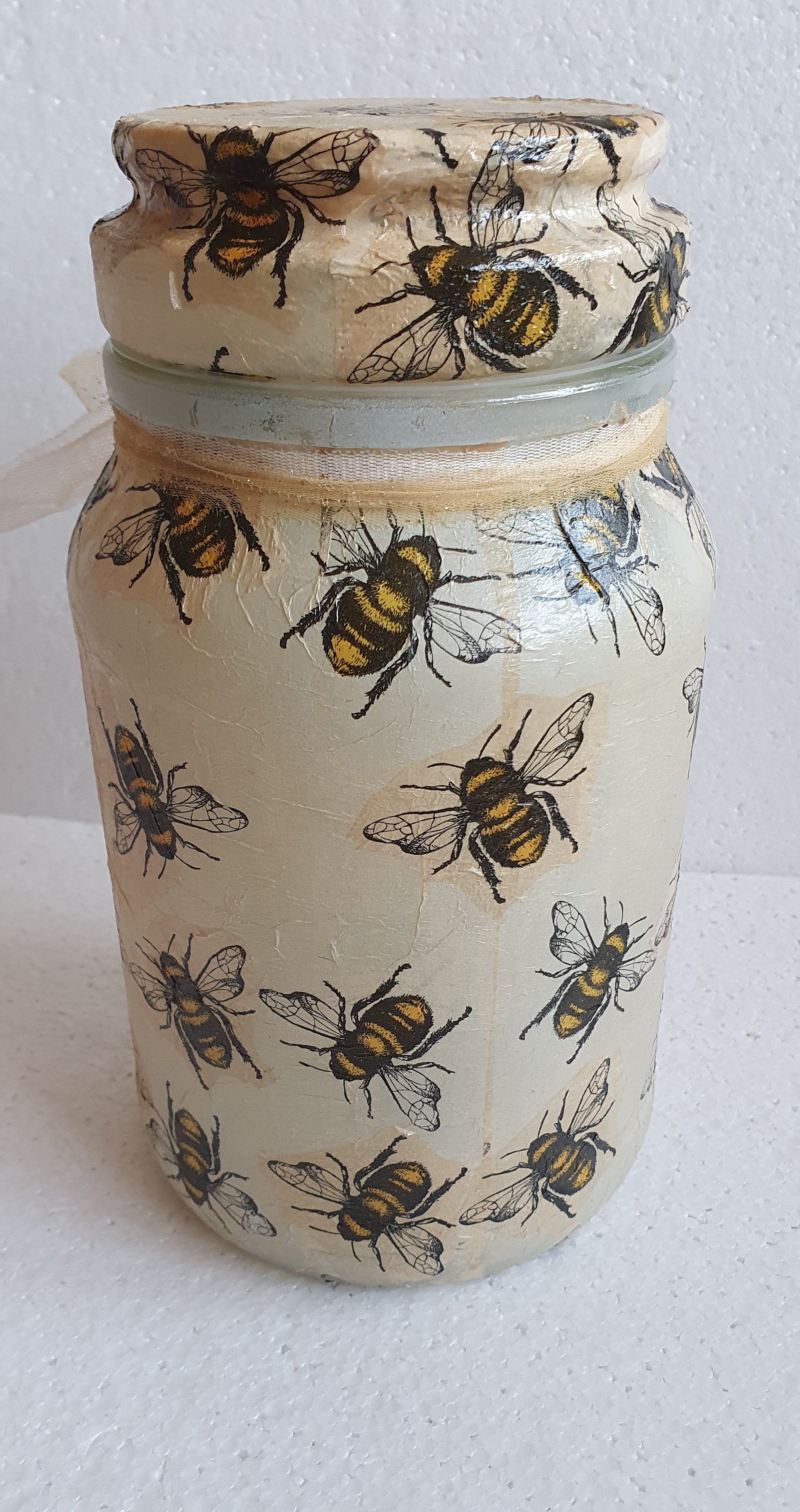 Large Hand Decorated Glass Pin Cushion Jar Beige Bumble Bee Crafters Gift