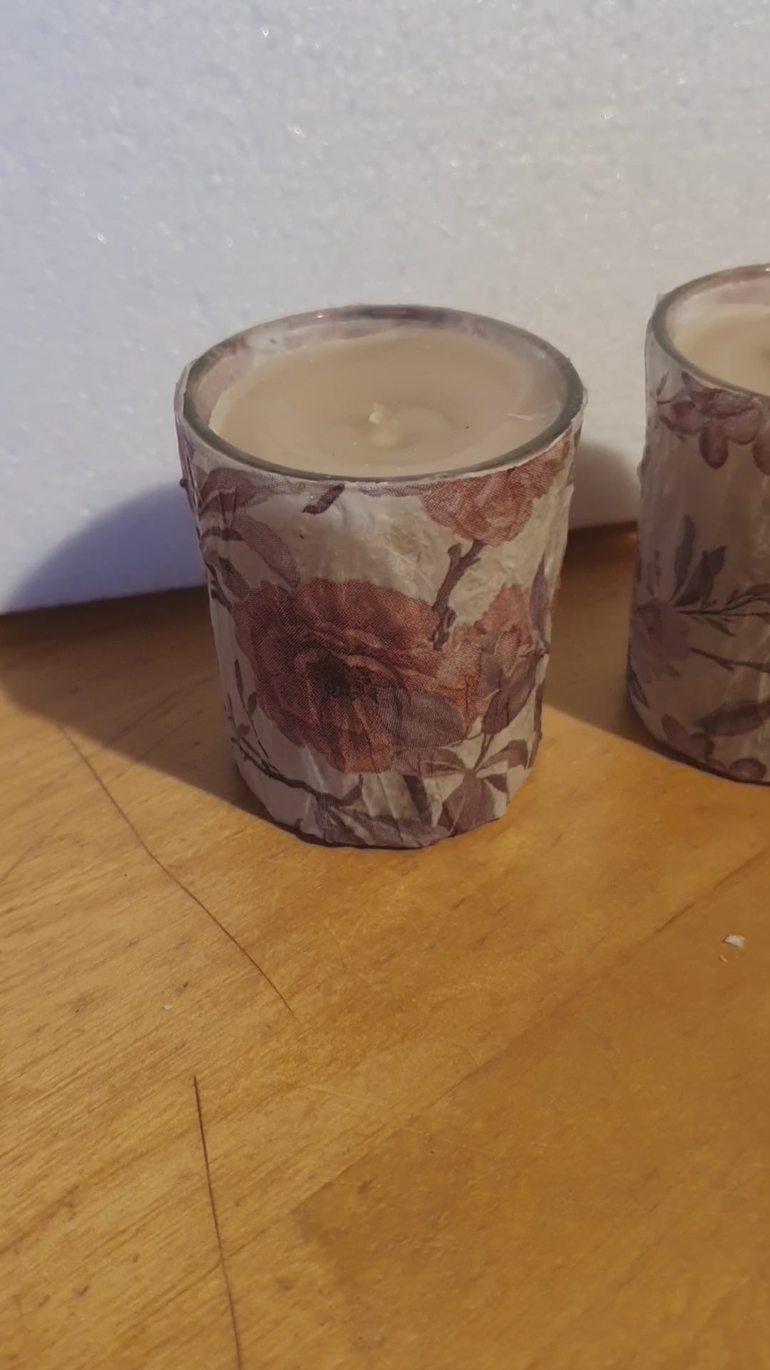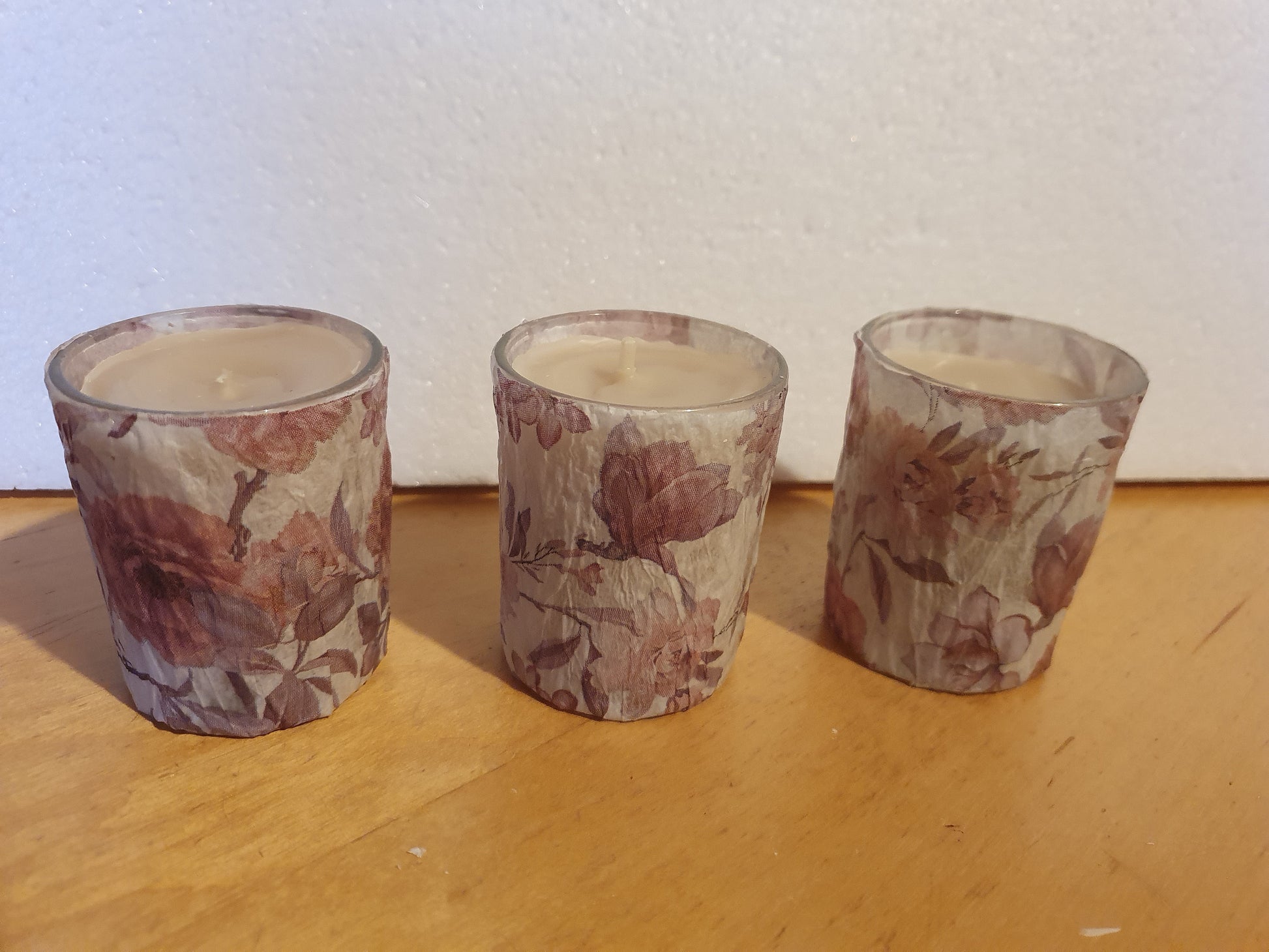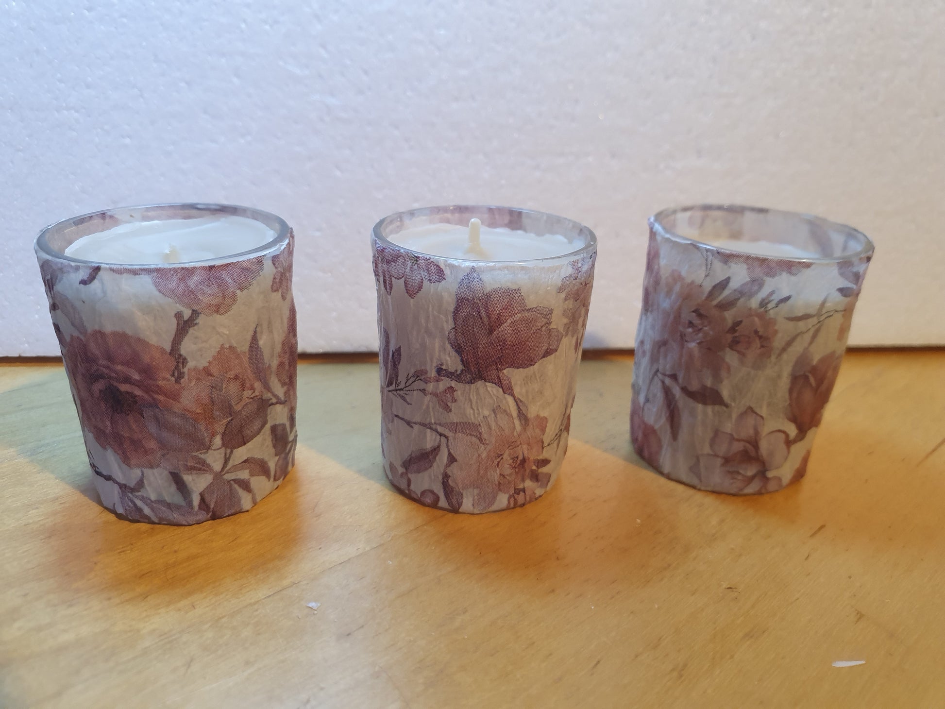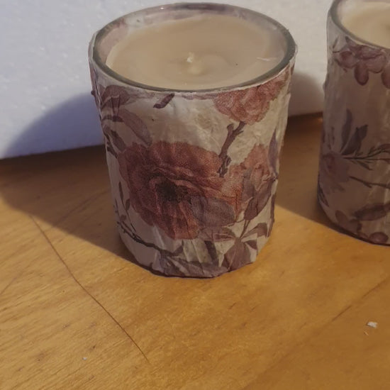 This set of 3 votives candles have been hand decorated by me in my studio using paper designs on reclaimed glass. Each one is a unique design and size and cannot be repeated.
