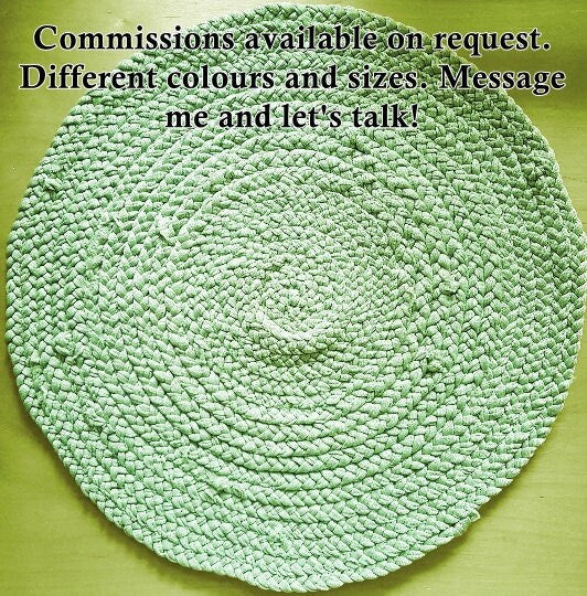 Up for sale here is a single hand-braided coaster place mat made with sage green fabric recycled from my design studio, braided and stitched together into a round coaster.
