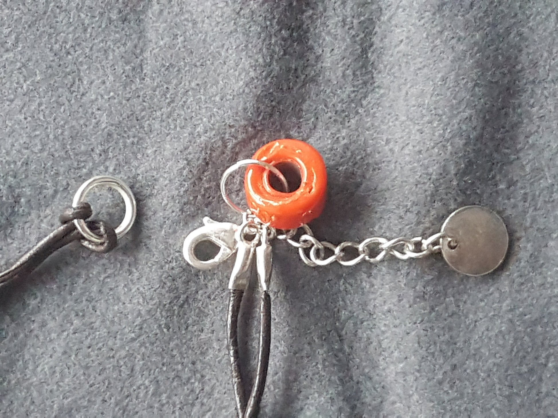 This one is 6.75 inches long including the hook and eye clasp. It is made from 2 strands of leather or faux leather and has an orange charm beads on it.