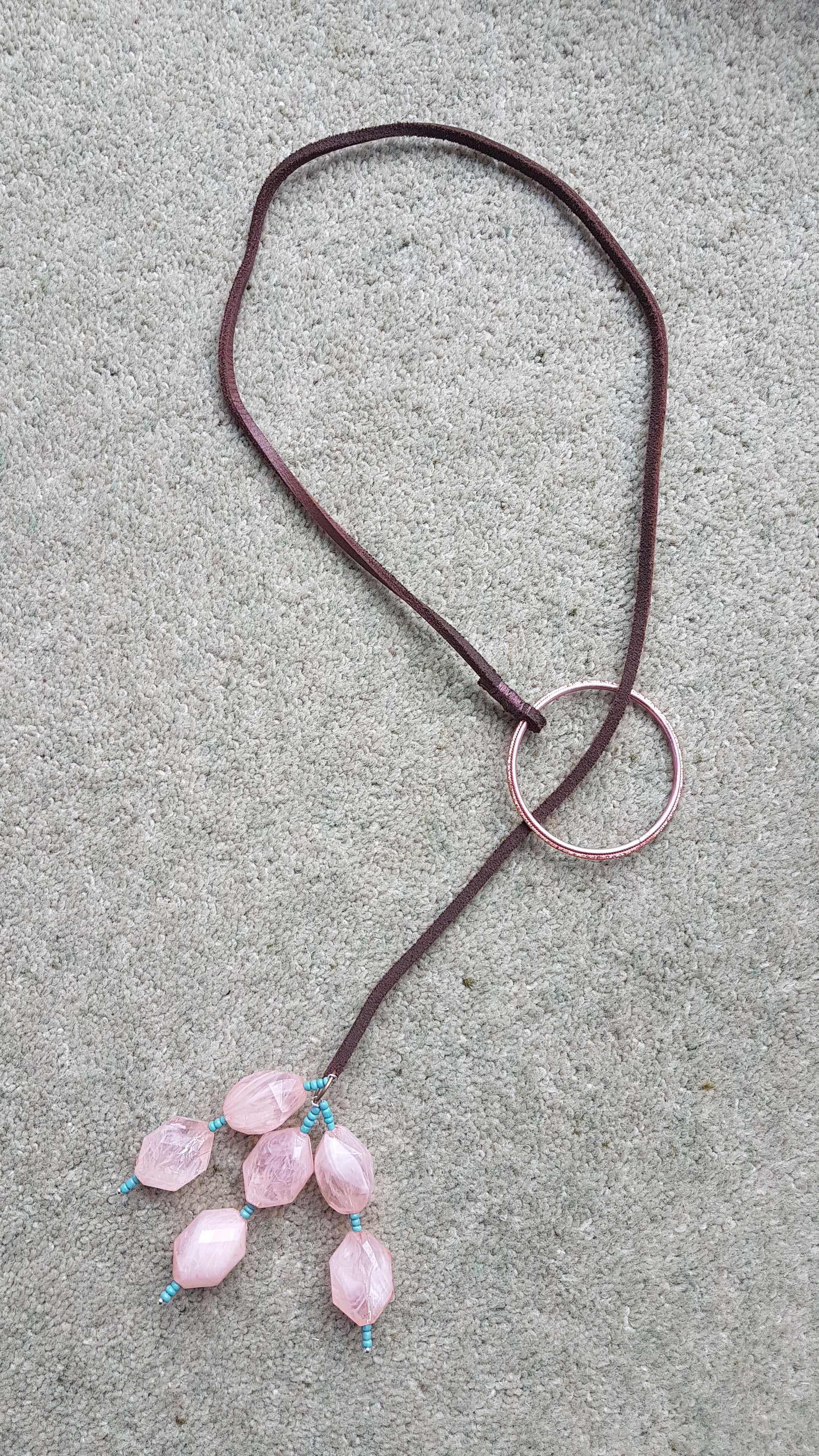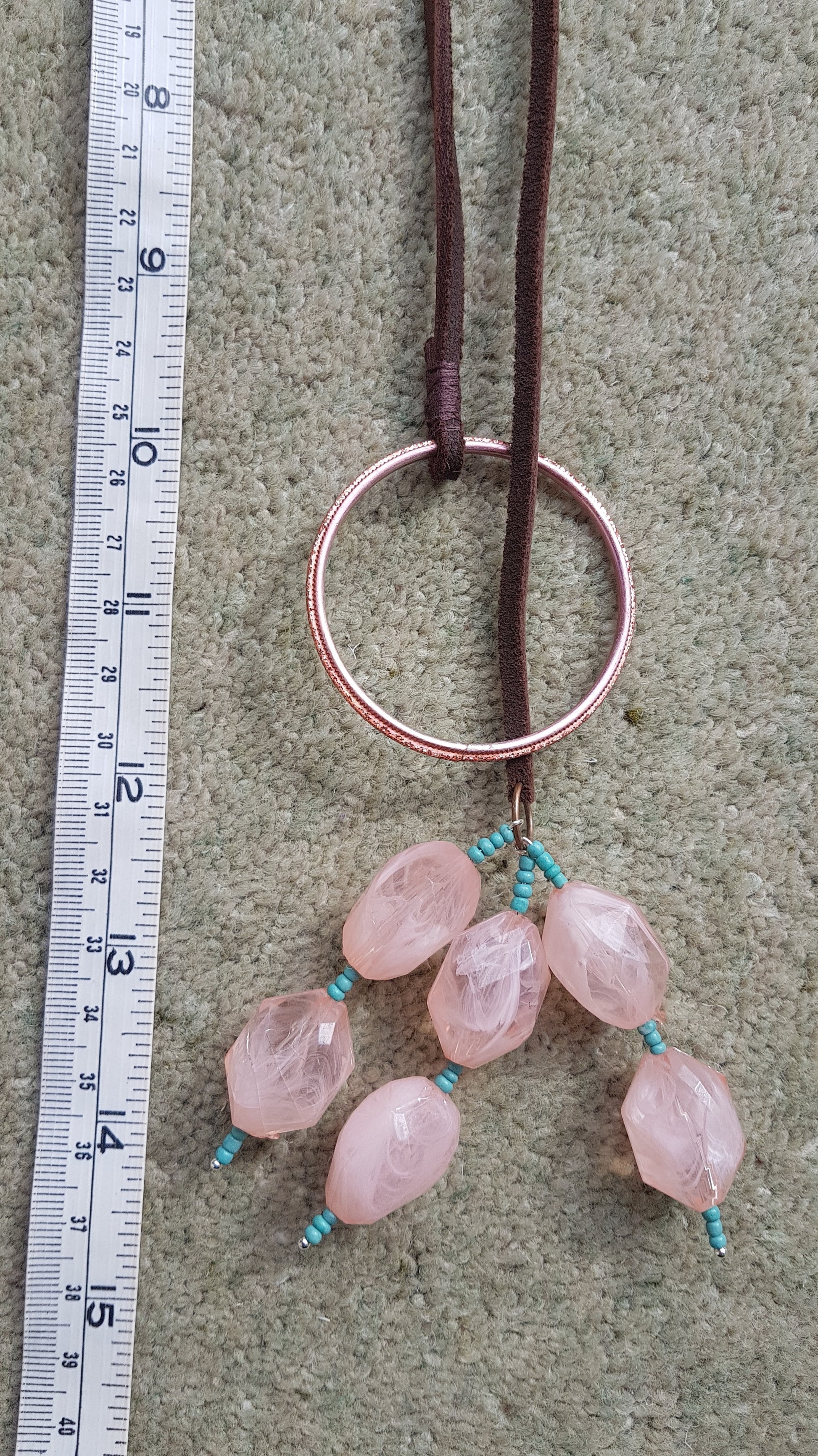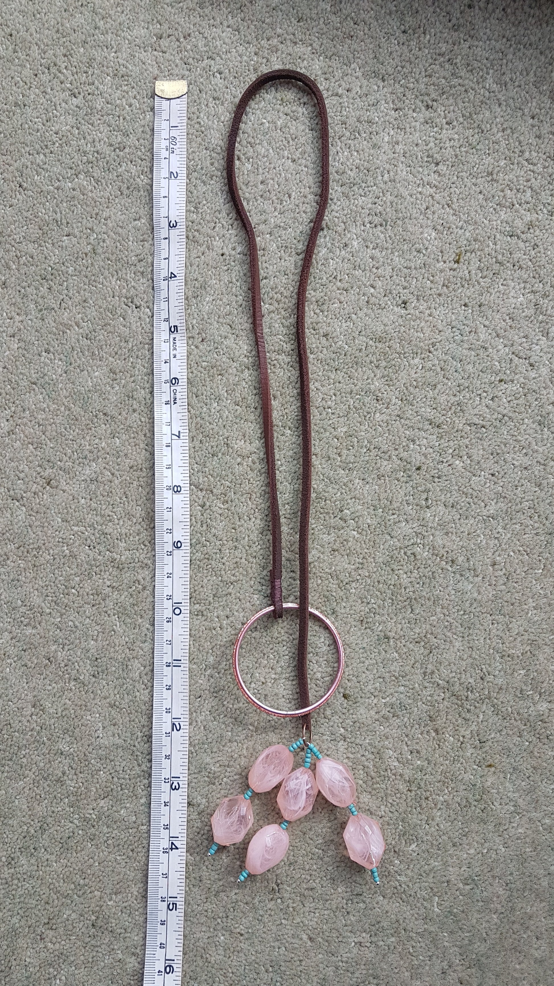 This necklace is made from a leather strand, metal hoop and pink beads with blue seed beads. It has a full length of approx 30 inches.