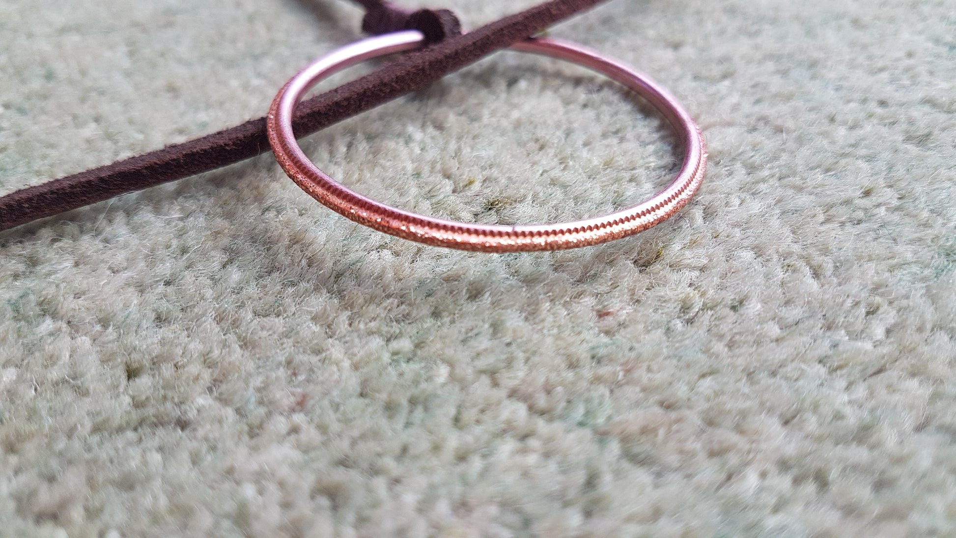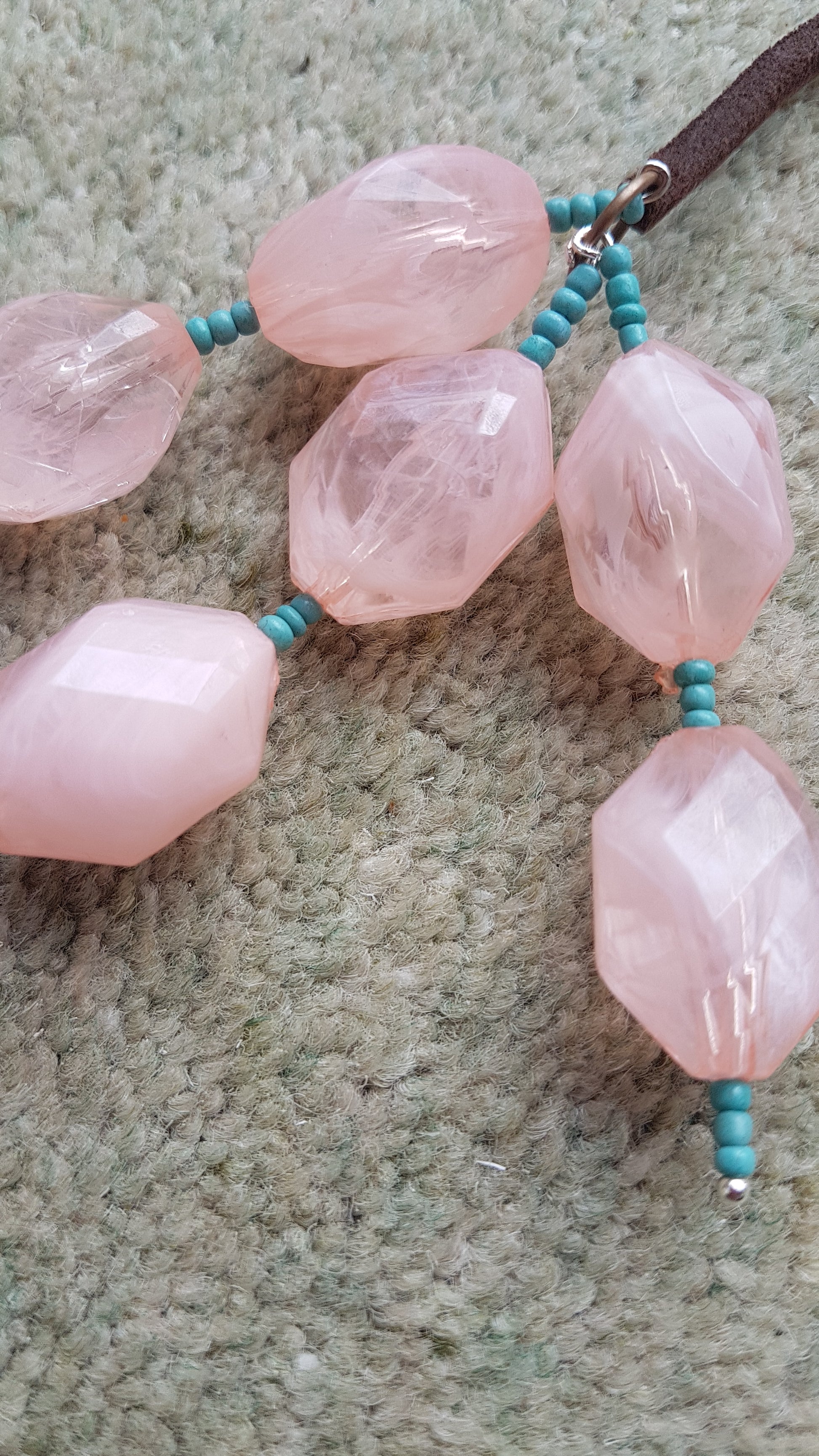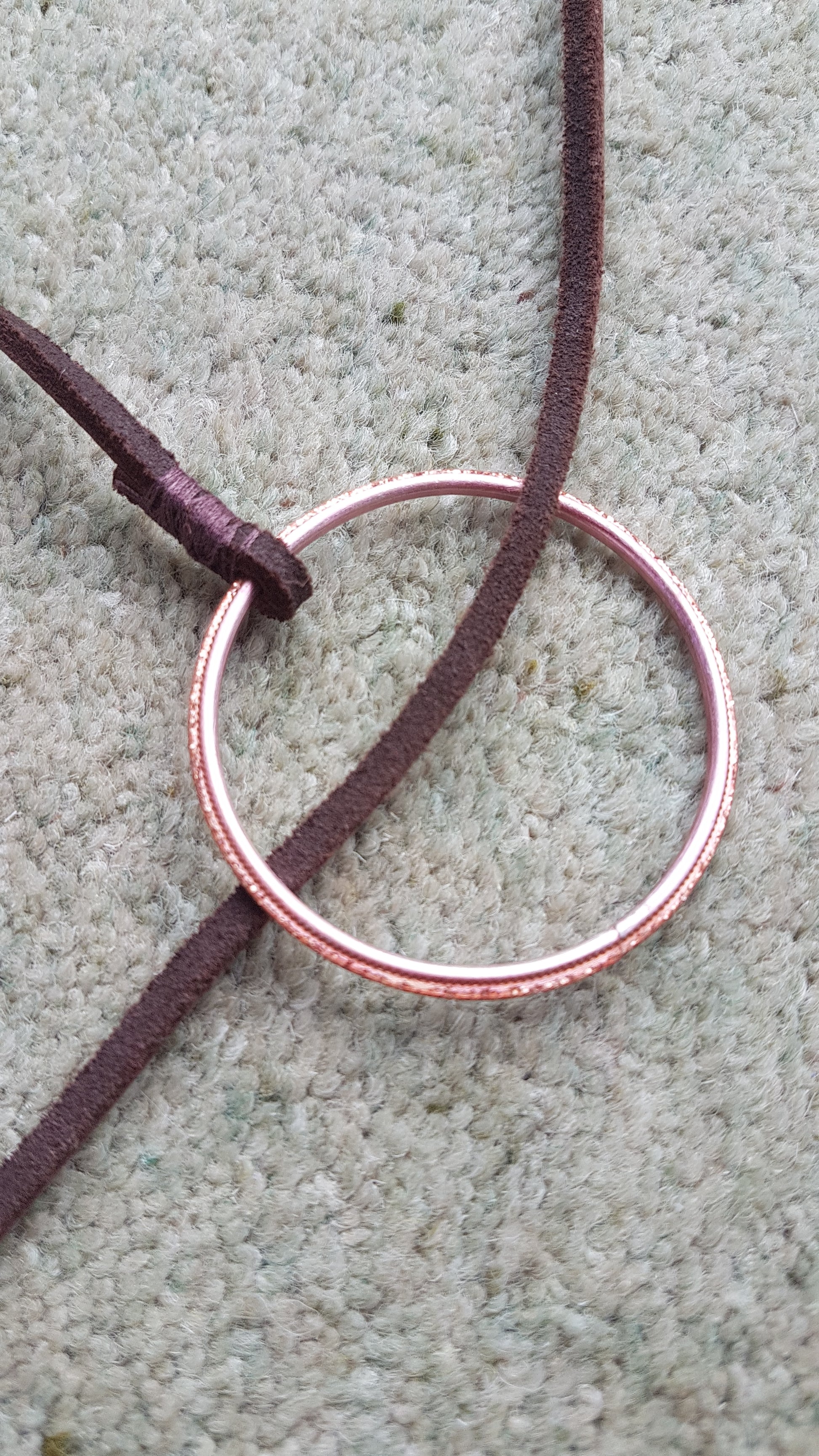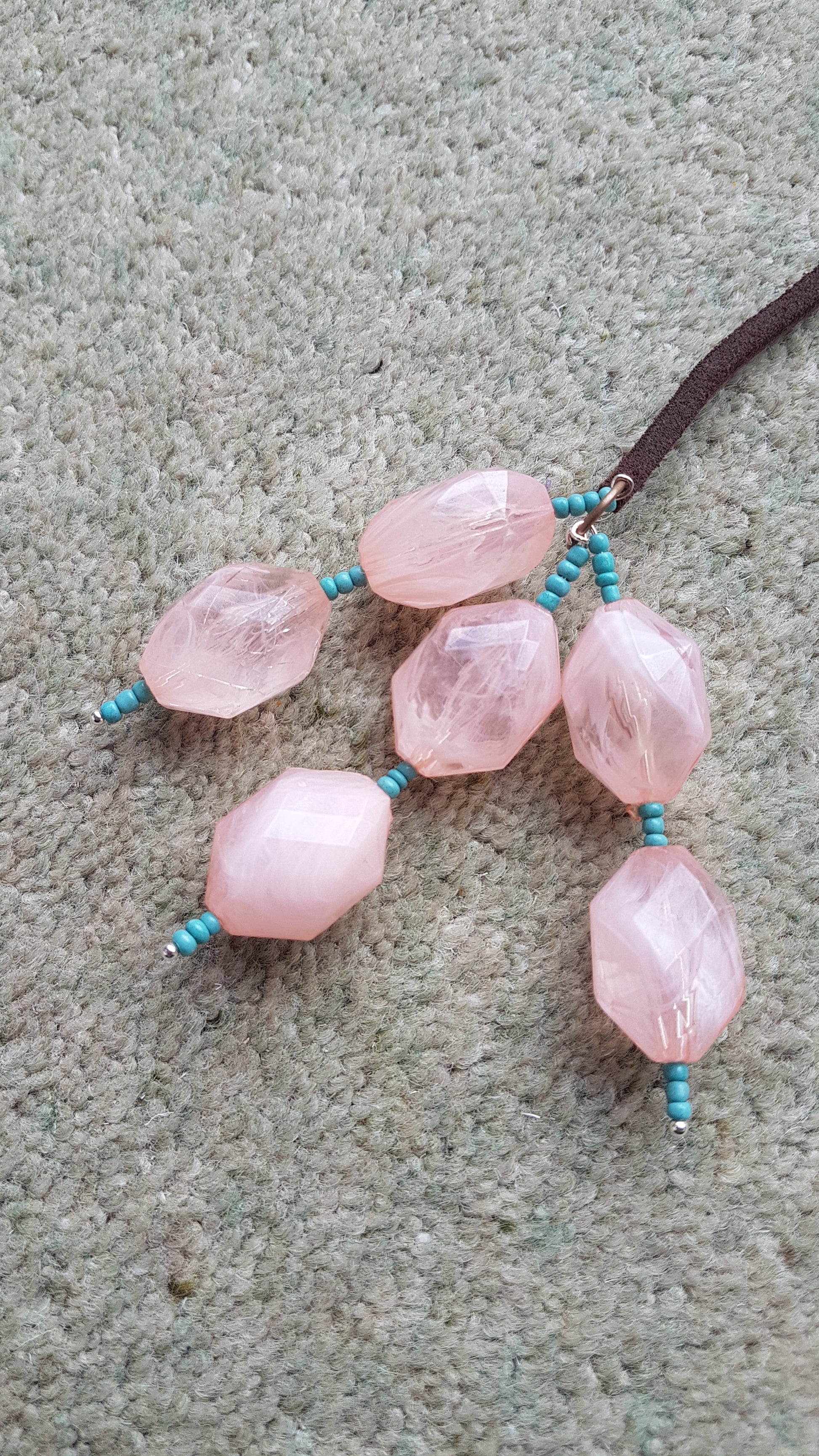 This necklace is made from a leather strand, metal hoop and pink beads with blue seed beads. It has a full length of approx 30 inches.