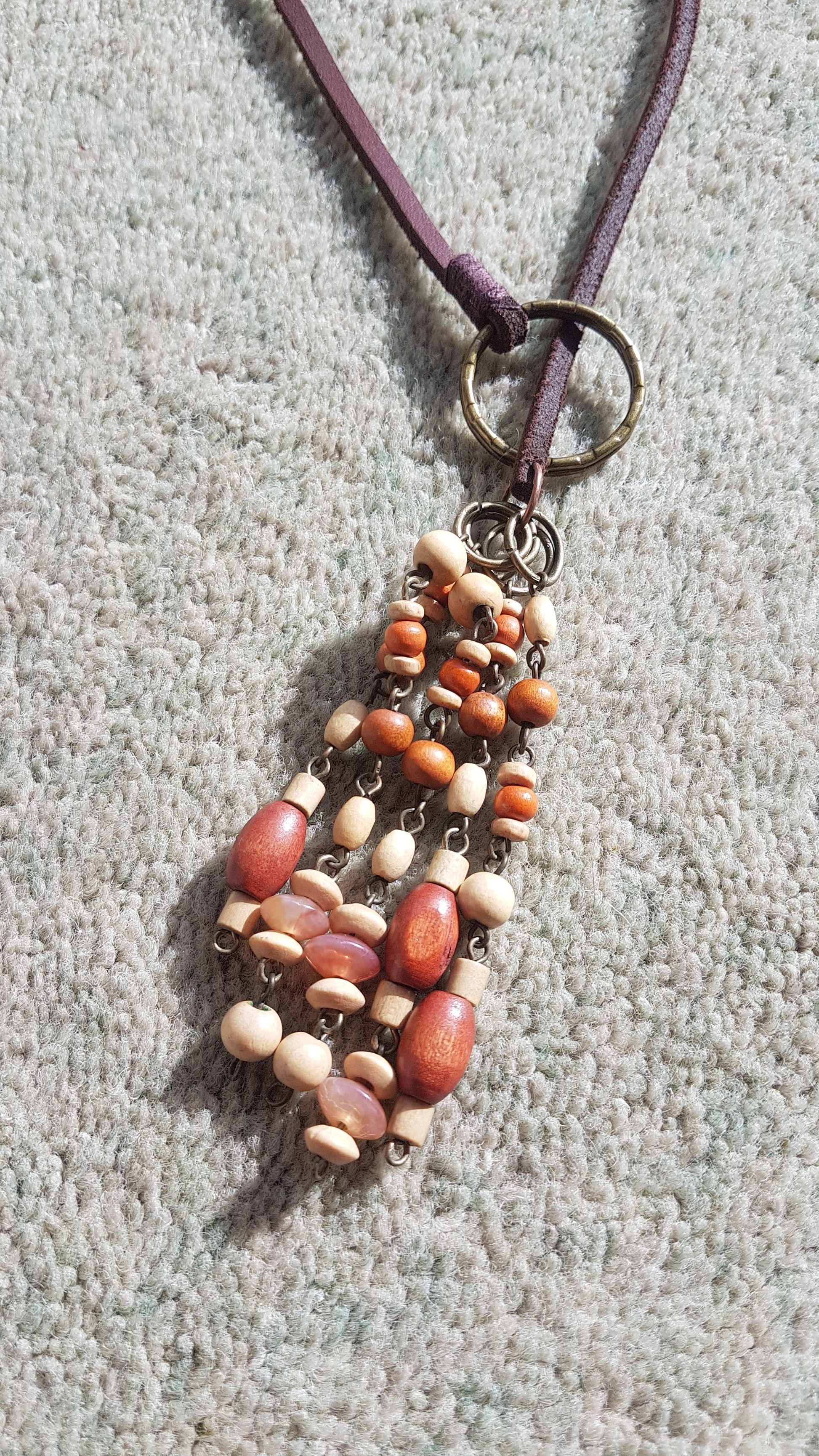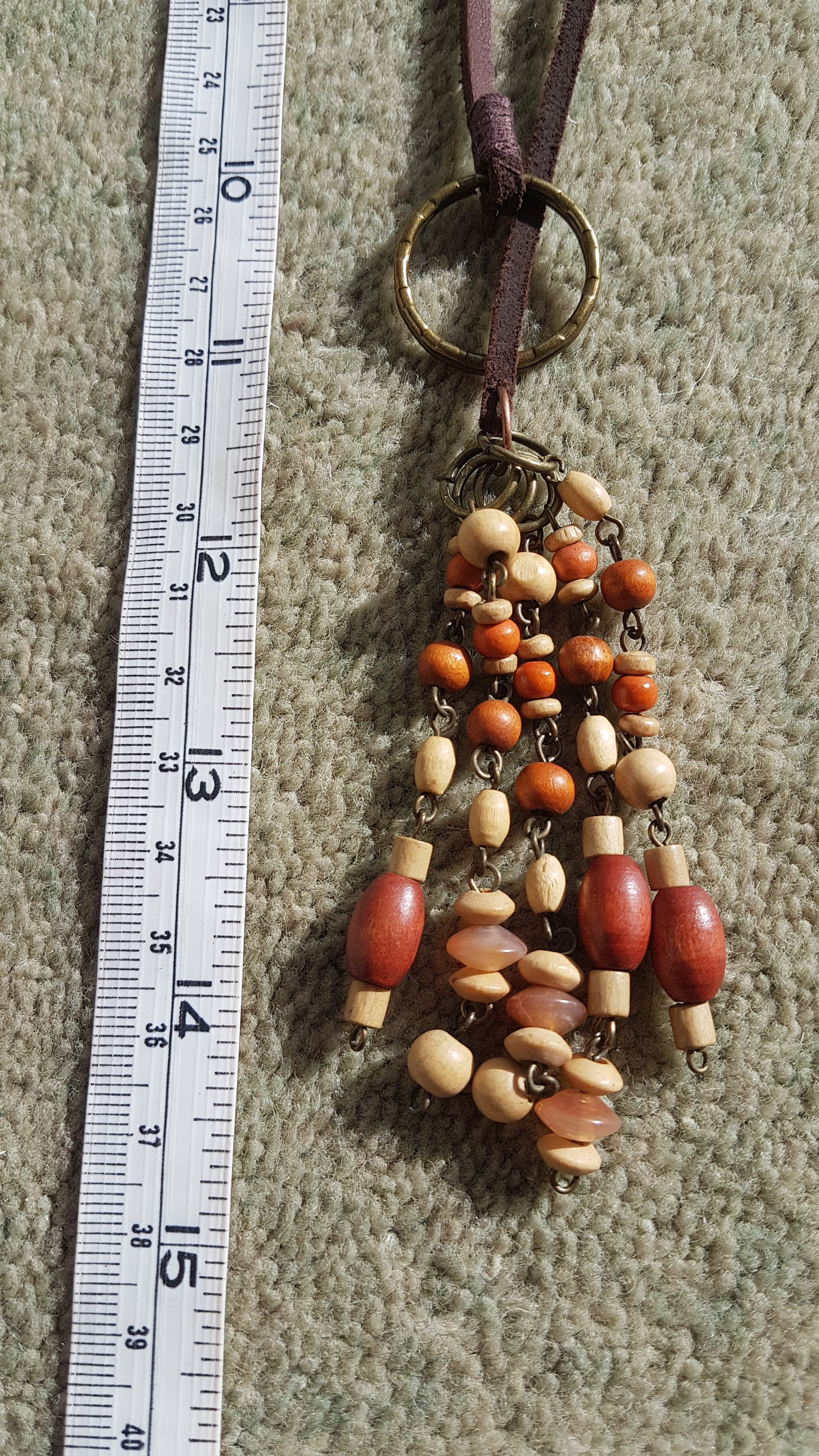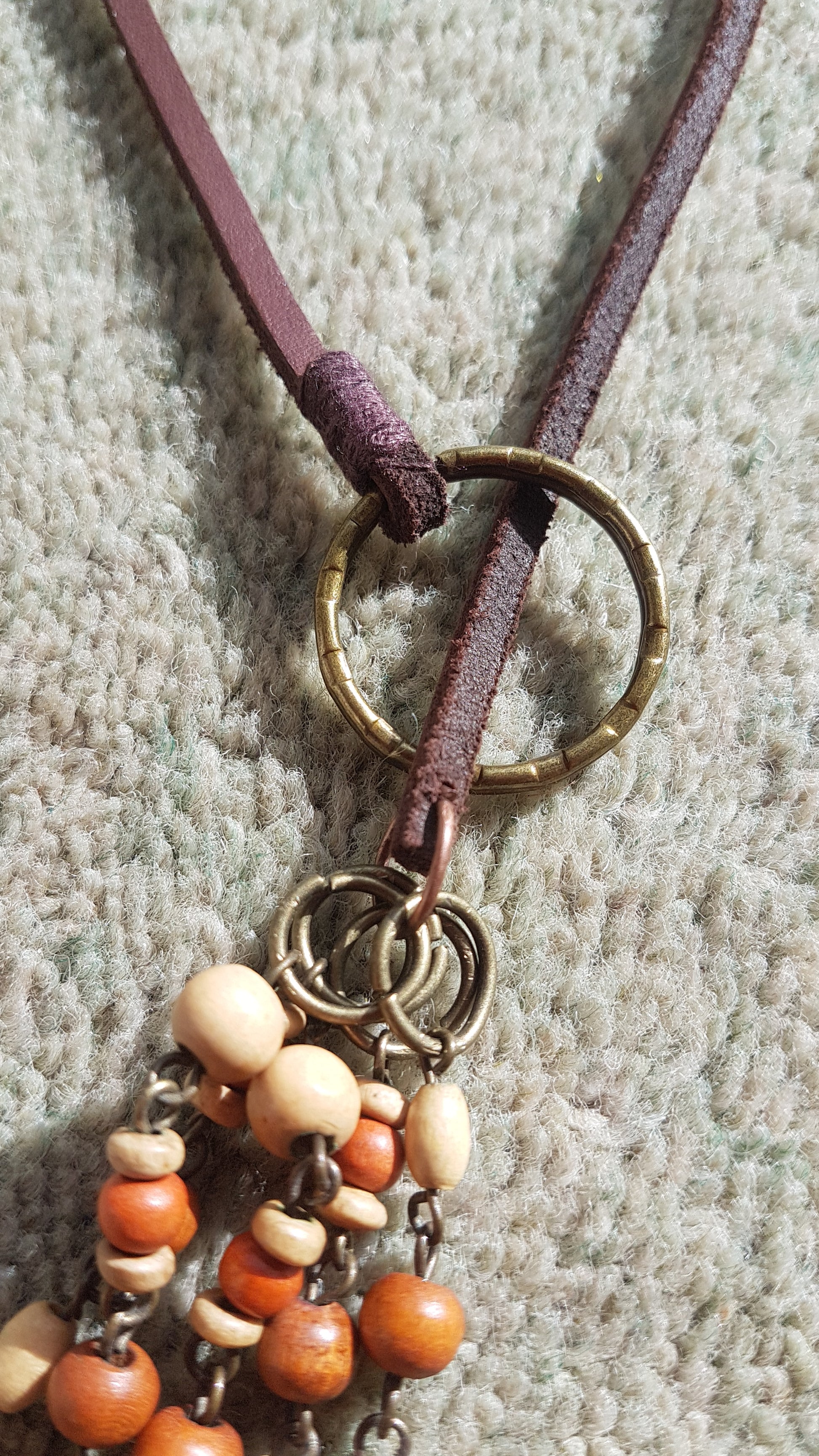 This necklace is made from a leather strand, metal hoop and wooden beads. It has a full length of approx 29 inches.