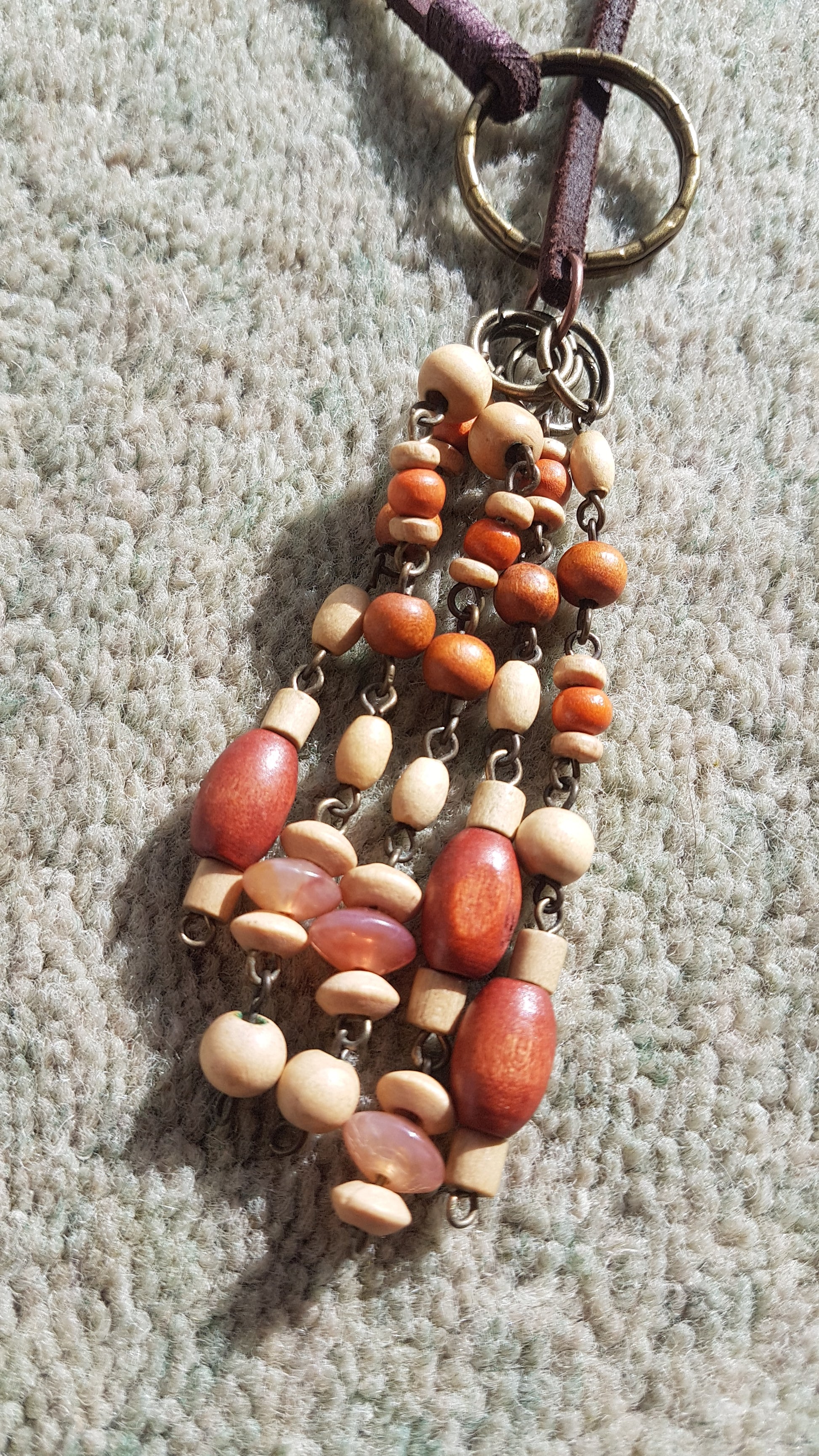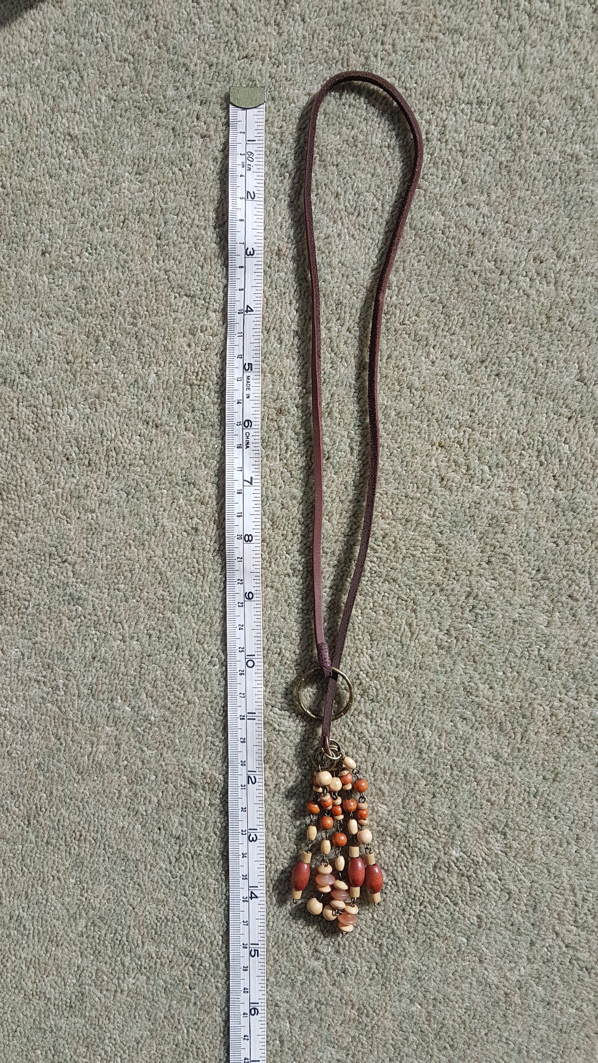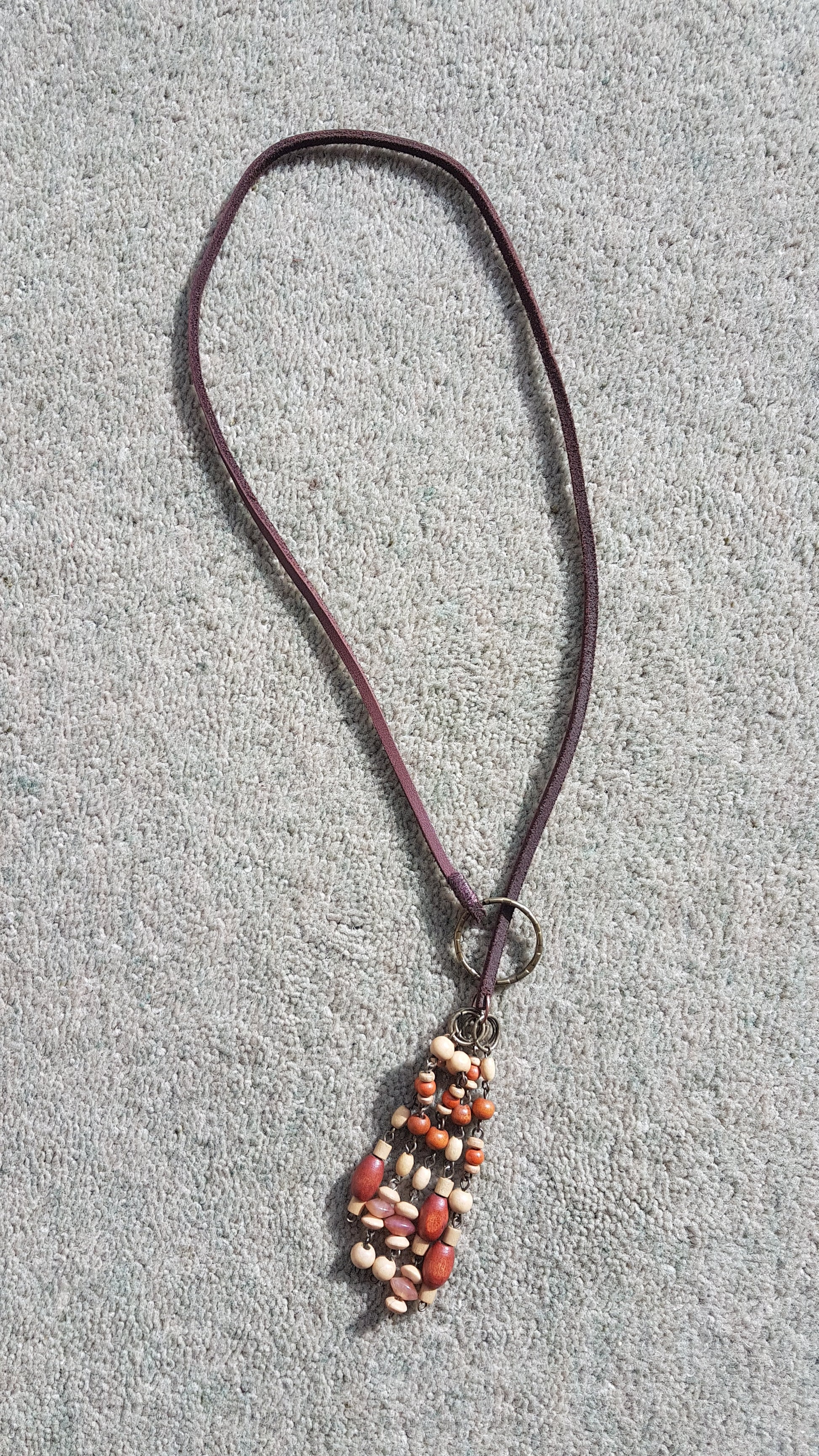 This necklace is made from a leather strand, metal hoop and wooden beads. It has a full length of approx 29 inches.