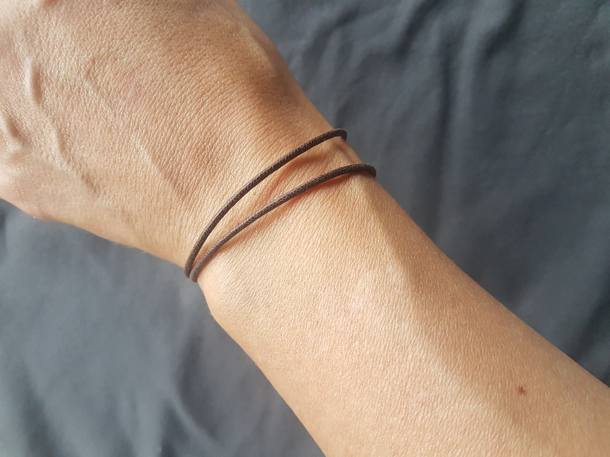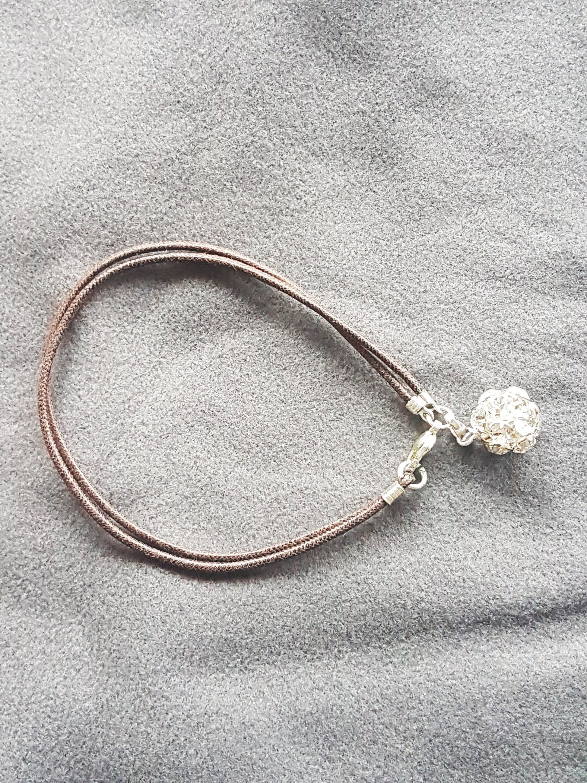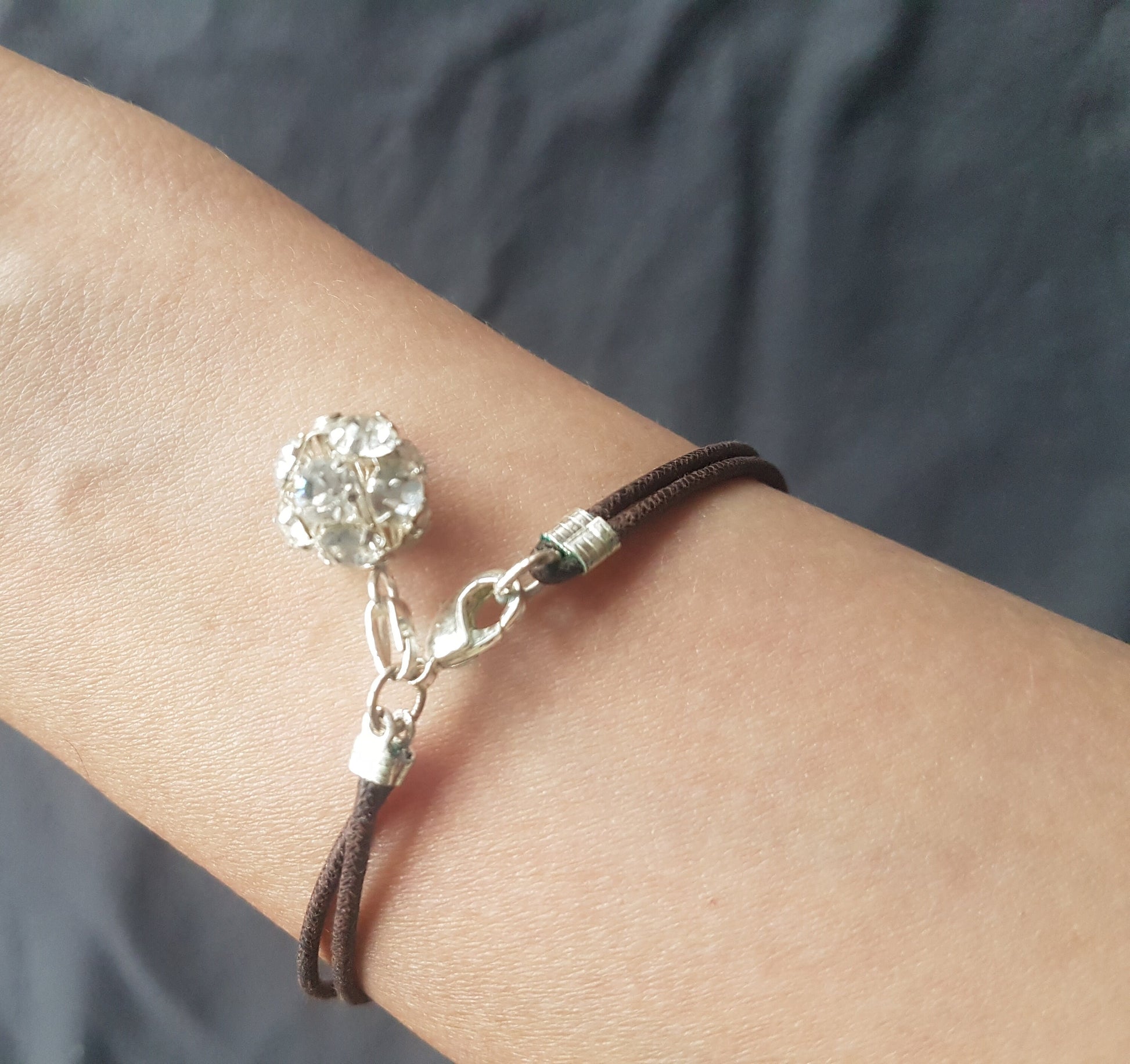This one is 8.5 inches long including the hook and eye clasp. It is made from 2 strands of leather or faux leather and has a diamante ball charm on it.