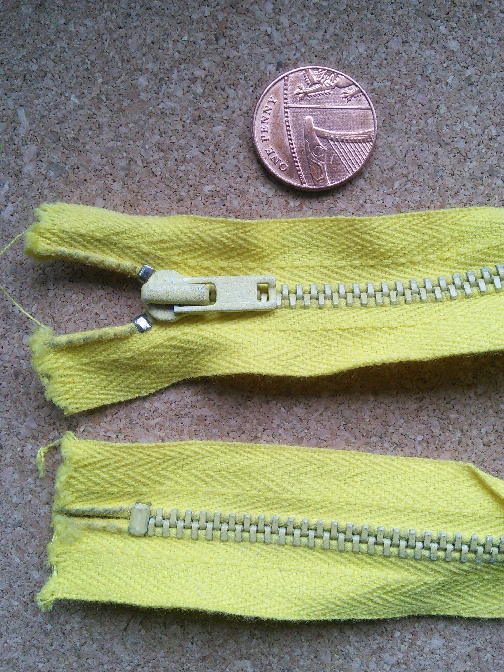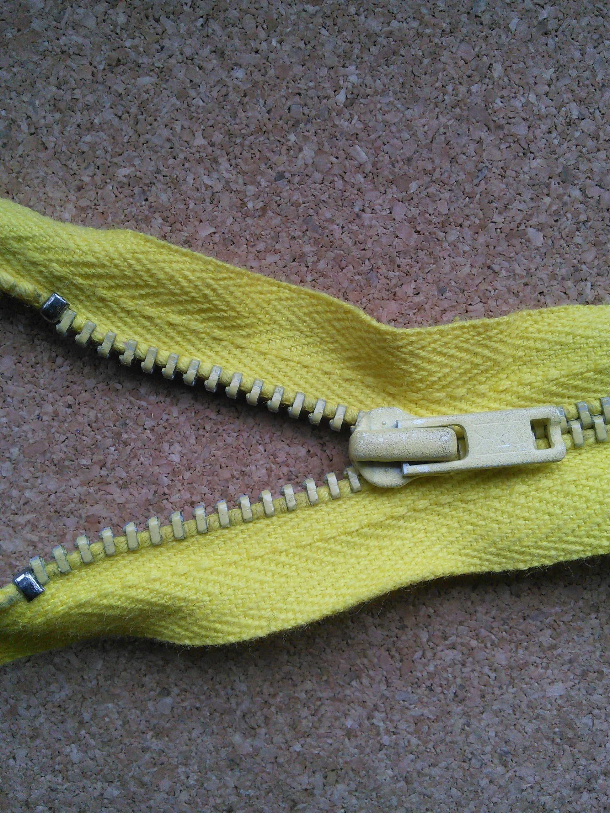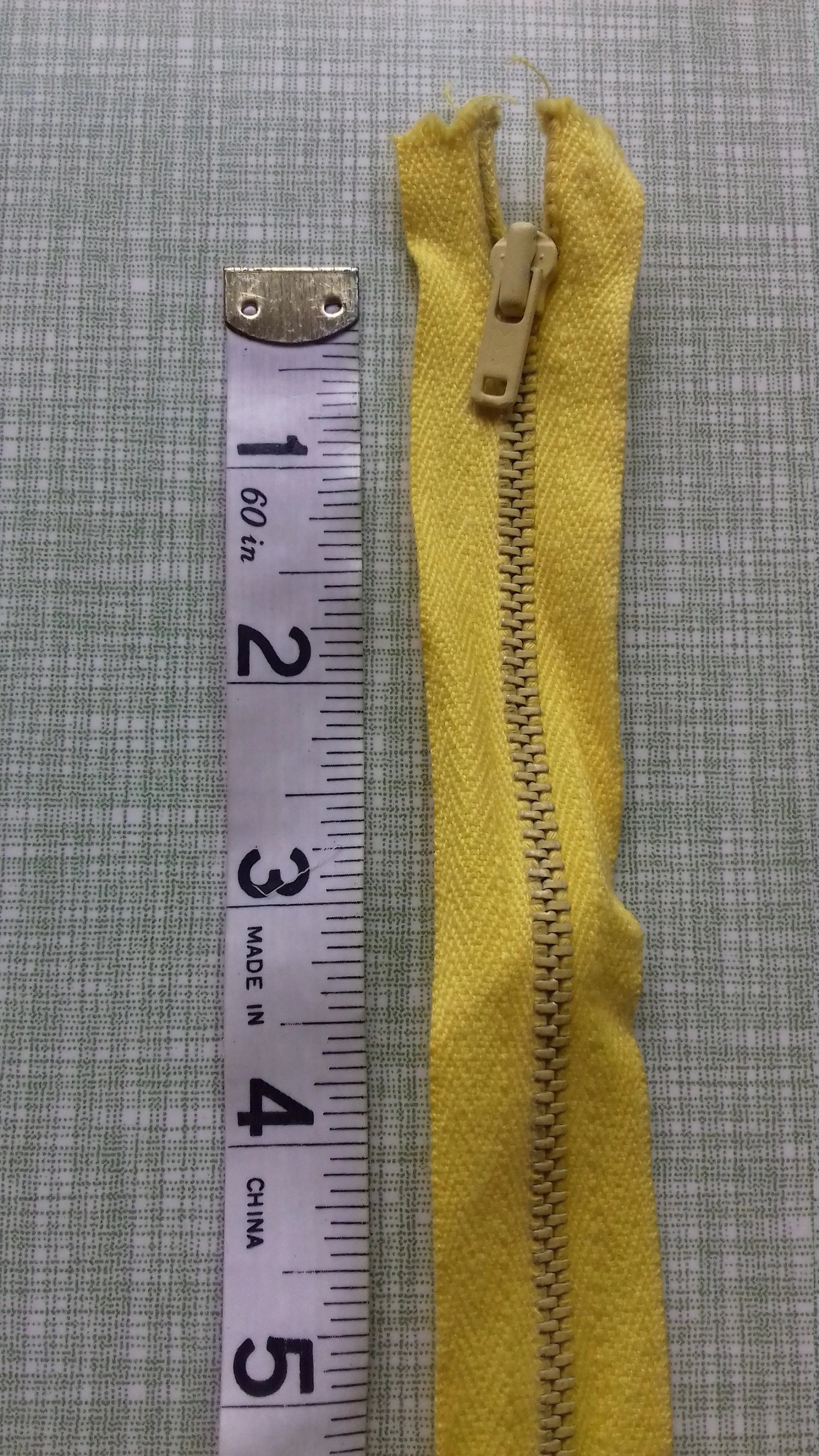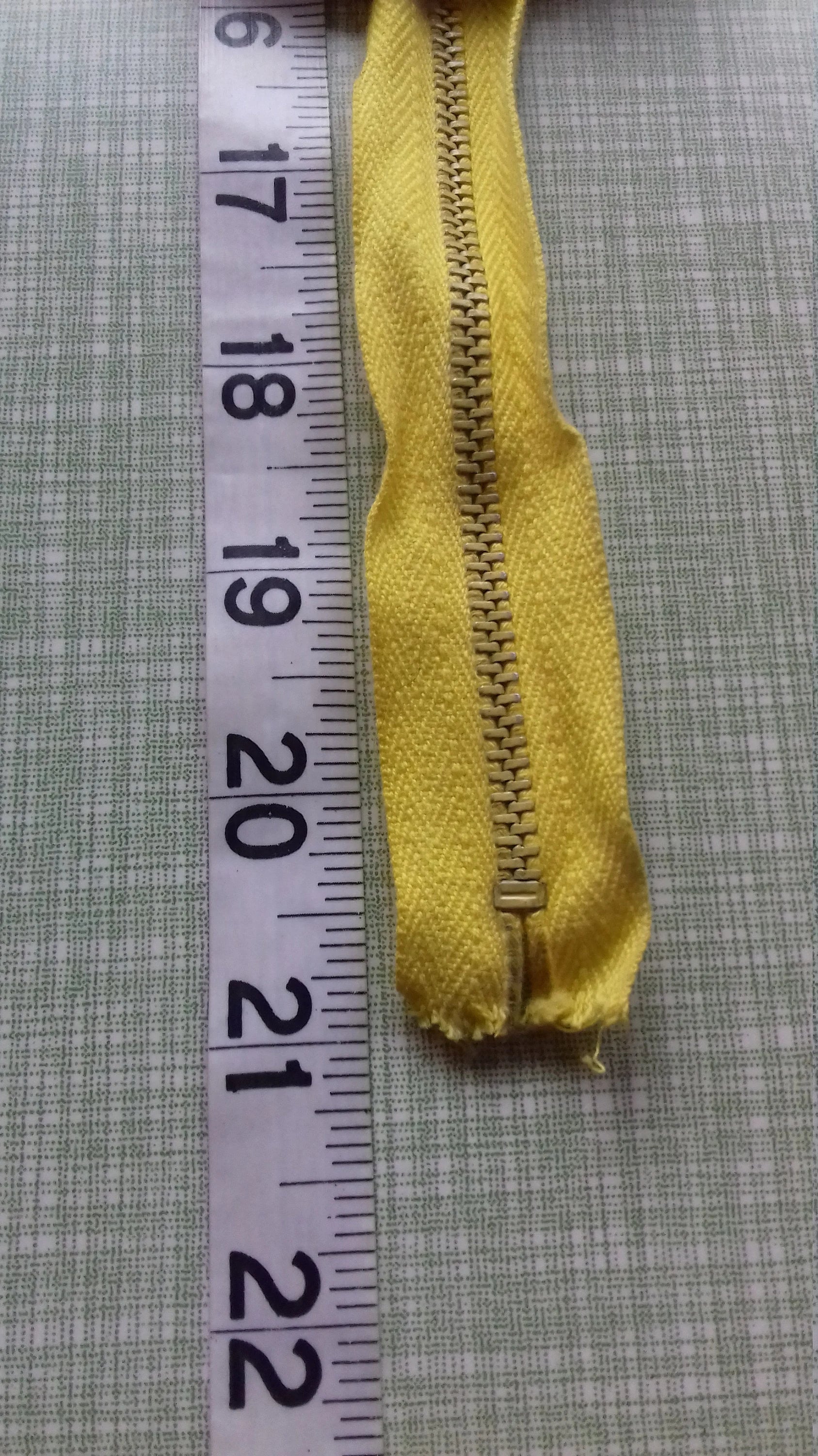 These zips are new old vintage stock that have been sitting in boxes for years after a shop closed. This one is bright yellow, 20.5 inches (zip part only), with metal teeth and a metal zipper.