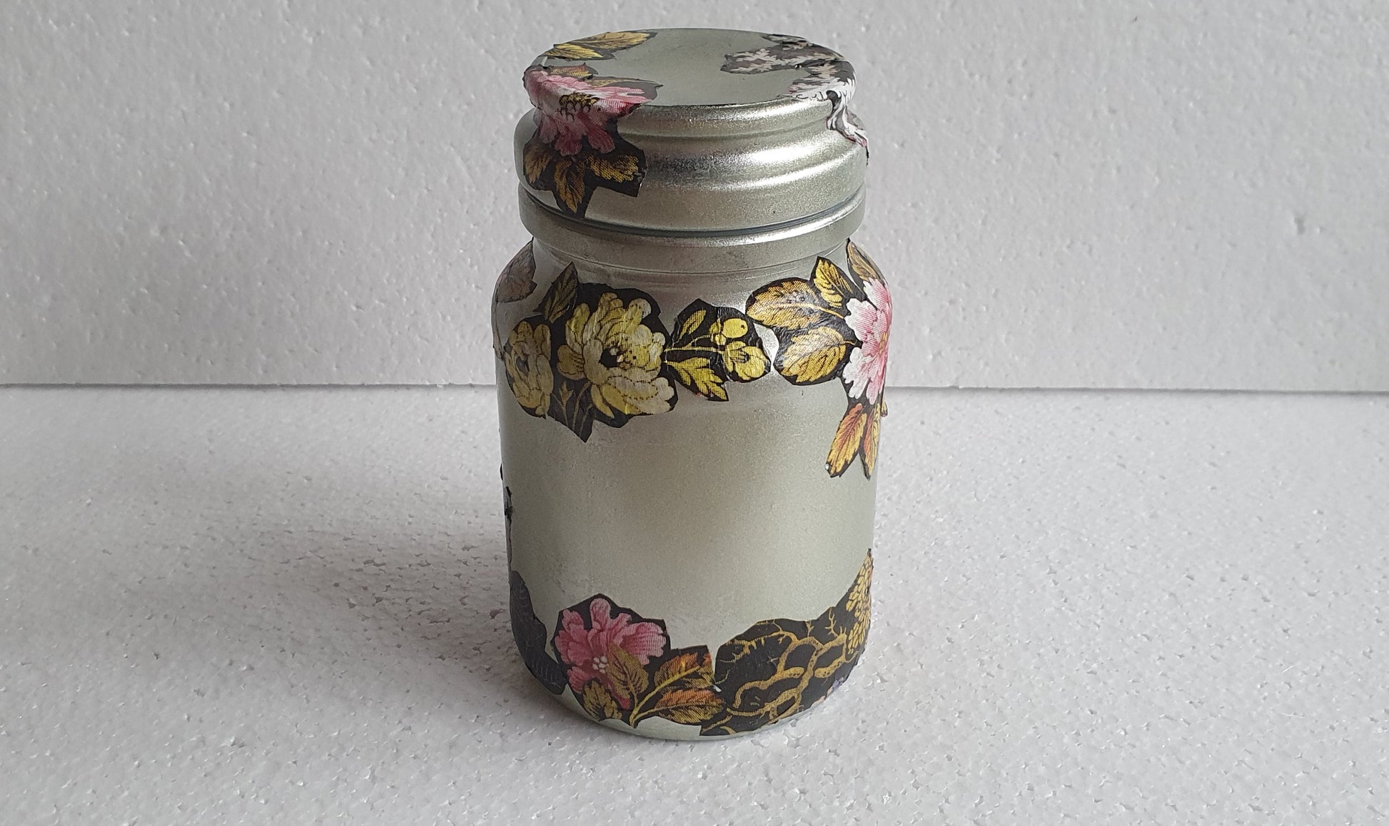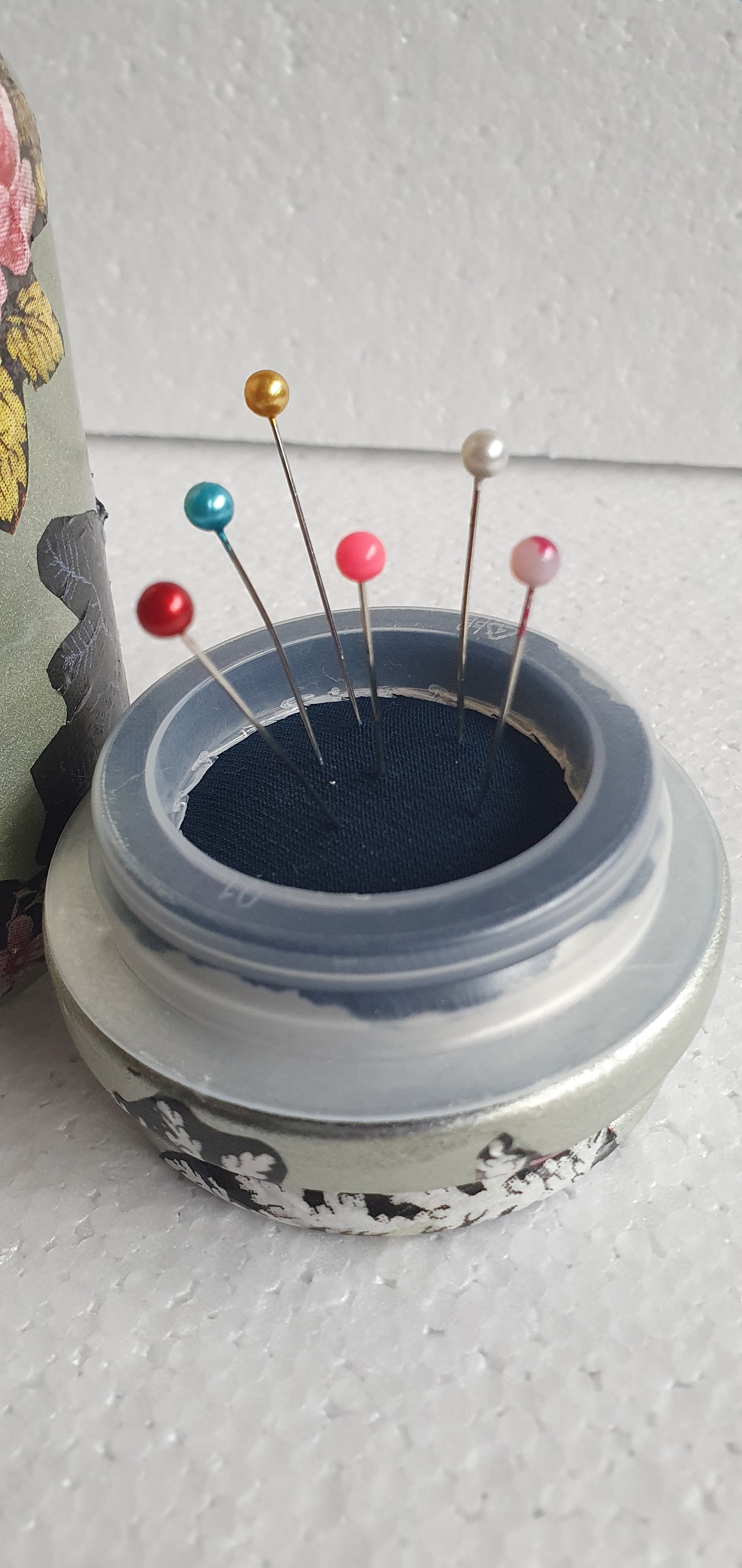 This glass jar has been turned into a pin cushion storage jar and pin cushion, and hand decorated by me in my studio. Each one is a unique design and size and cannot be repeated.