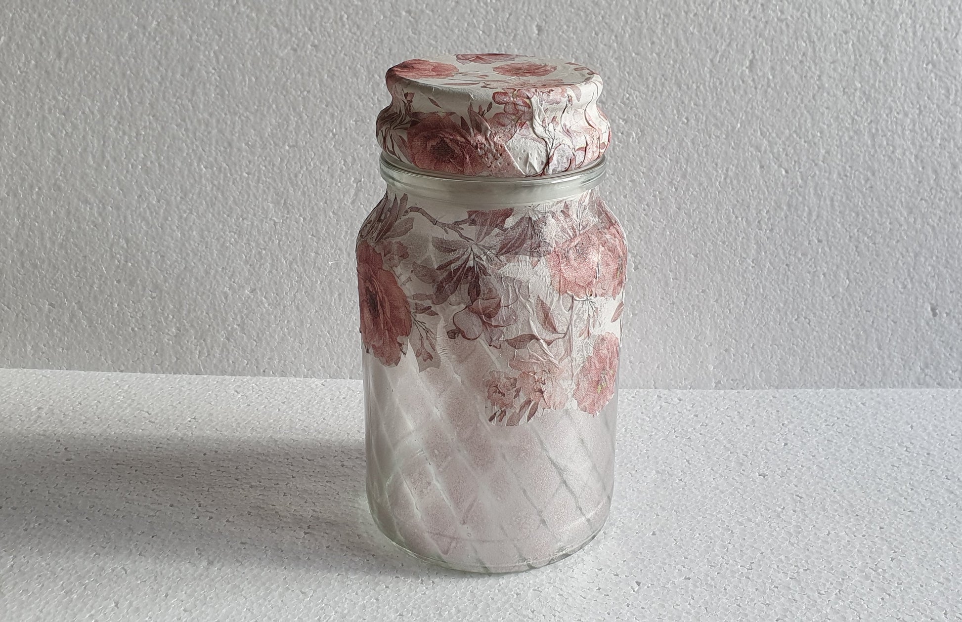 This glass jar has been turned into a pin cushion storage jar and pin cushion, and hand decorated by me in my studio. Each one is a unique design and size and cannot be repeated.