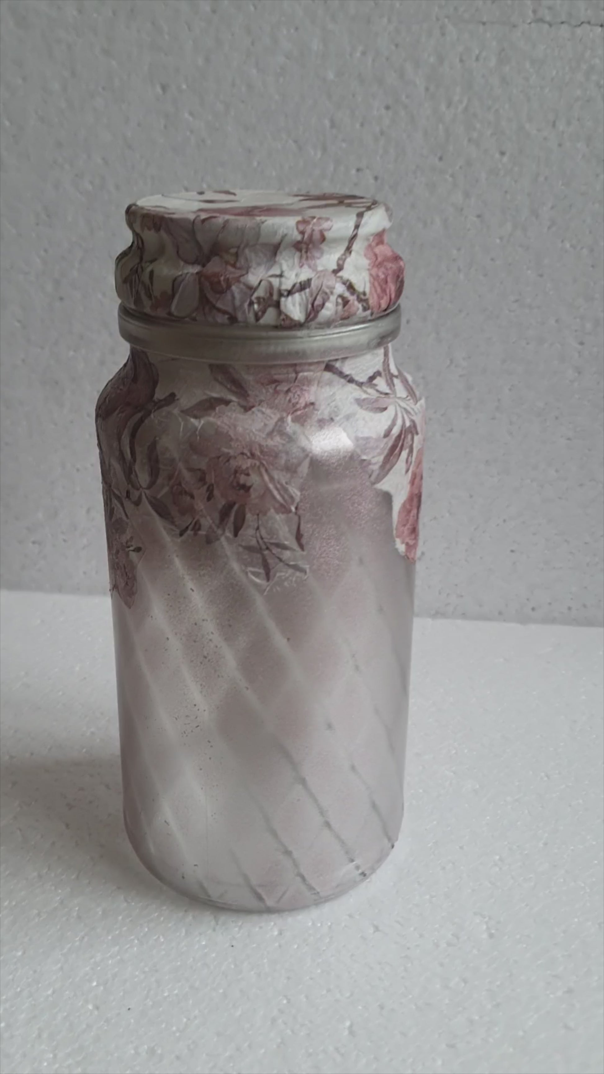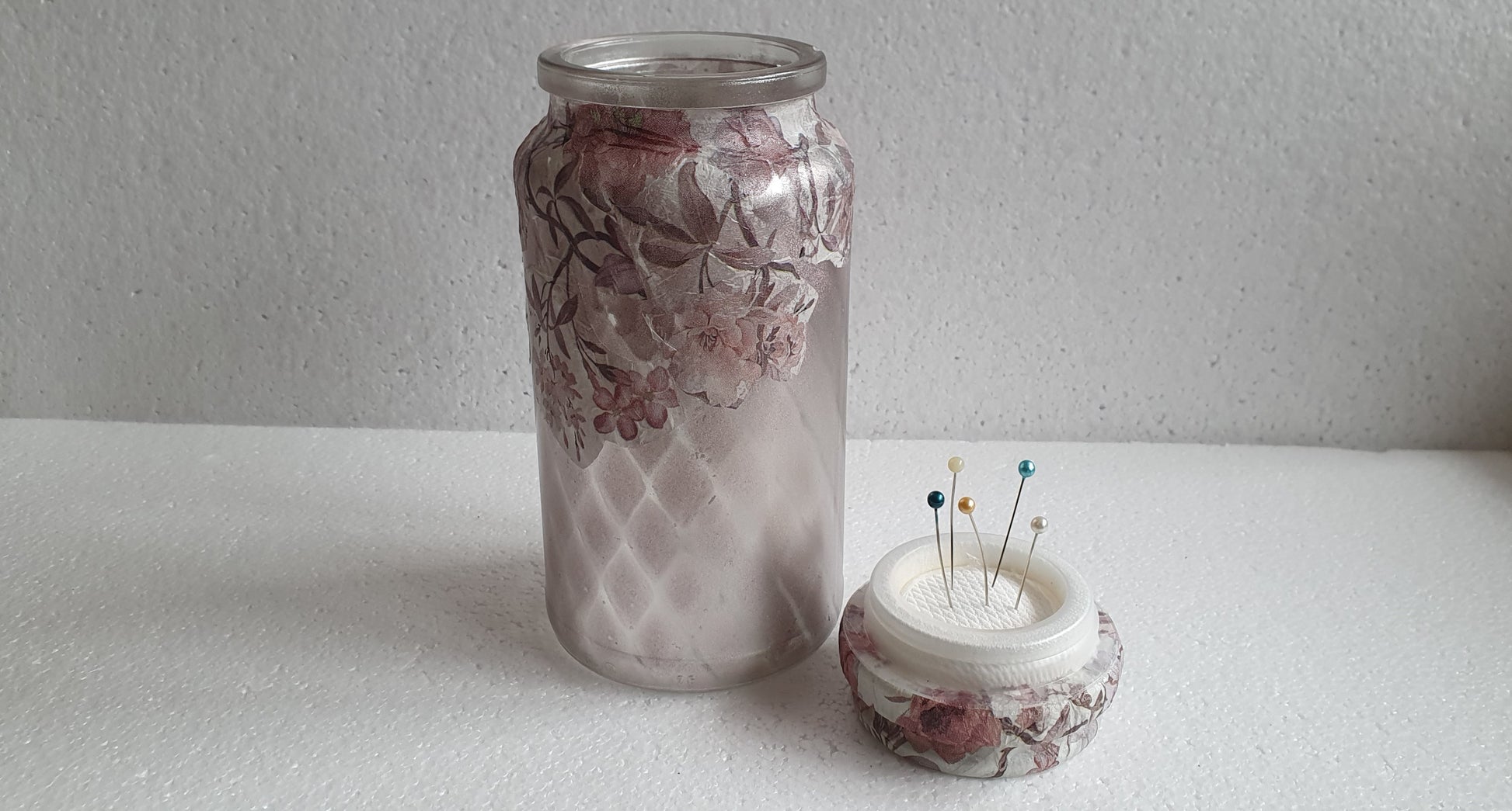 This glass jar has been turned into a pin cushion storage jar and pin cushion, and hand decorated by me in my studio. Each one is a unique design and size and cannot be repeated.