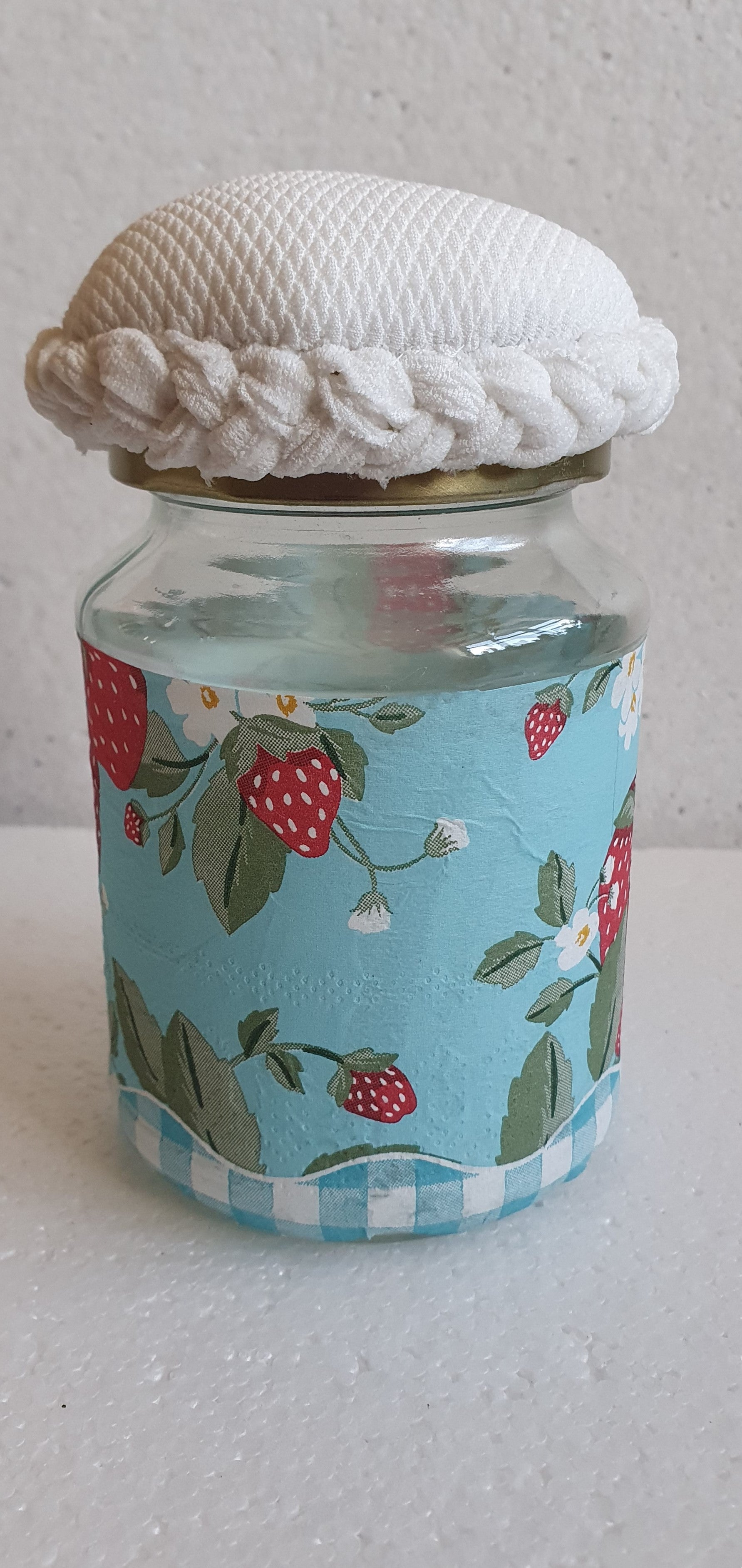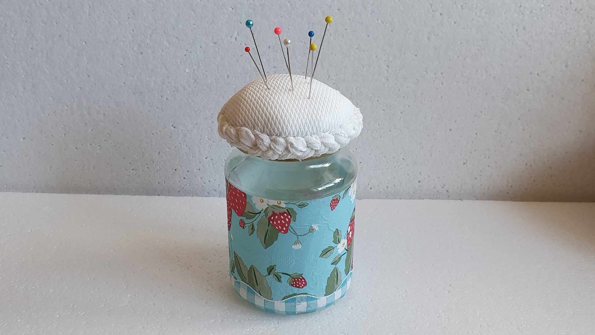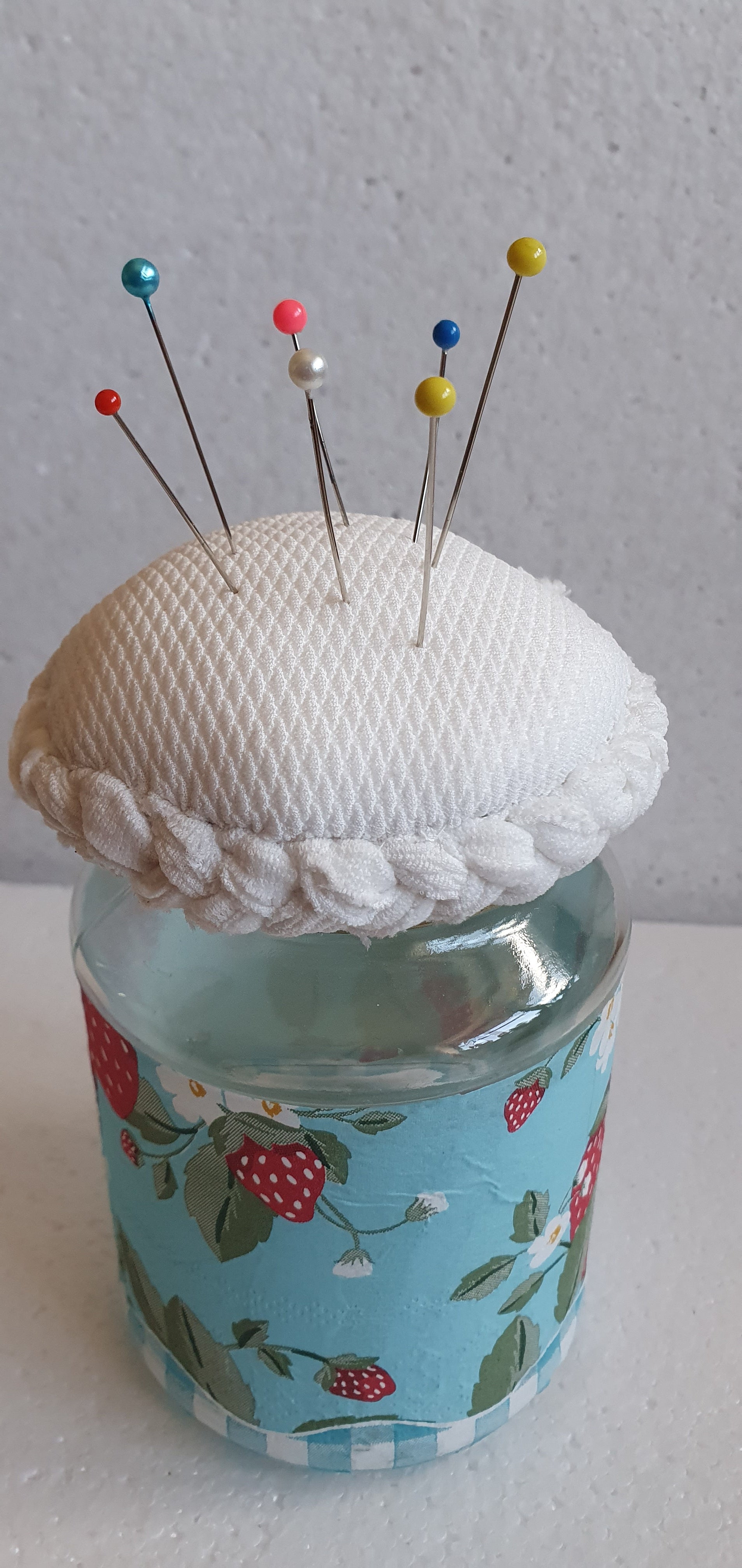 This glass jar has been turned into a pin cushion storage jar and pin cushion, and hand decorated by me in my studio. Each one is a unique design and size and cannot be repeated.