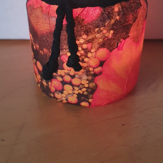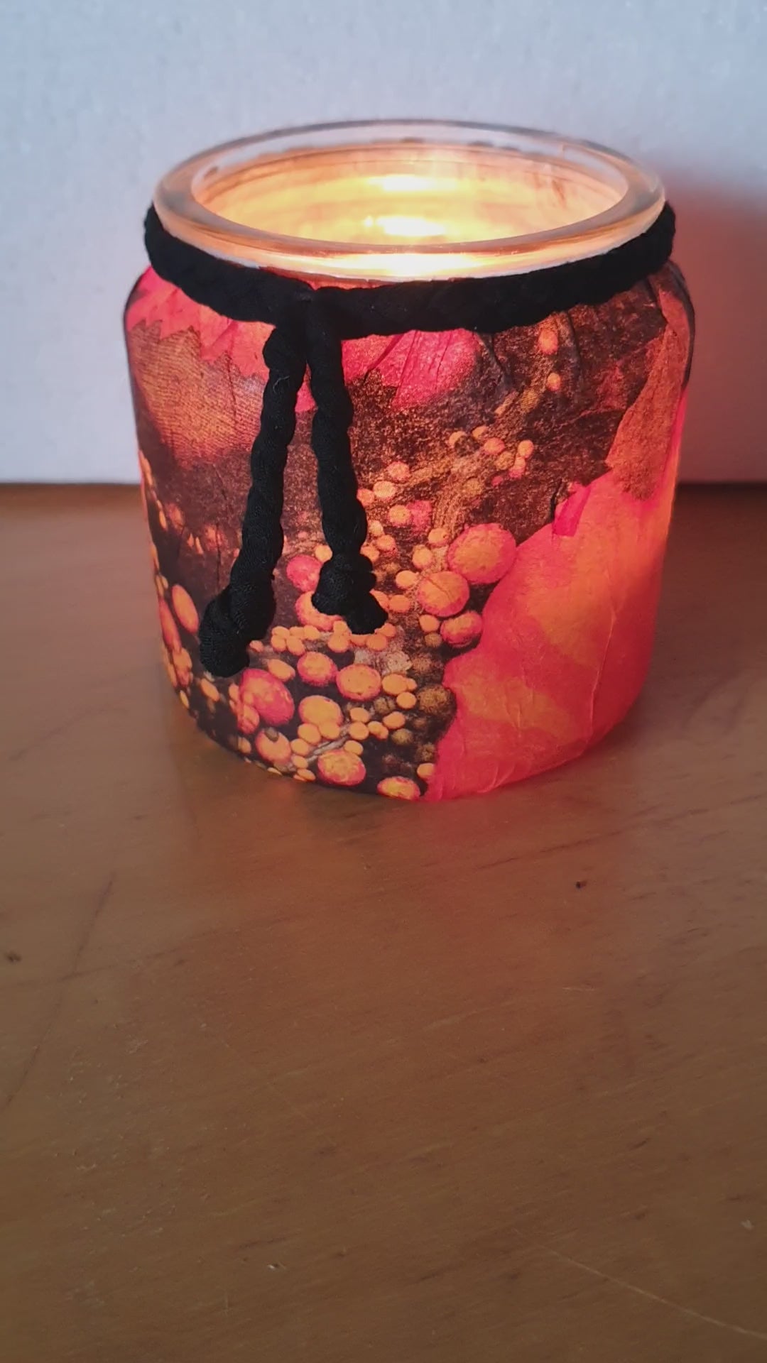 This glass candle jar has been hand decorated by me in my studio using paper designs on reclaimed glass. Each one is a unique design and size and cannot be repeated. The neck has been finished with my signature braid which you can find on my braided coasters.