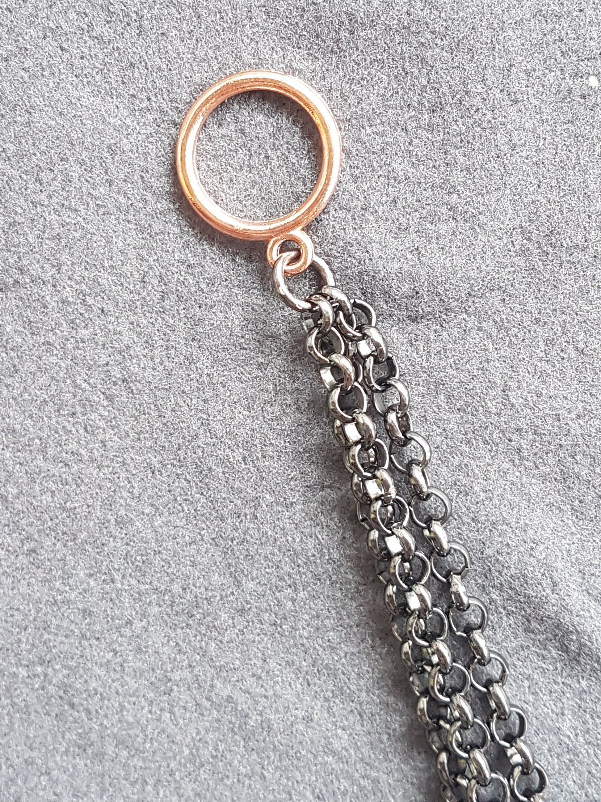 This one is 6.75 inches long including the toggle clasp. It is made from 3 strands of gun metal grey chain and fastens with a feature rose gold toggle.