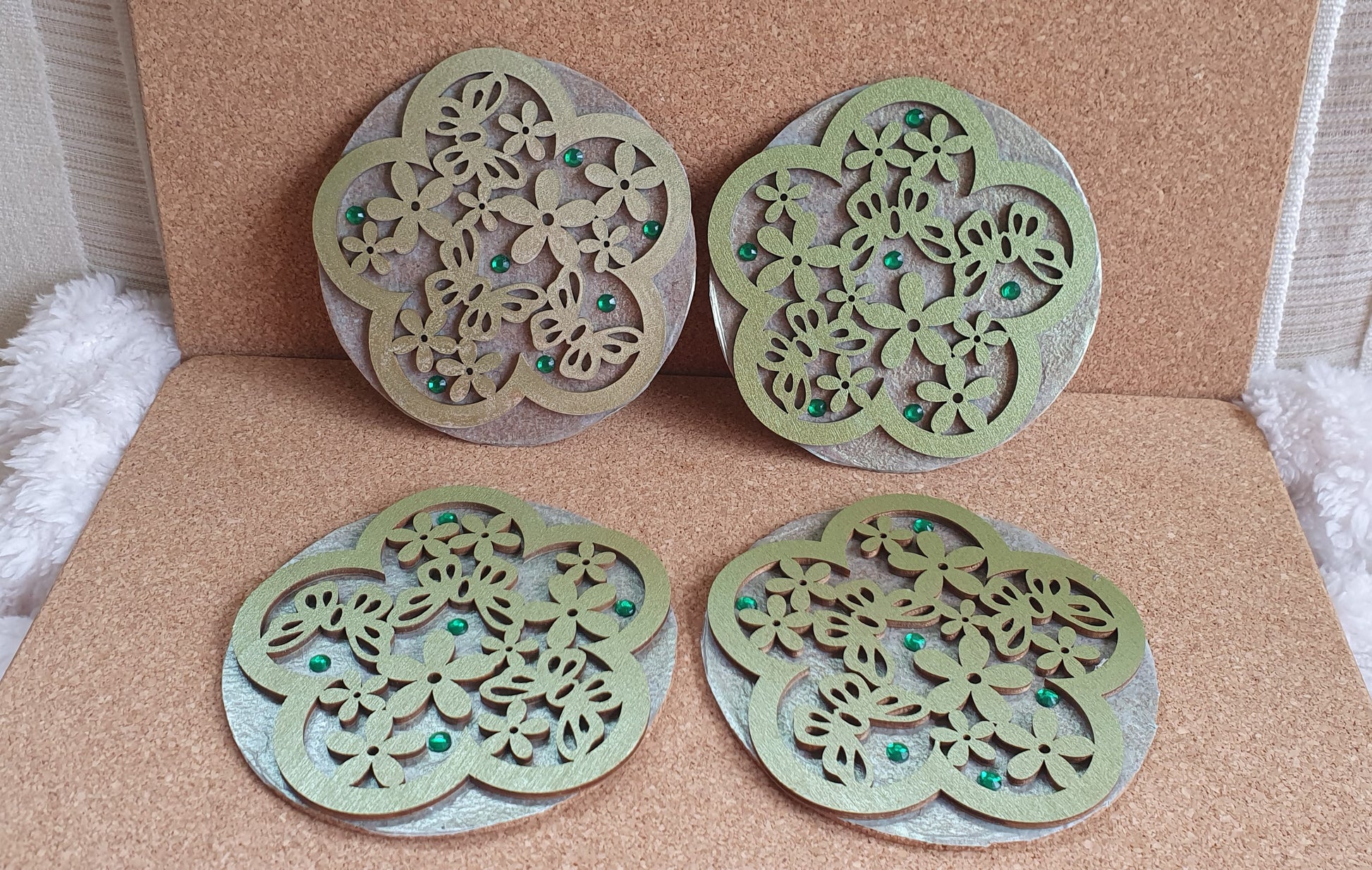 Metallic Green Round Coasters Flowers Butterflies Set Of Four Home Decor Gift