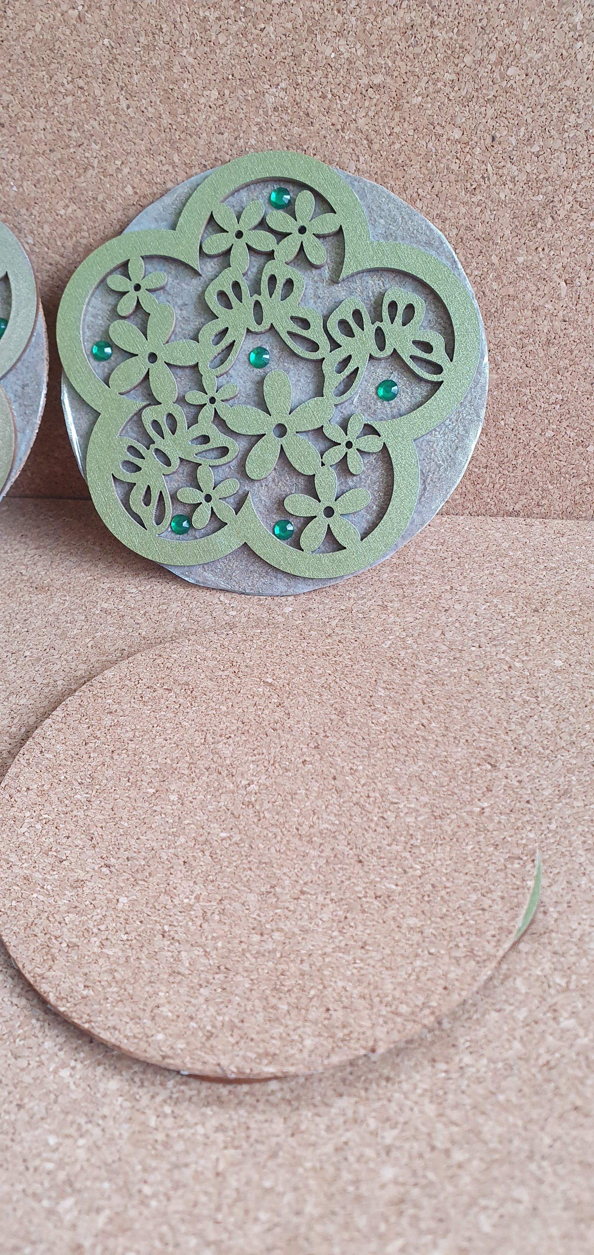 This set of four coasters have been hand decorated by me using a wooden design on a cork coaster backing in my studio, decorated with metallic green paint and then varnish sealed. They are a unique design and size and cannot be repeated.