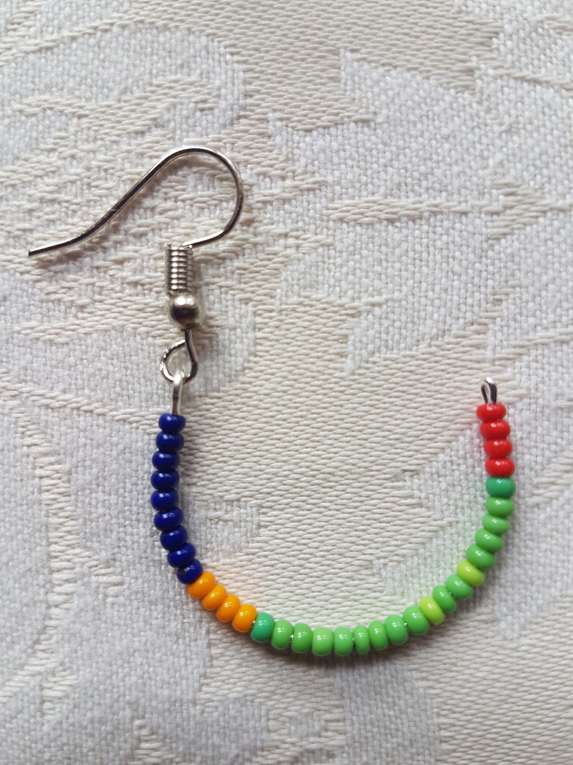 This pair have a length approx 2 inches and comprise a silver effect earring with tiny multicoloured seed beads on a crescent shaped base.