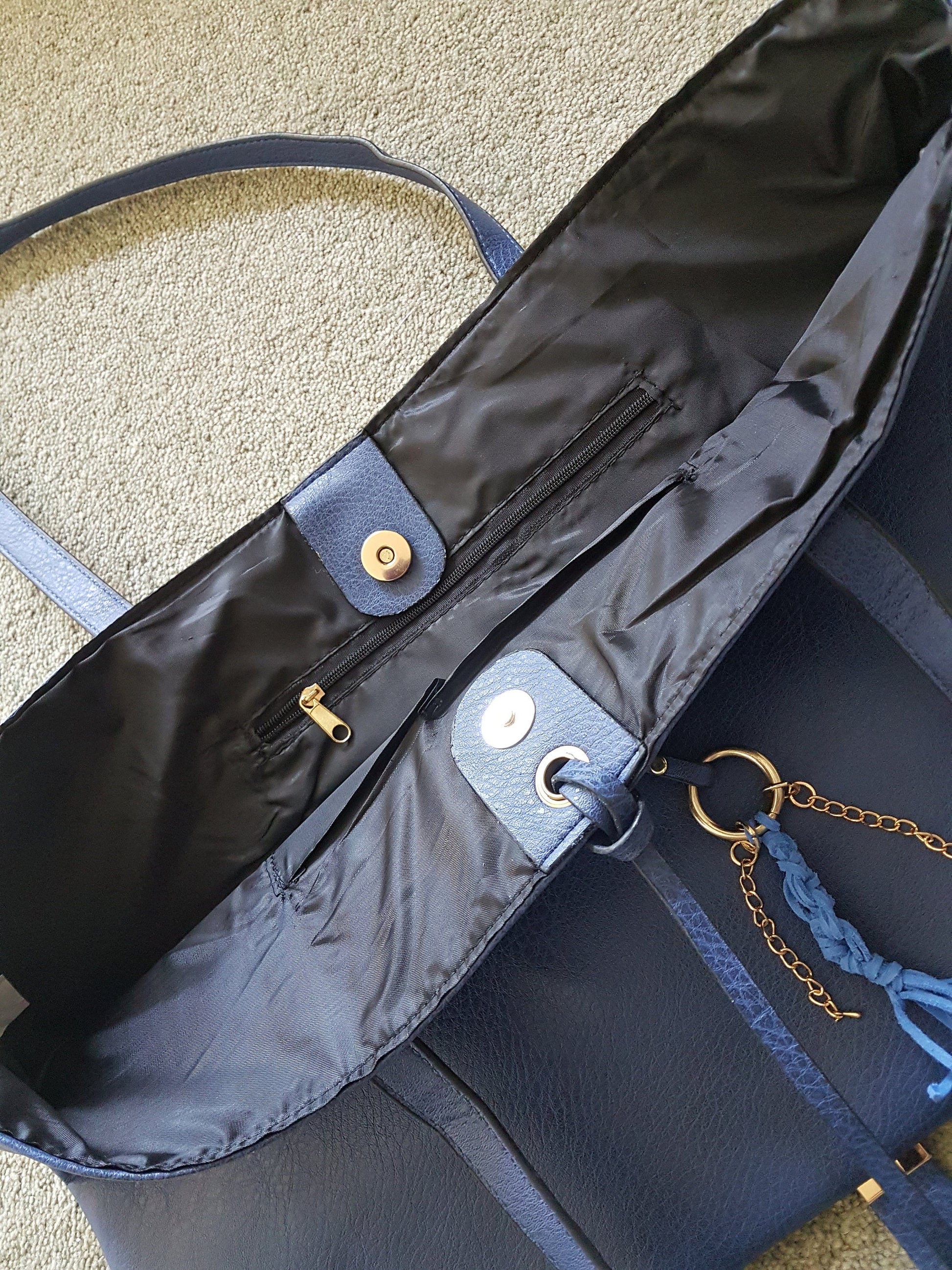 It has a zip section and two pockets inside and the main bag fastens with a gold popper. The bag measures a generous 11 inches deep, 17.5 inches wide and has a width of 5.5 inches so plenty of room for your day-to-day items. The straps are 23 inches long. This would make a great holiday beach bag.
