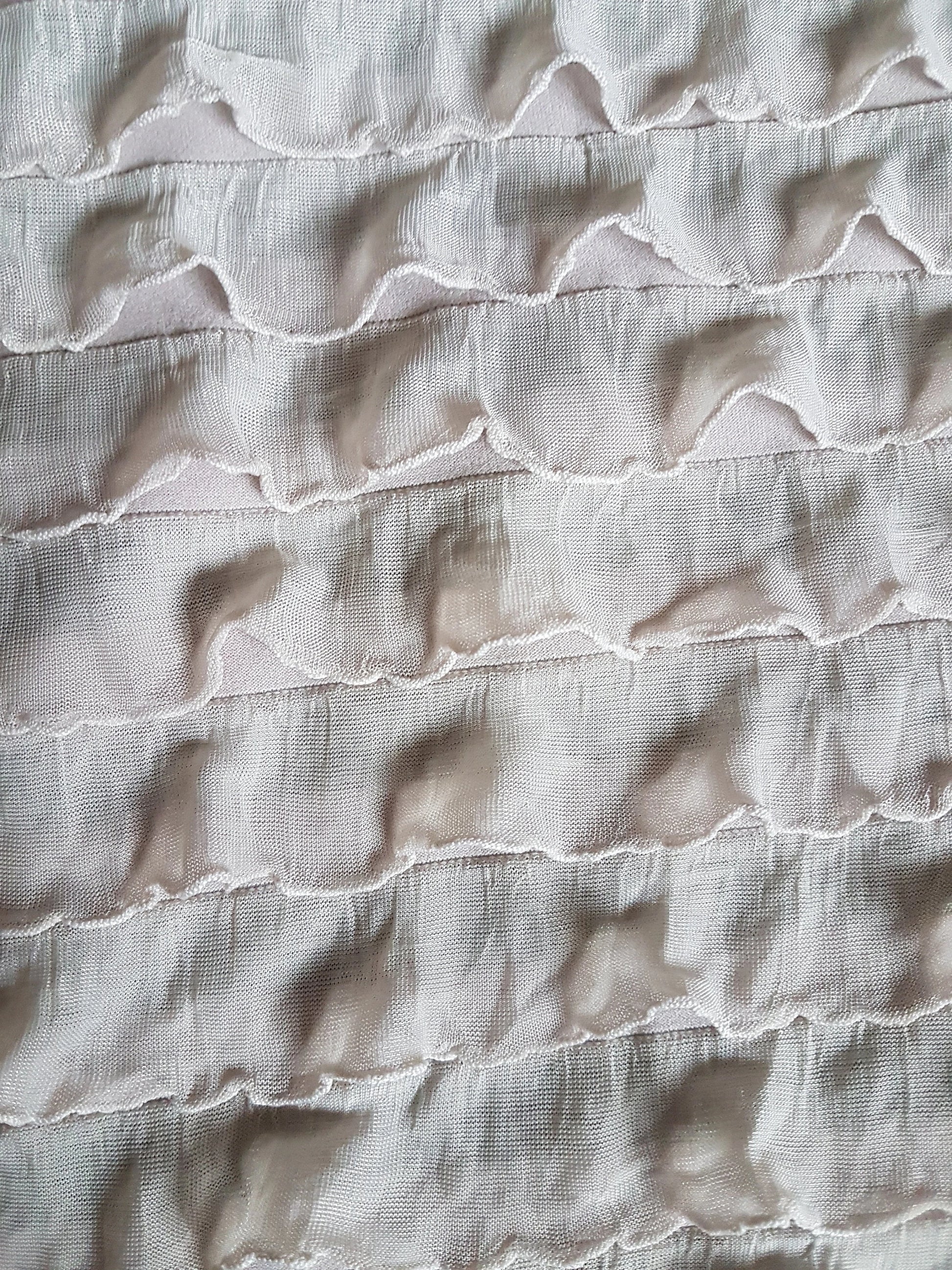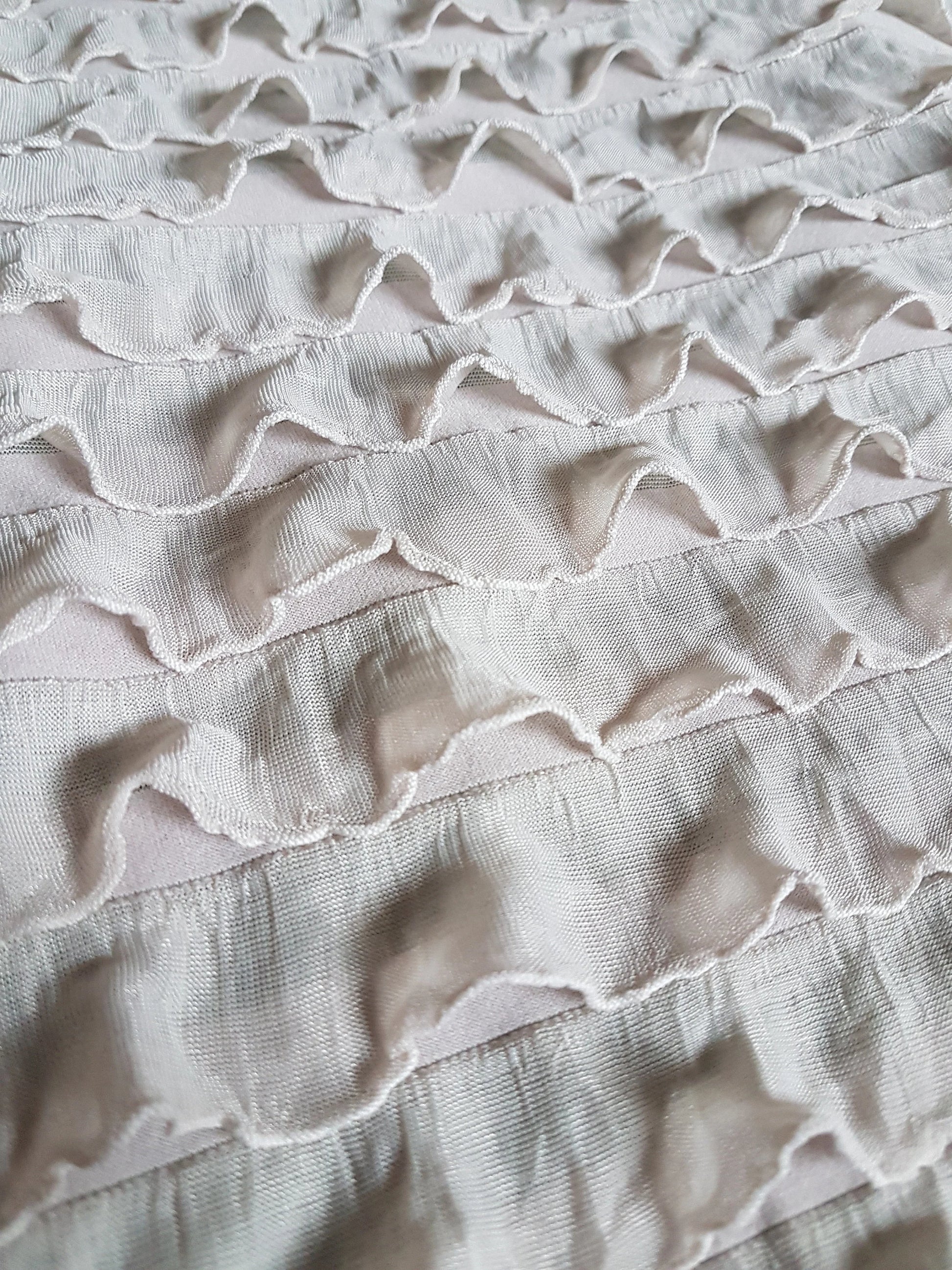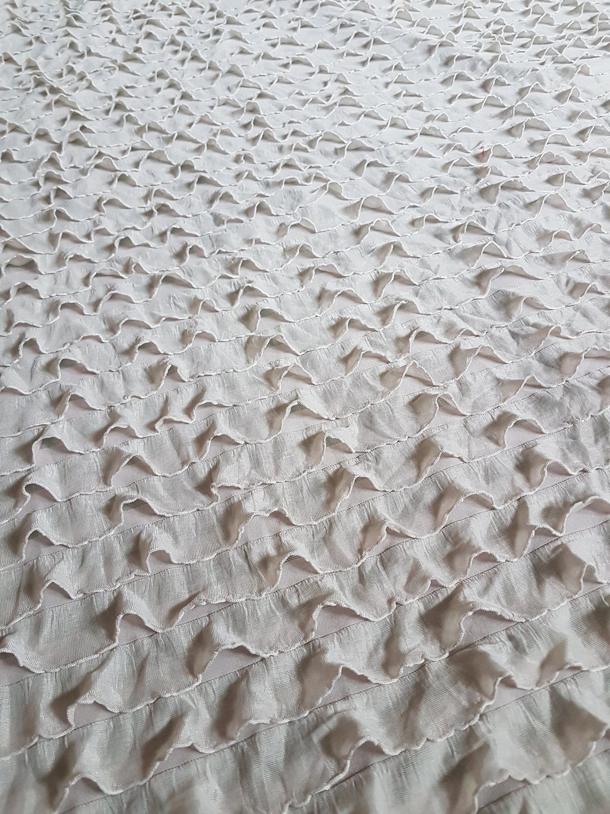 This is a fabulous nude flesh beige coloured knit fabric covered in frills. I have used it to make several full length dresses and it's a gorgeous light weight fabric, ideal for dressmaking, crafting and all sorts of other projects.