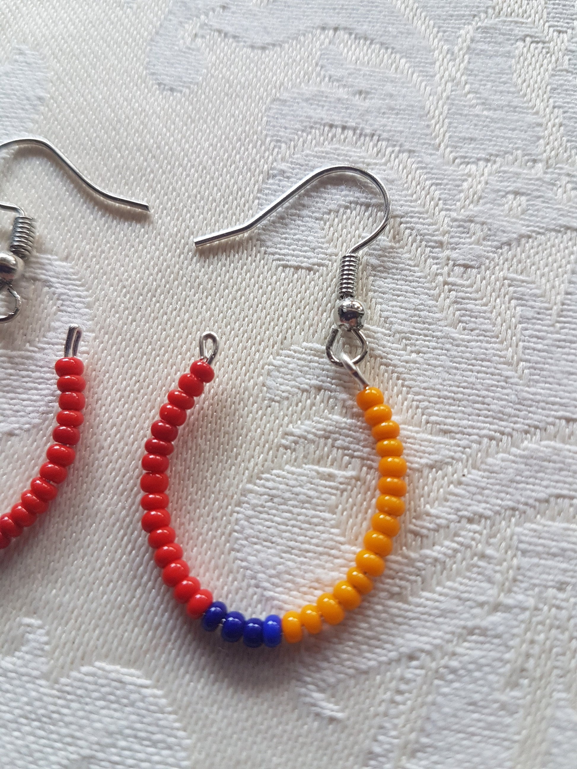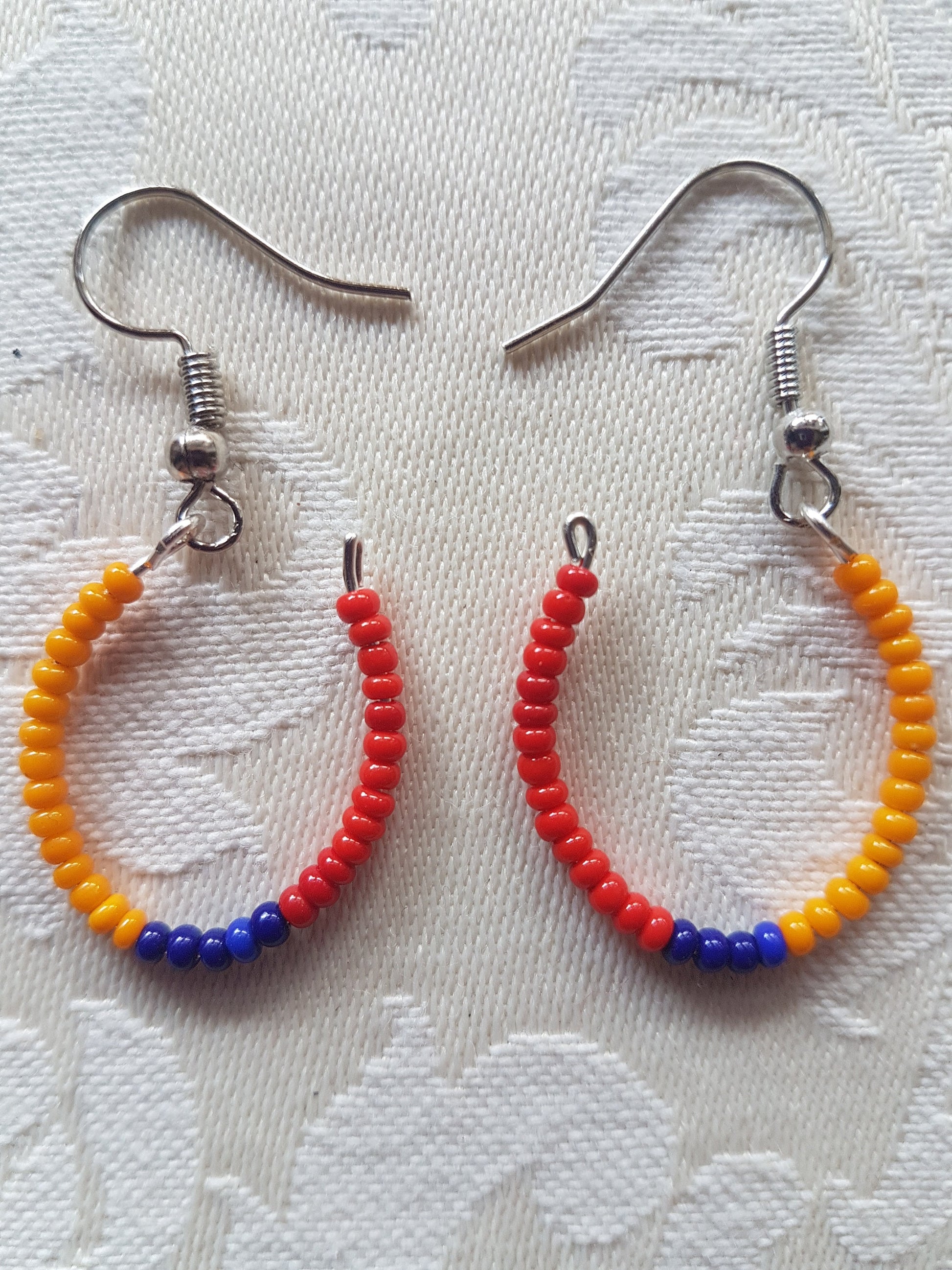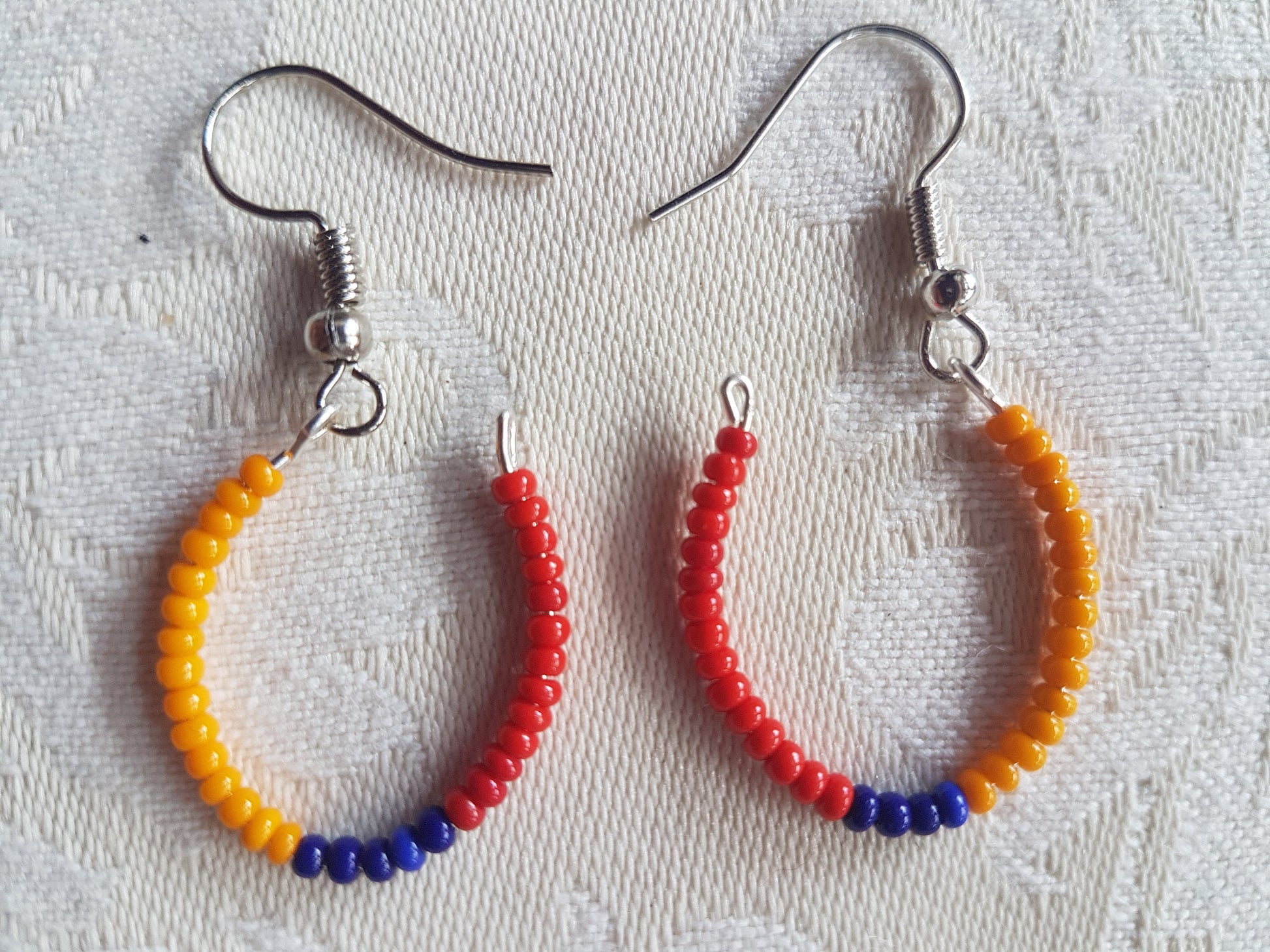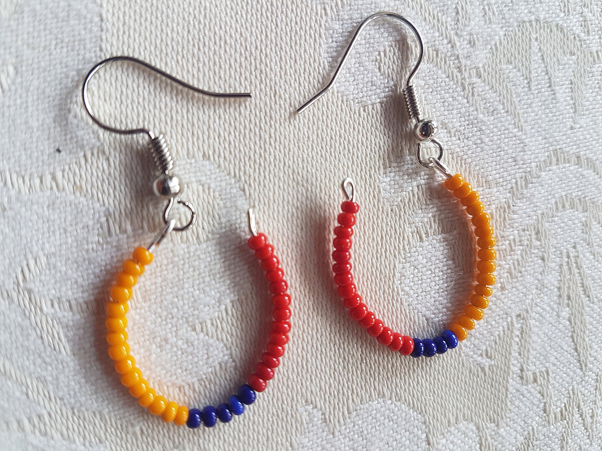 This pair have a length approx 1.5 inches and comprise a silver effect earring with tiny orange, blue and red seed beads on a hoop shaped base.