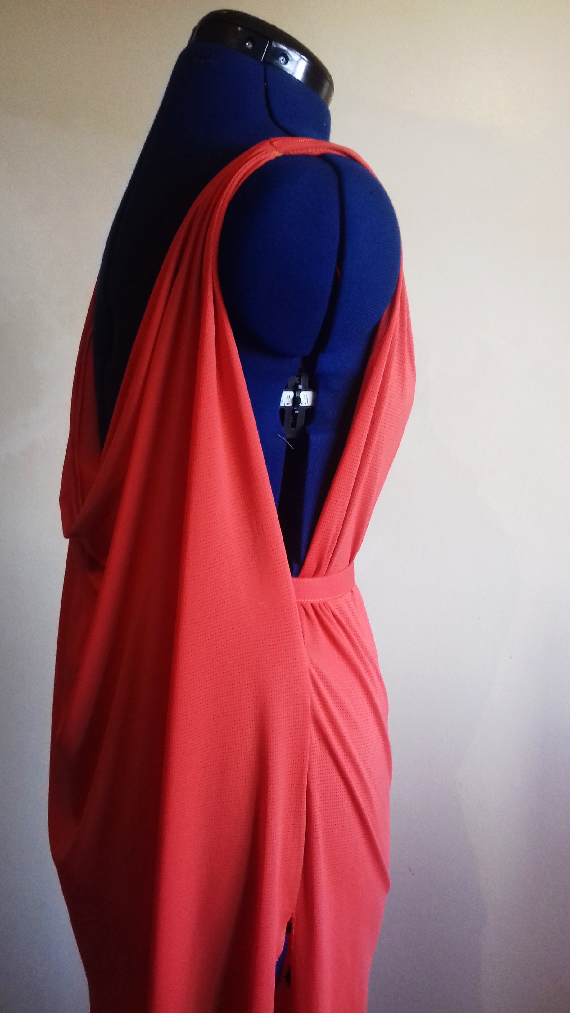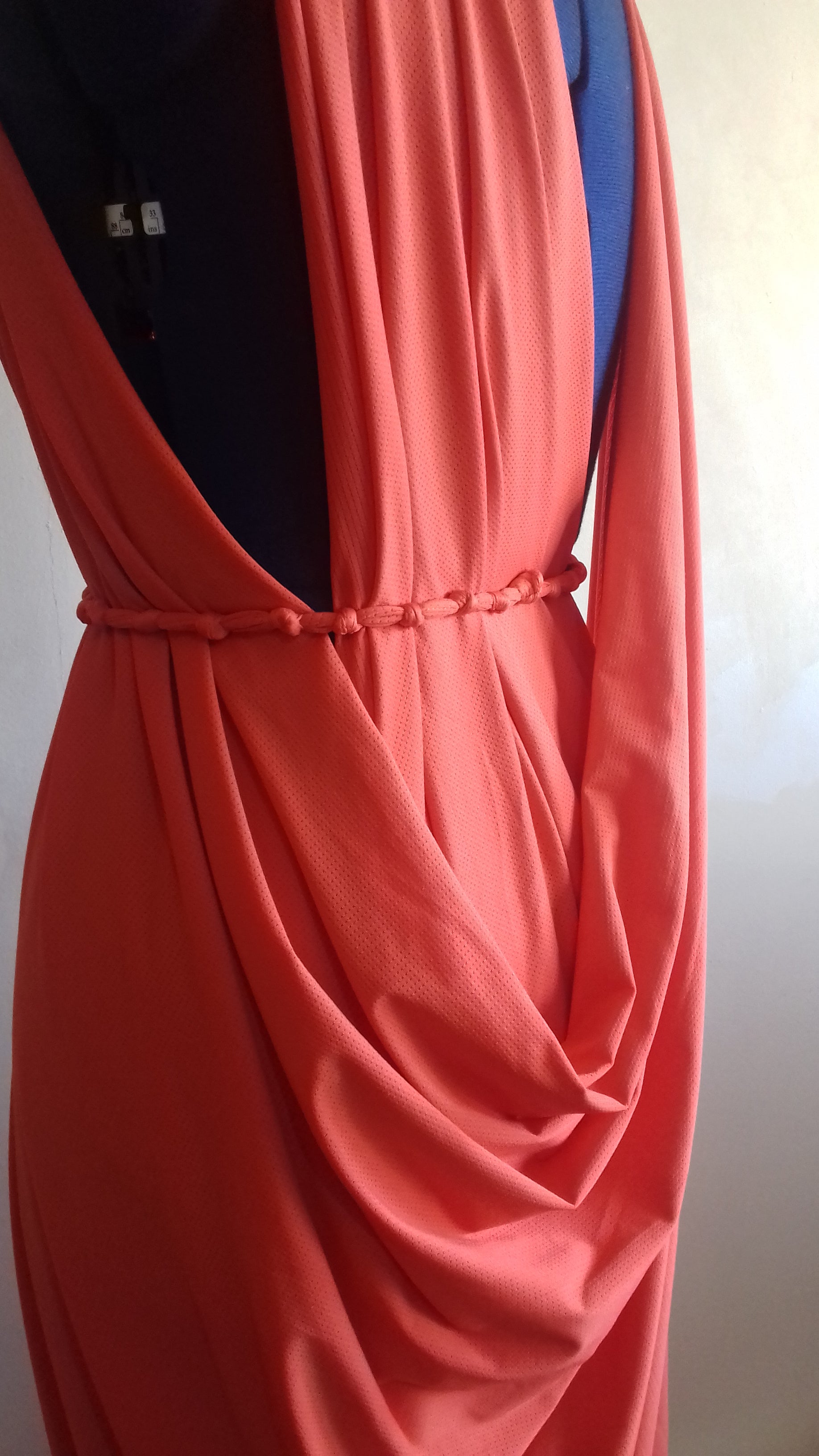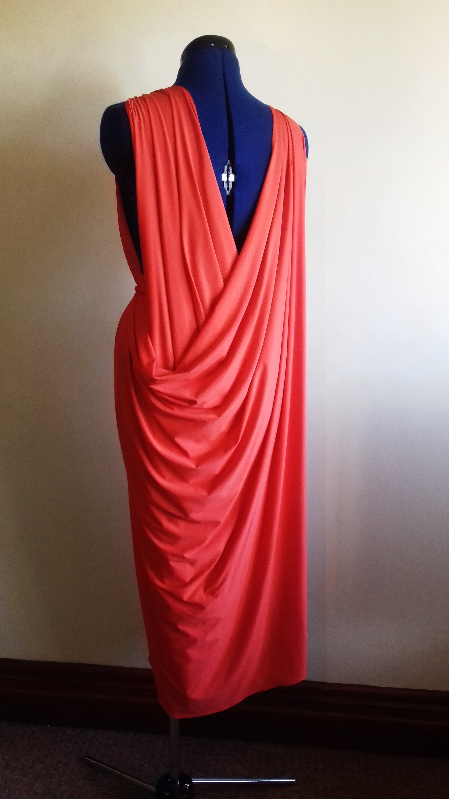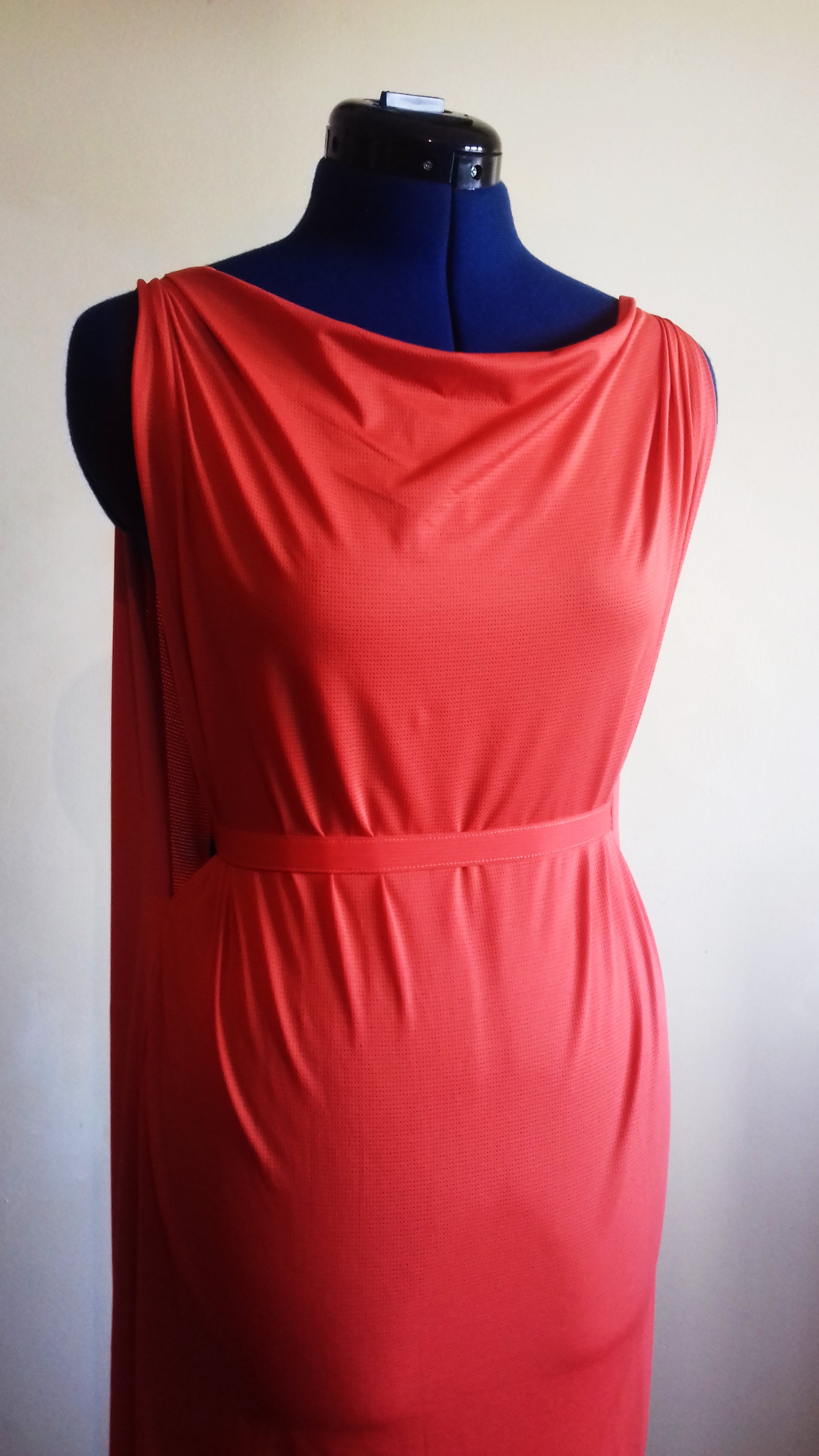 This fabulous calf length orange drape dress is perfect for so many occasions. It comes with a matching belt that ties on top at the front and inside or partly outside the back (you can wear the belt three different ways) so you don't detract from that beautiful draped detail. it is made from a light manmade fabric with a small weave pattern, much like aertex. Please see the close up image for the fabric detail.