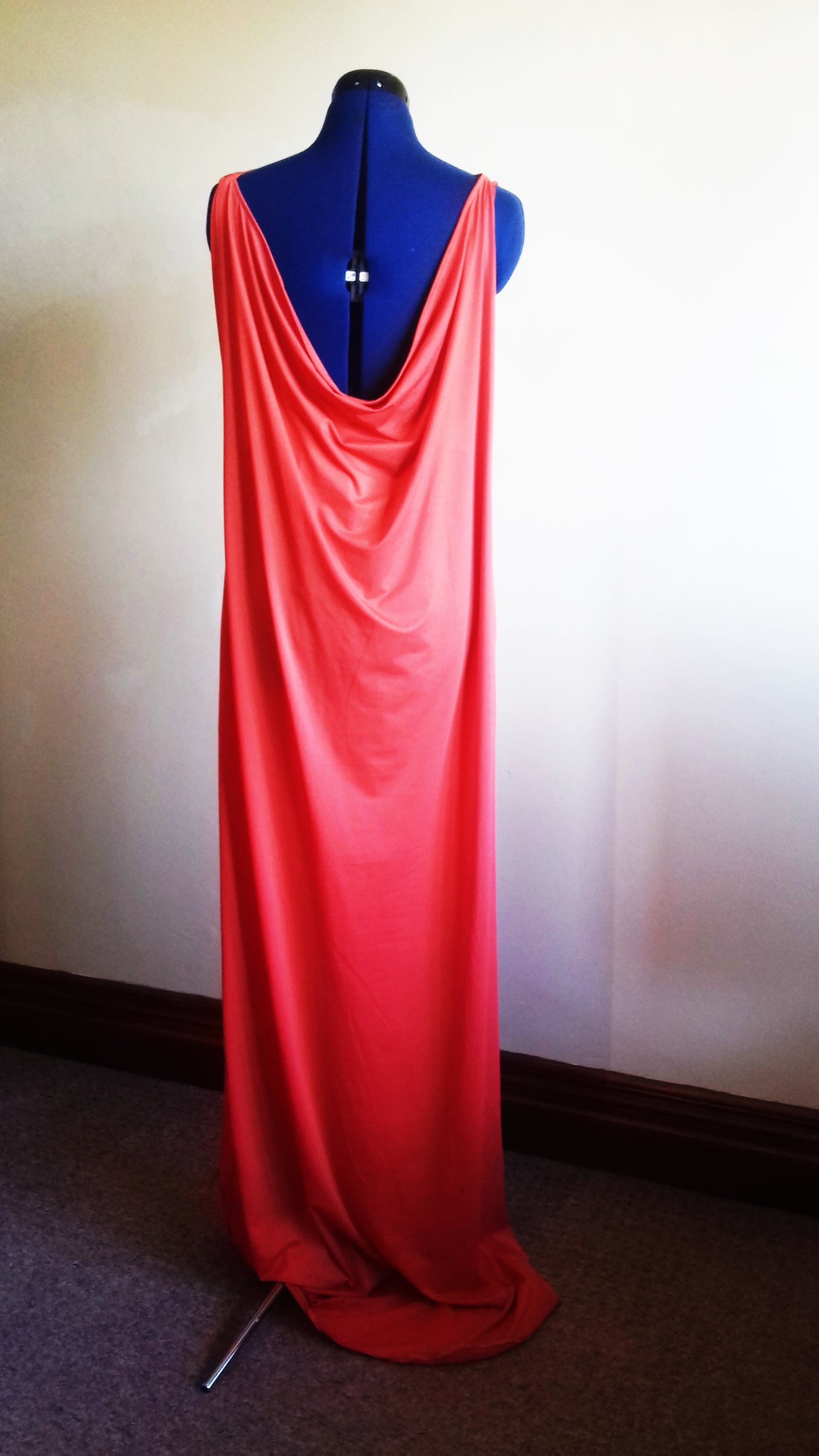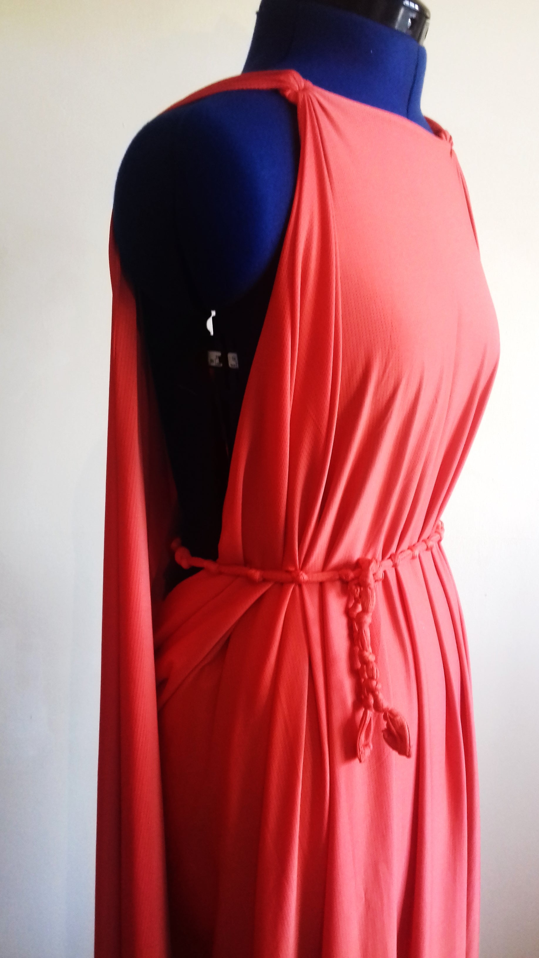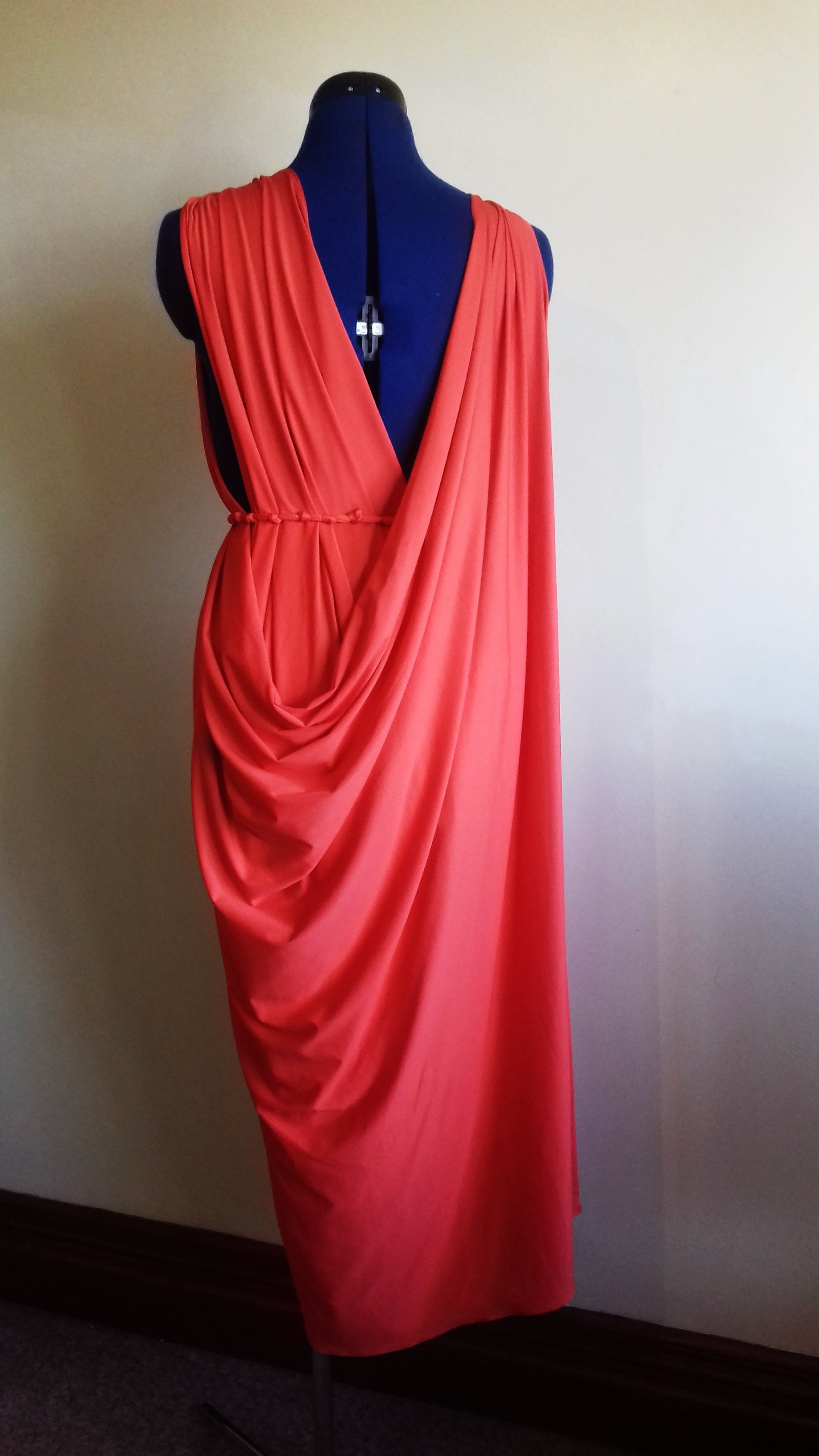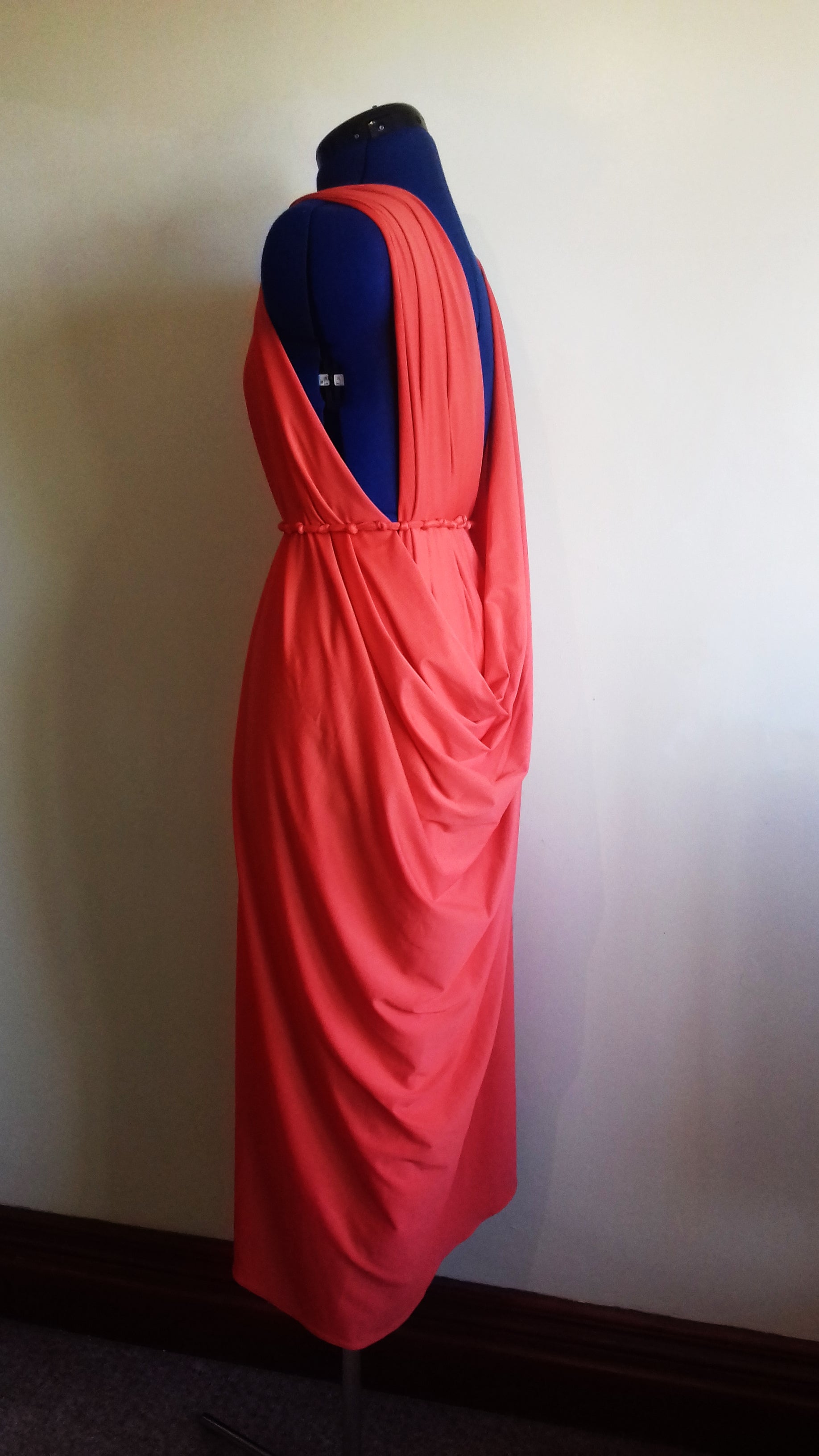 This fabulous calf length orange drape dress is perfect for so many occasions. It comes with a matching belt that ties on top at the front and inside or partly outside the back (you can wear the belt three different ways) so you don't detract from that beautiful draped detail. it is made from a light manmade fabric with a small weave pattern, much like aertex. Please see the close up image for the fabric detail.