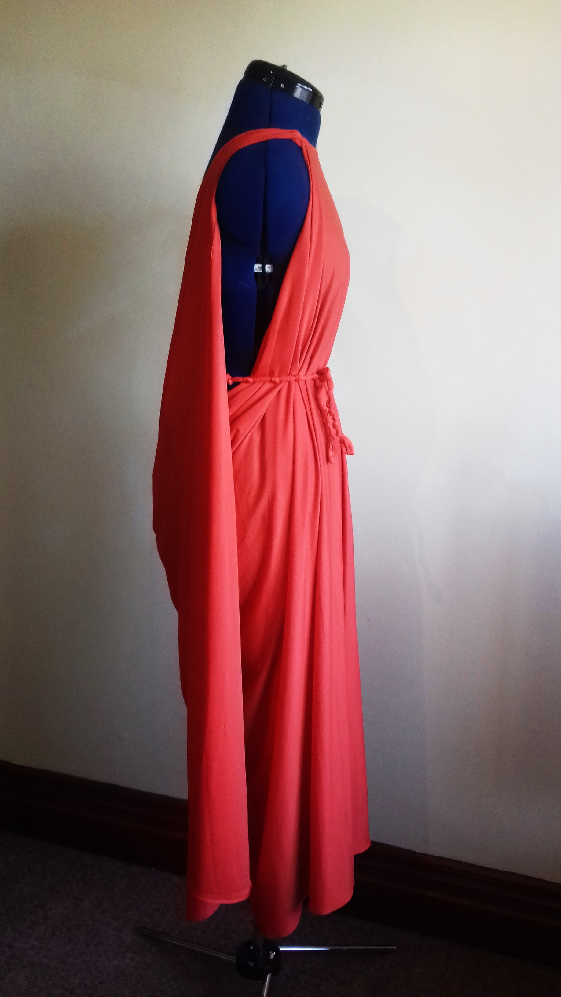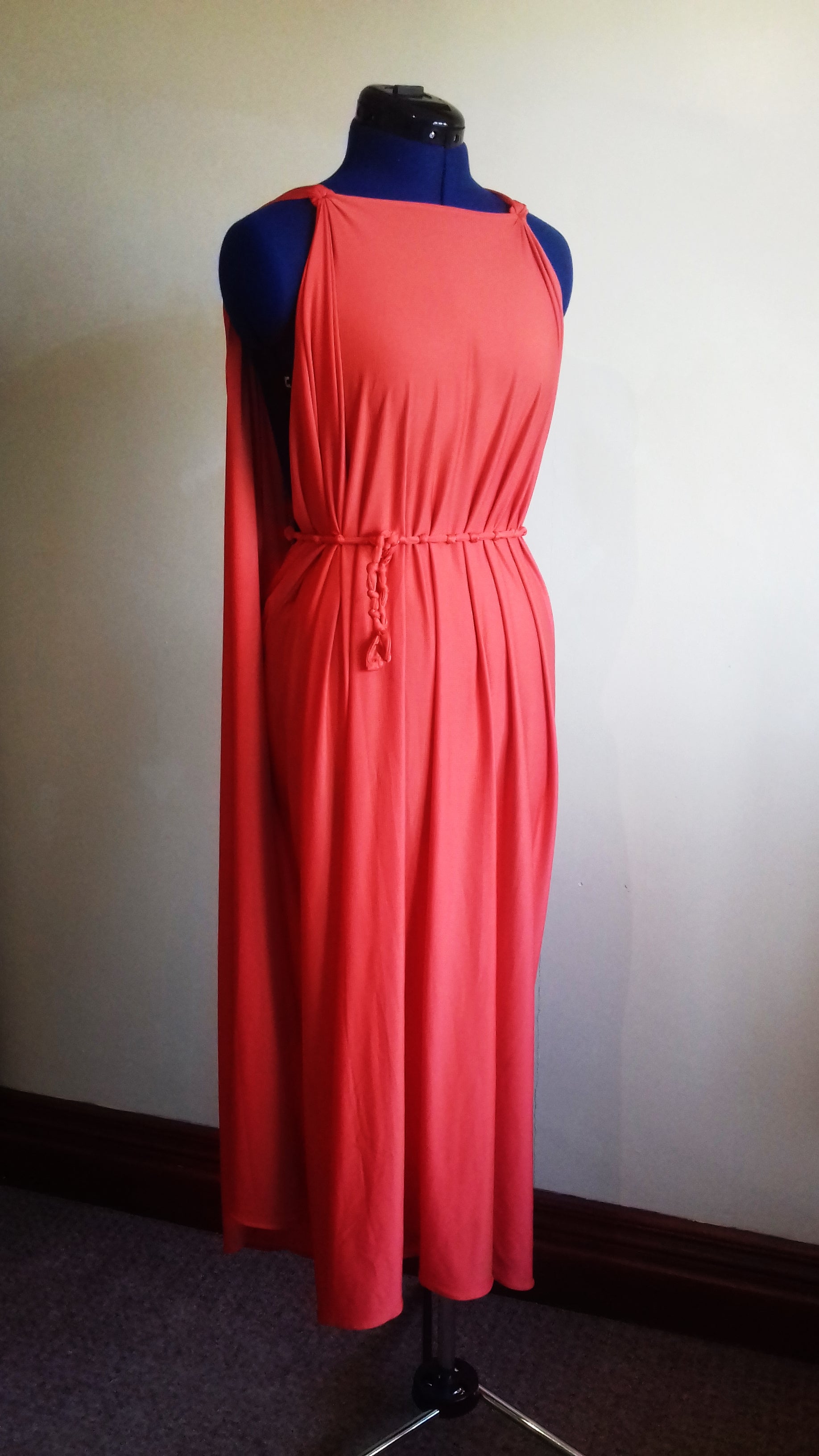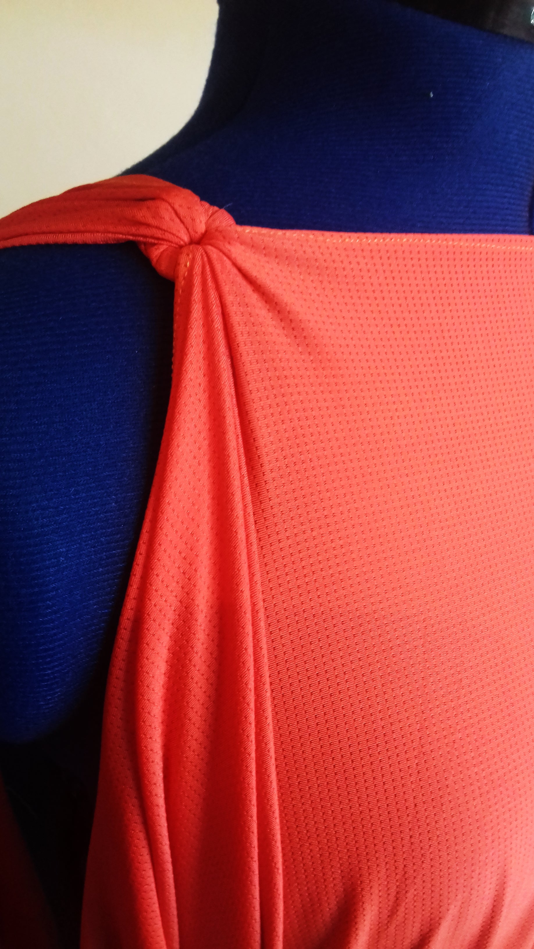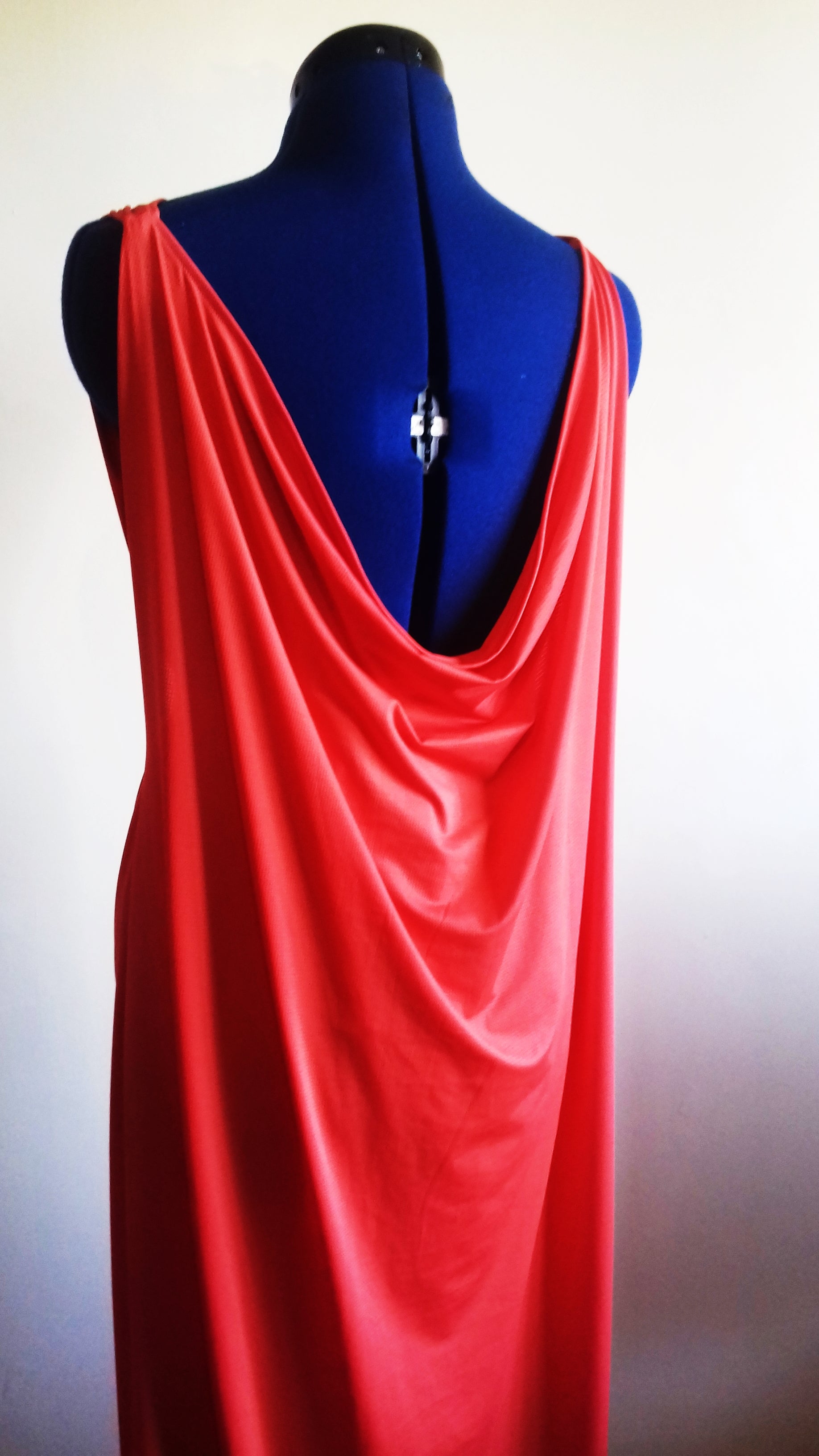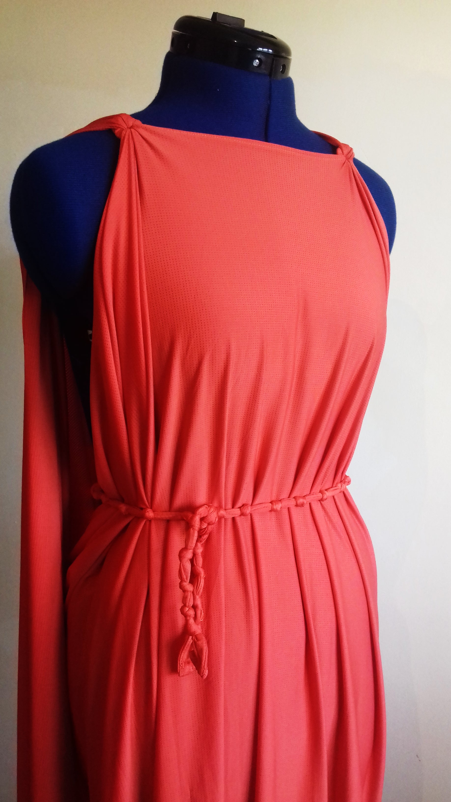 This fabulous calf length orange drape dress is perfect for so many occasions. It comes with a matching belt that ties on top at the front and inside or partly outside the back (you can wear the belt three different ways) so you don't detract from that beautiful draped detail. it is made from a light manmade fabric with a small weave pattern, much like aertex. Please see the close up image for the fabric detail.