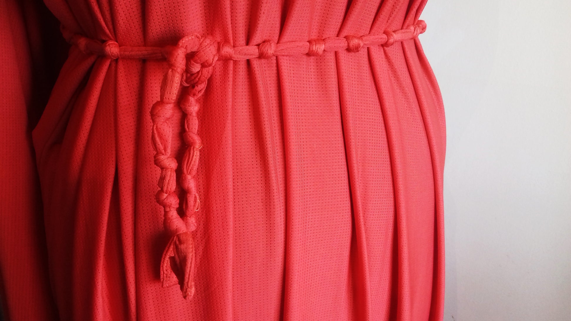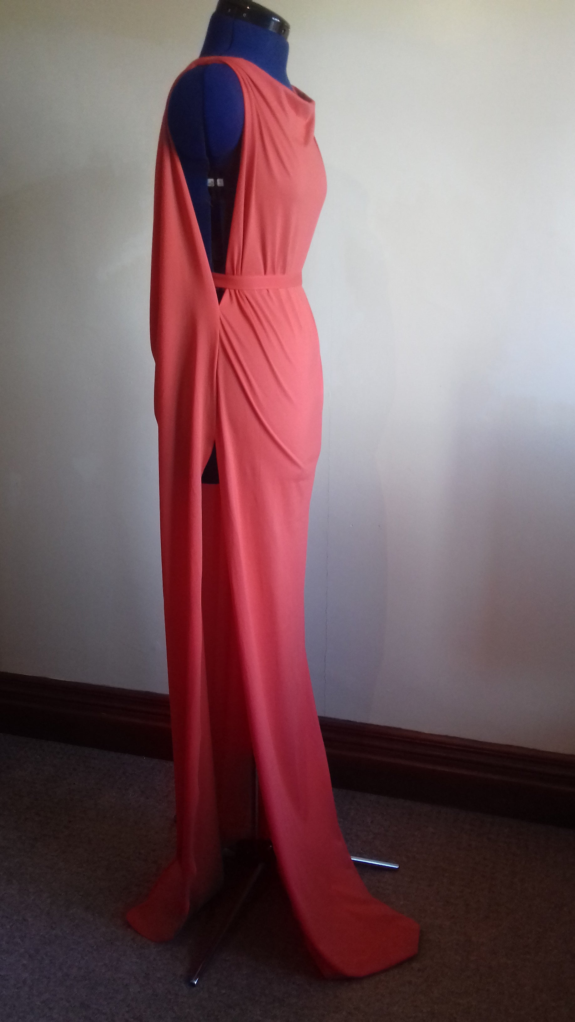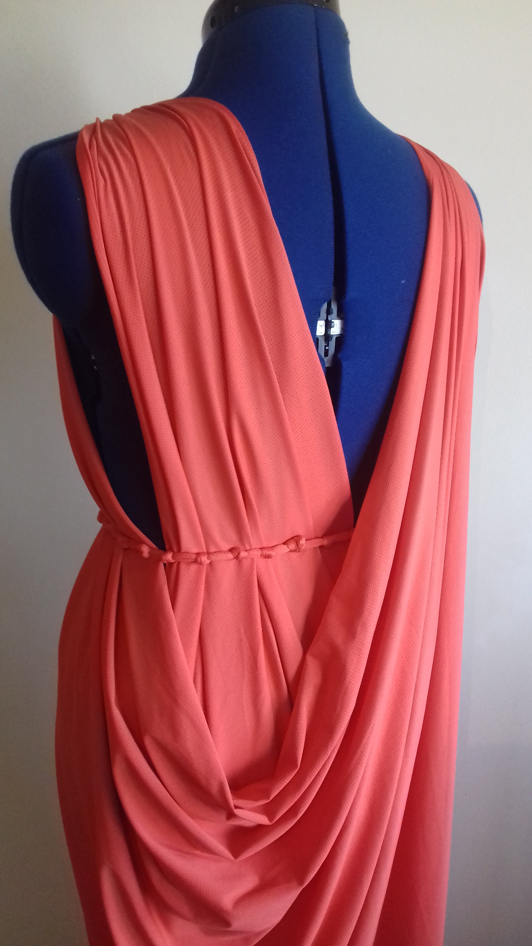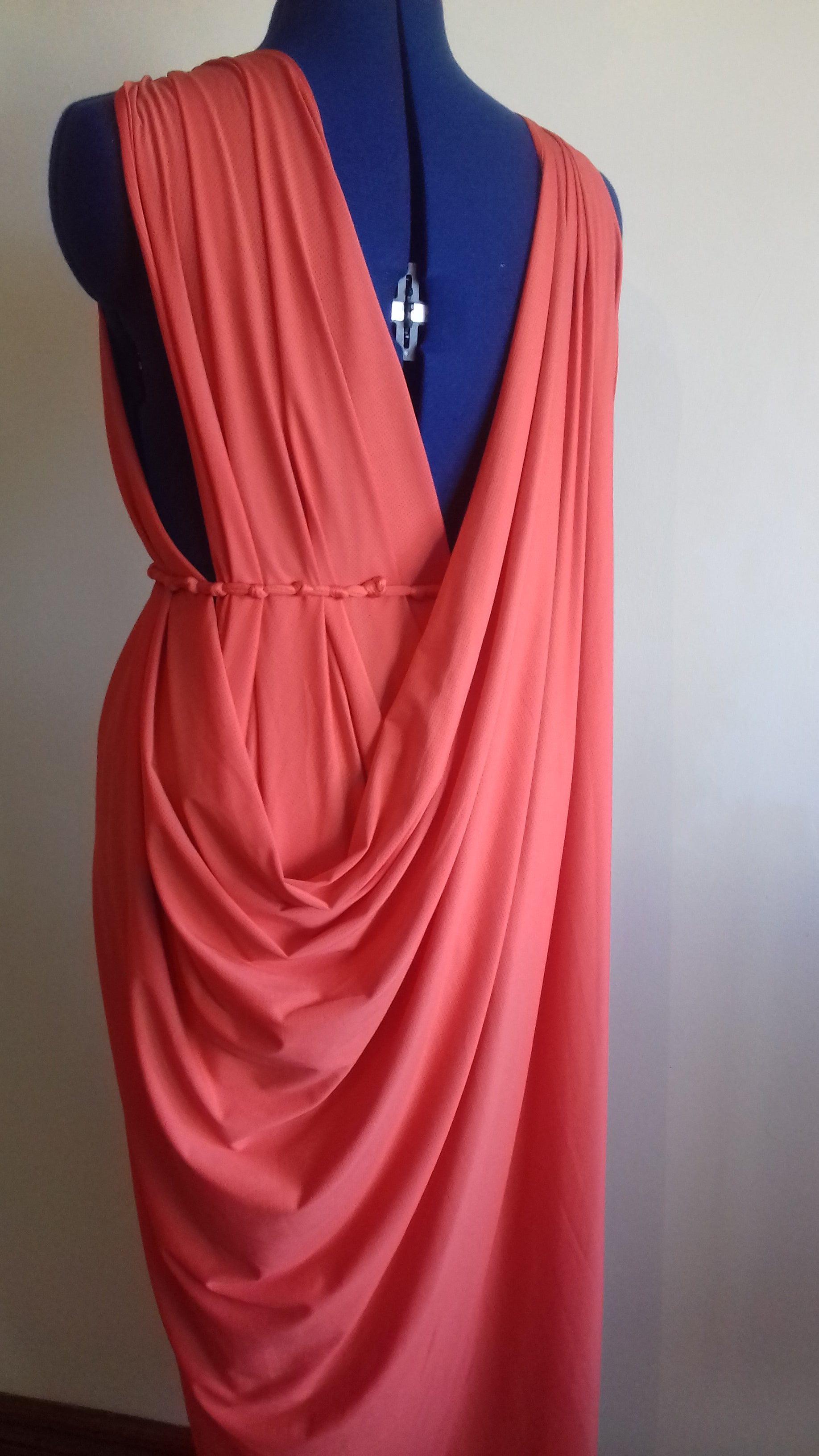 This fabulous calf length orange drape dress is perfect for so many occasions. It comes with a matching belt that ties on top at the front and inside or partly outside the back (you can wear the belt three different ways) so you don't detract from that beautiful draped detail. it is made from a light manmade fabric with a small weave pattern, much like aertex. Please see the close up image for the fabric detail.