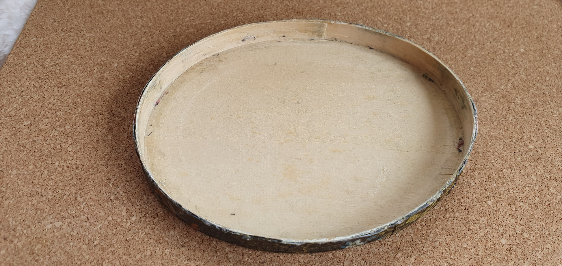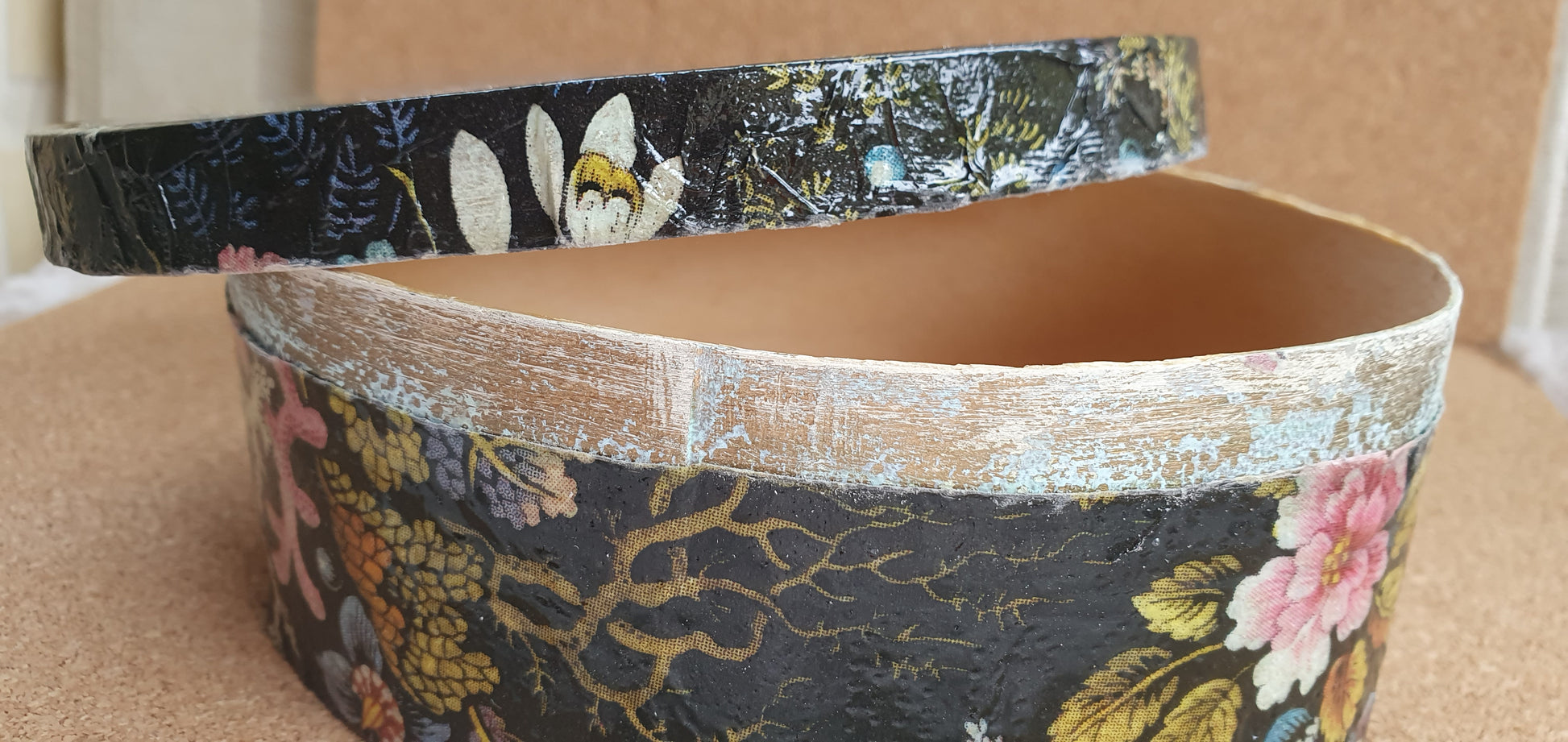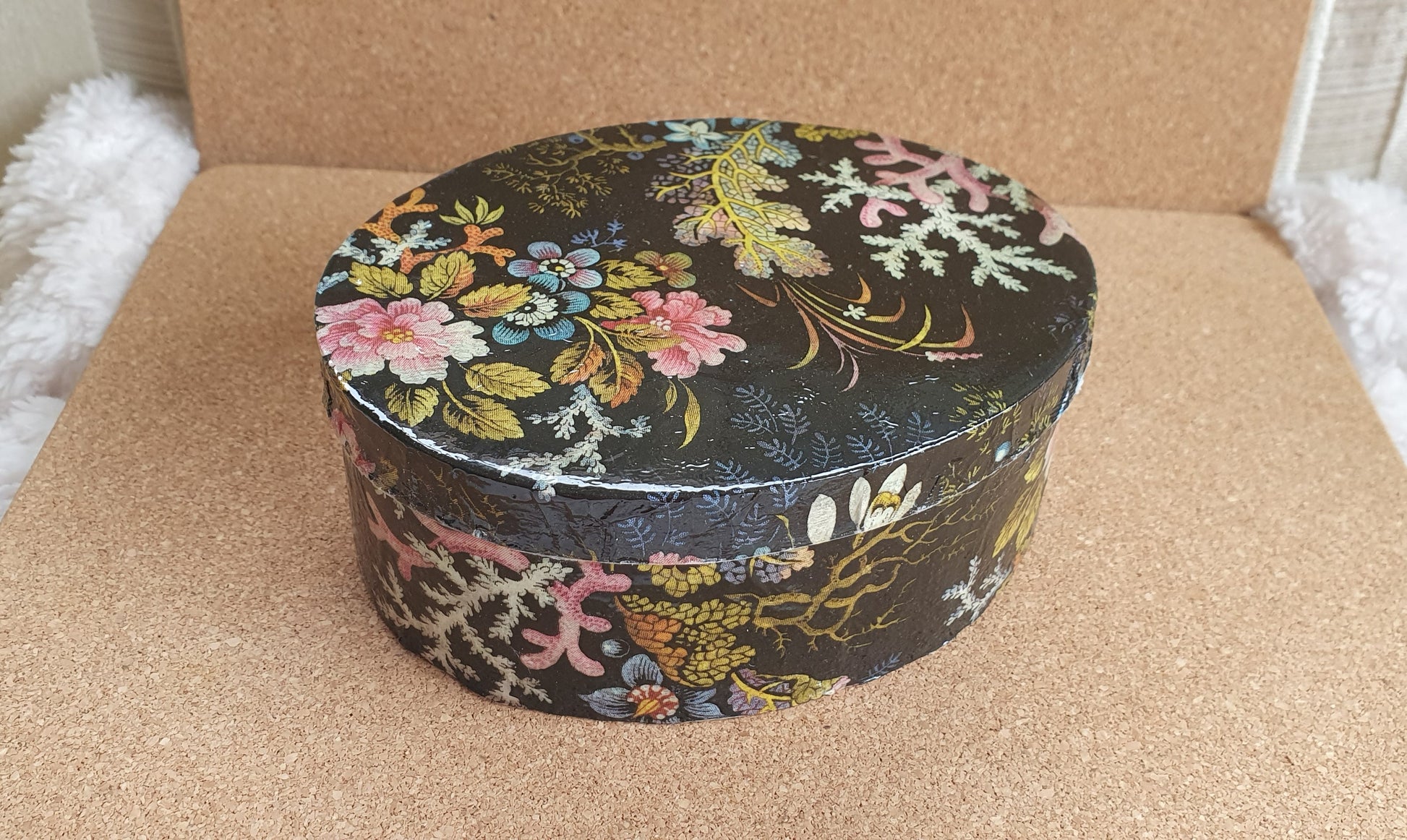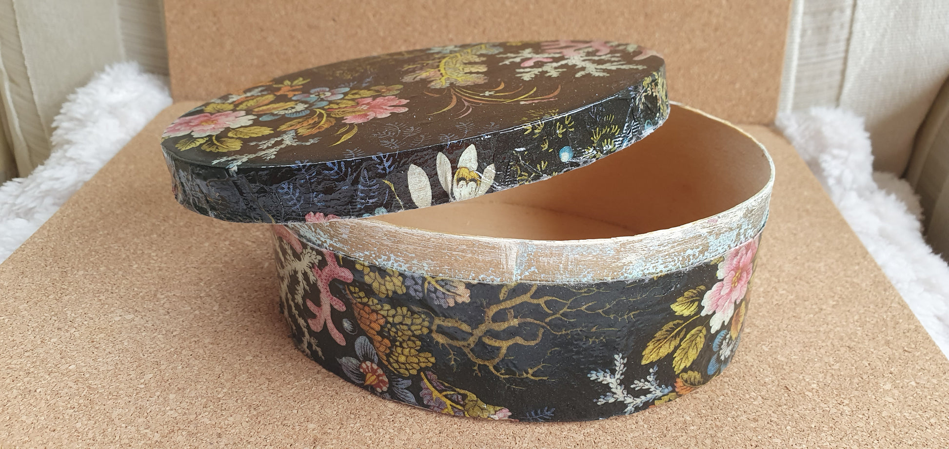 This oval wooden box has been rescued, hand decorated with decoupage and varnished by me in my studio.