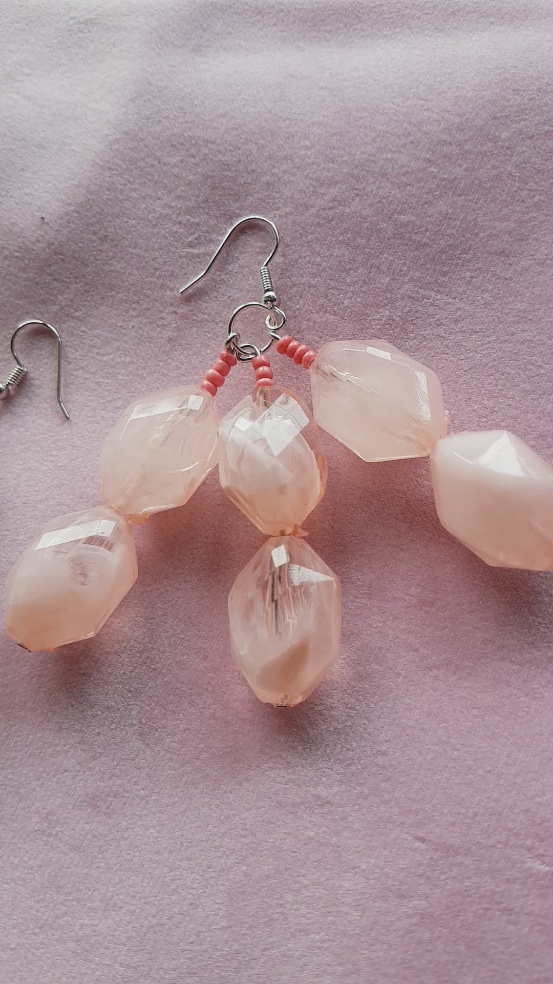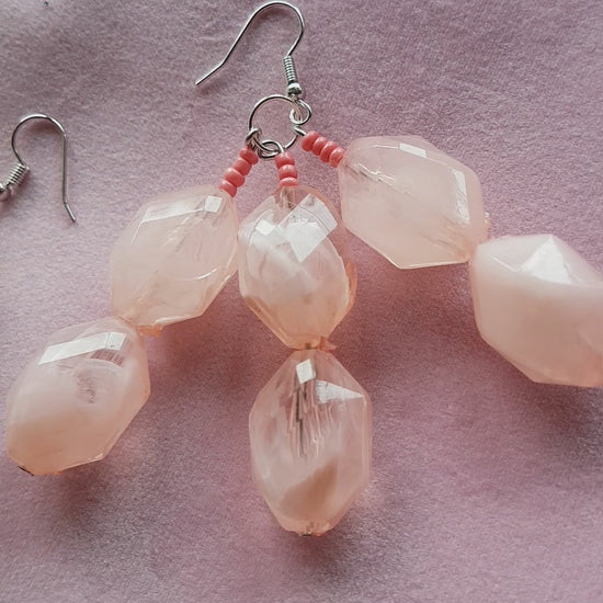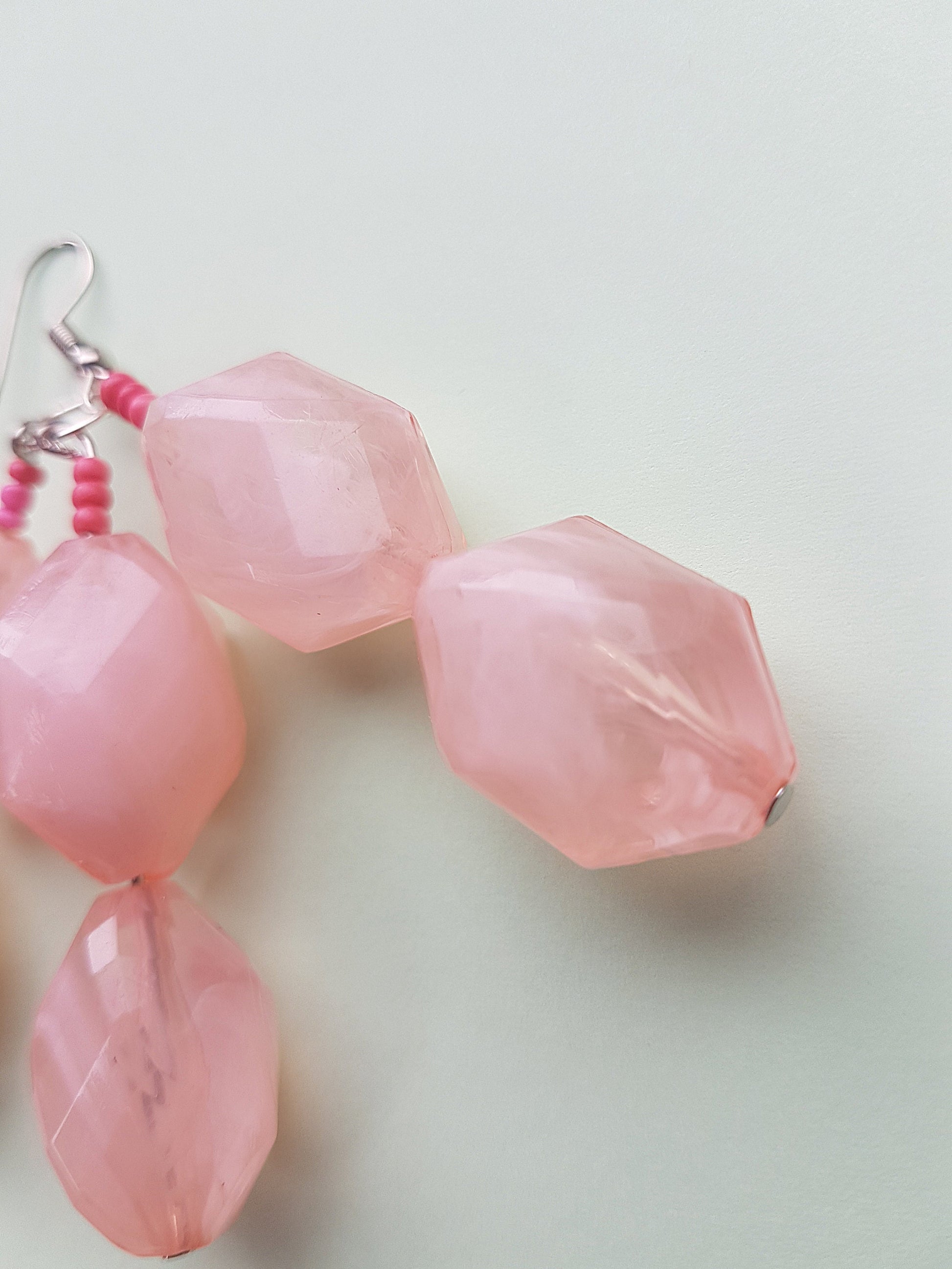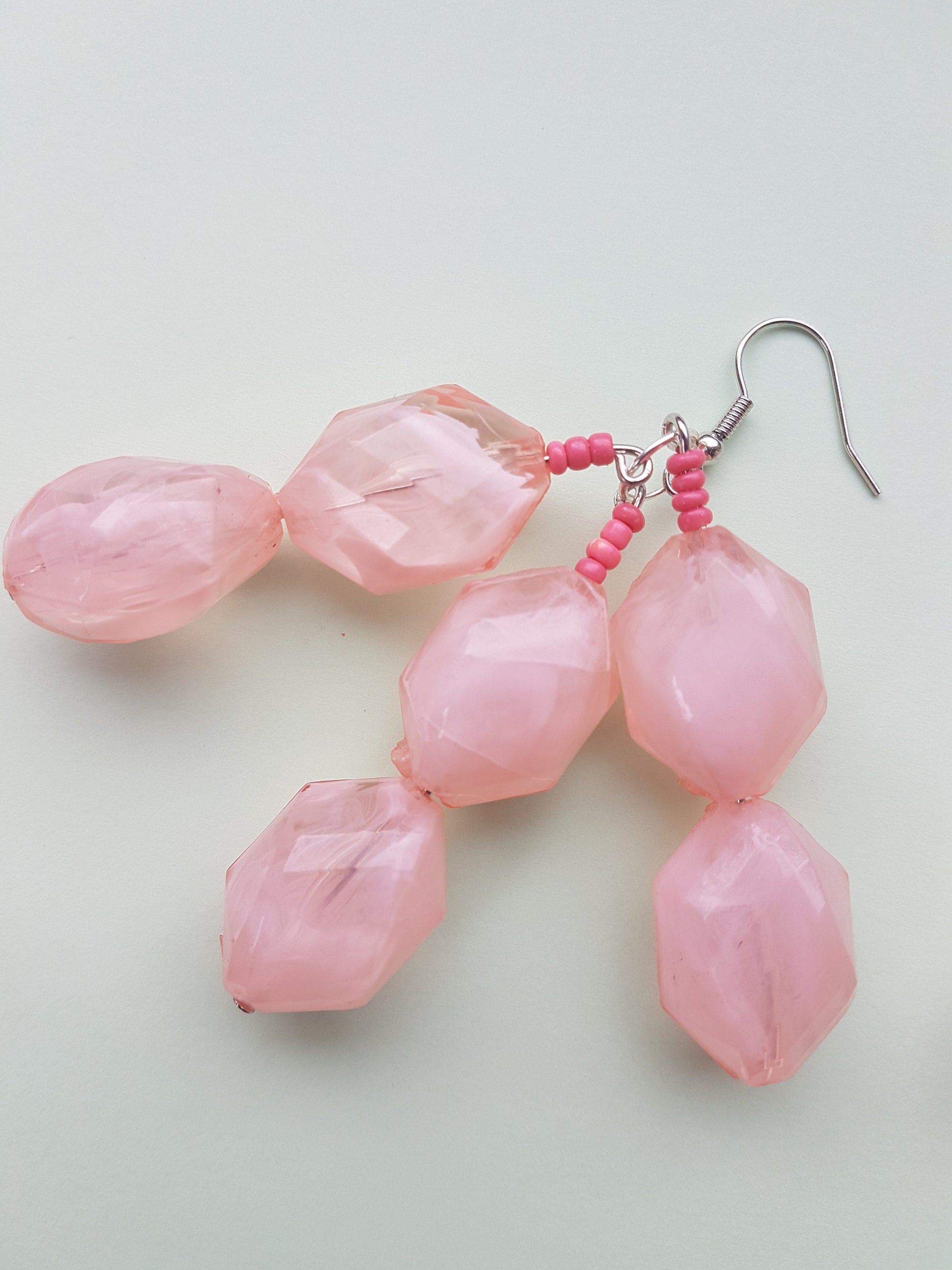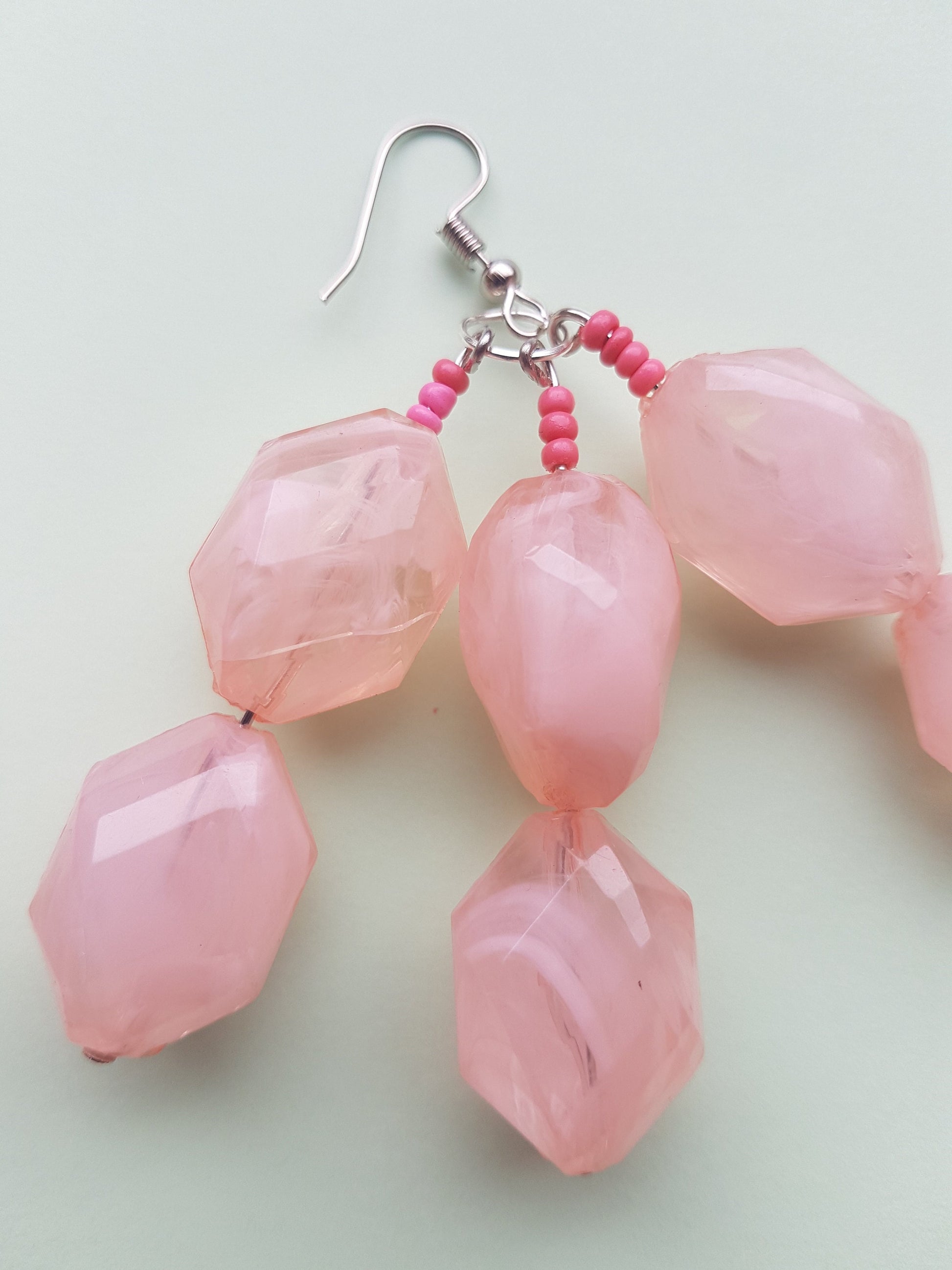 This pair have a length approx 7.5 cm and comprise a silver effect earring with pink seed beads and big chunky baby pink plastic beads on a silver post.