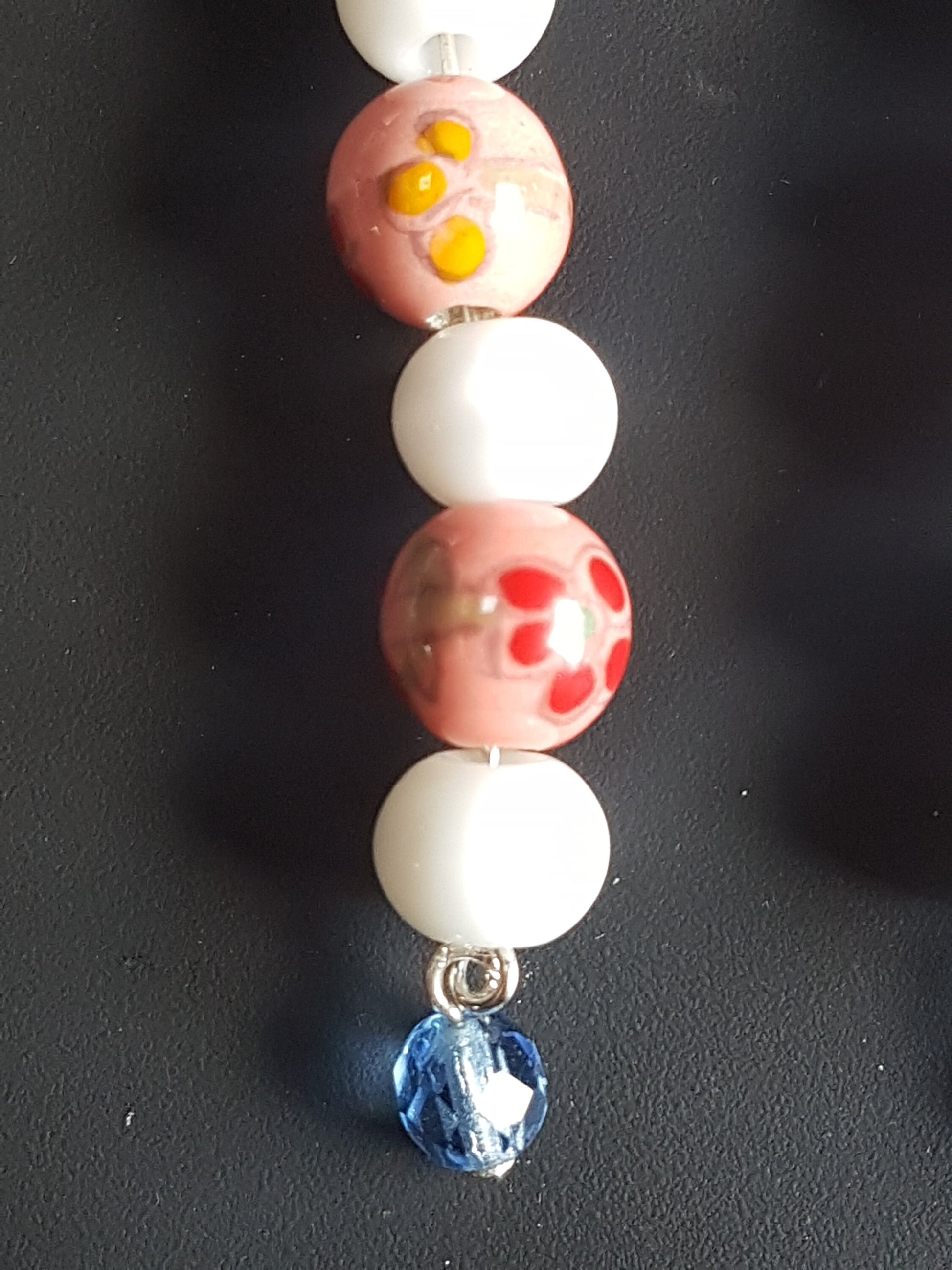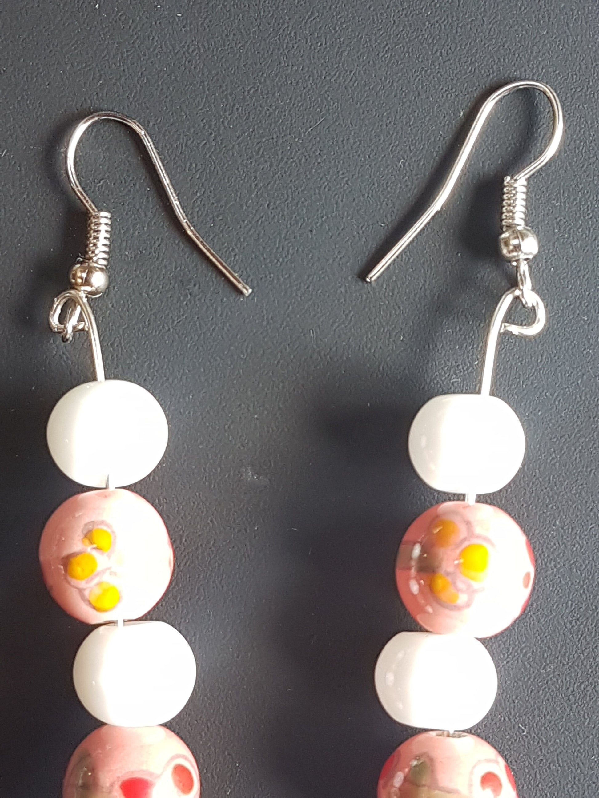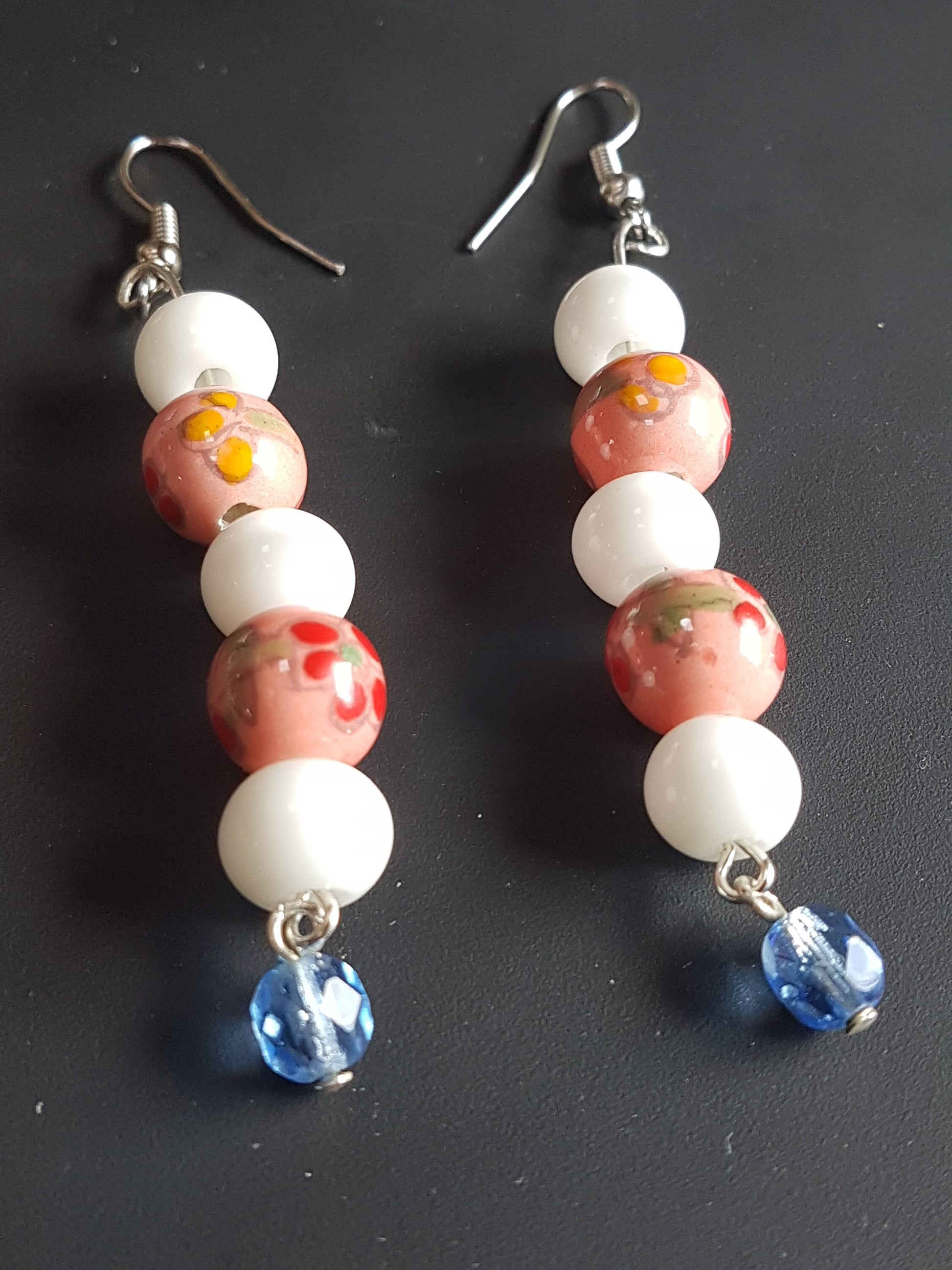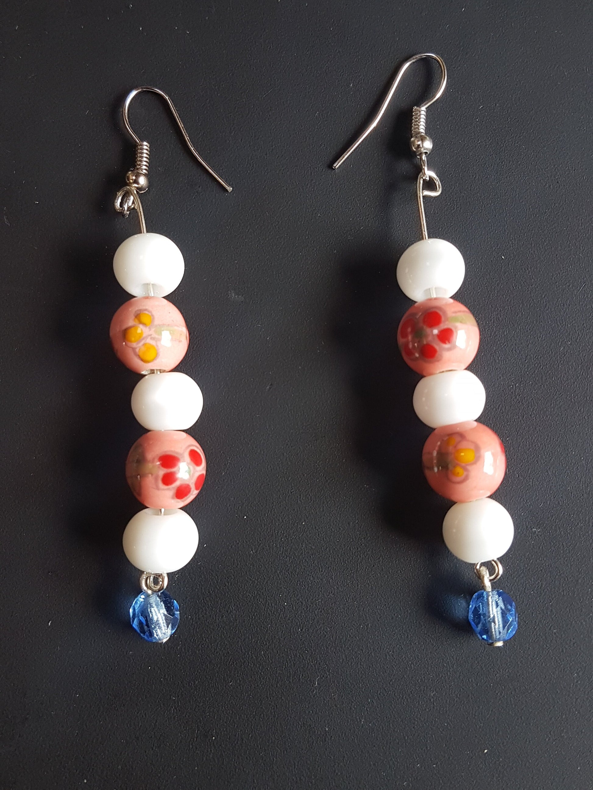 Pink Floral White Blue Bead Silver Earrings