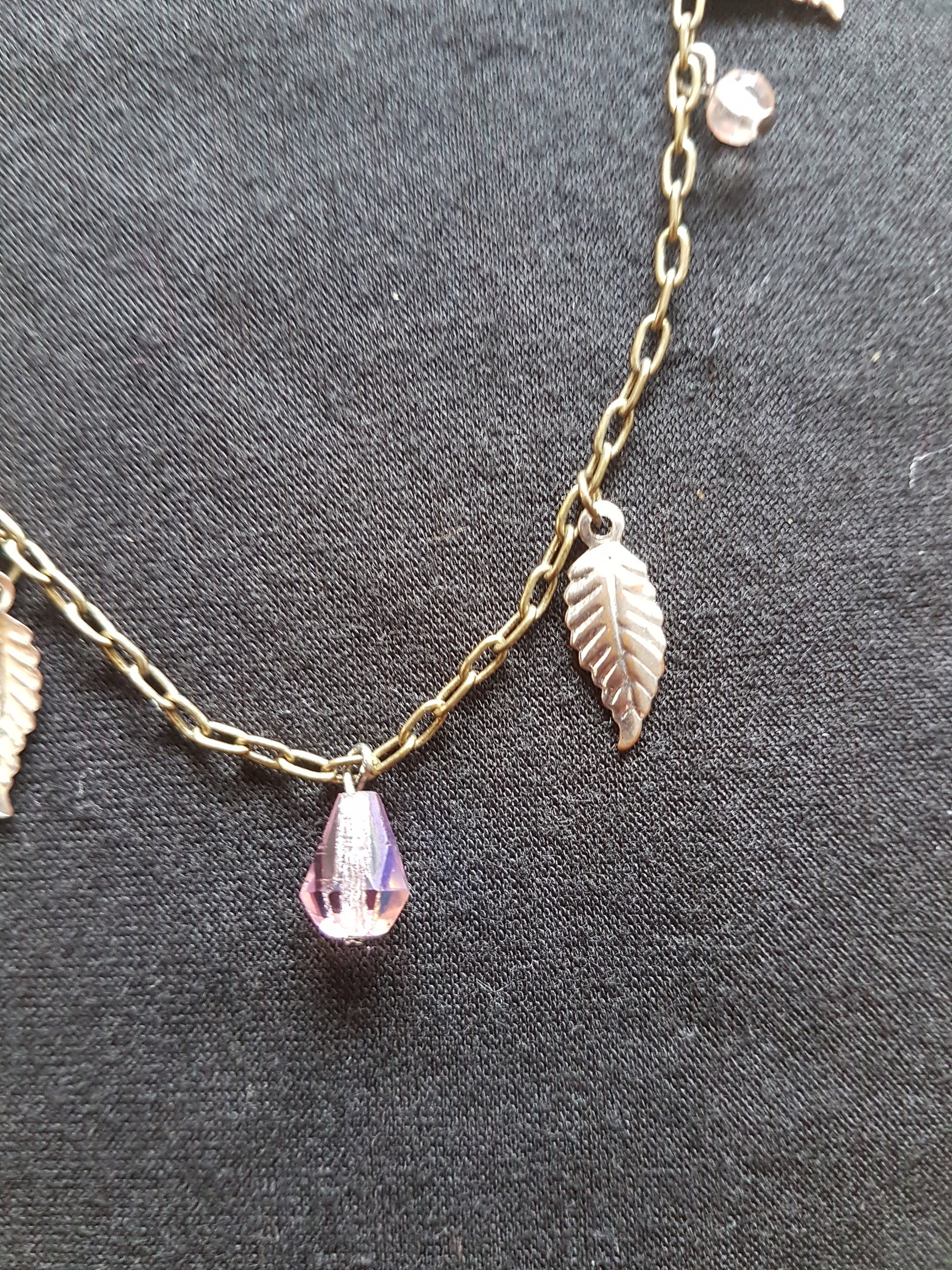 This one is 7.75 inches long including the clasp and I can alter the length if required. It has iridescent purple pink gems and silver leaf charms on it.