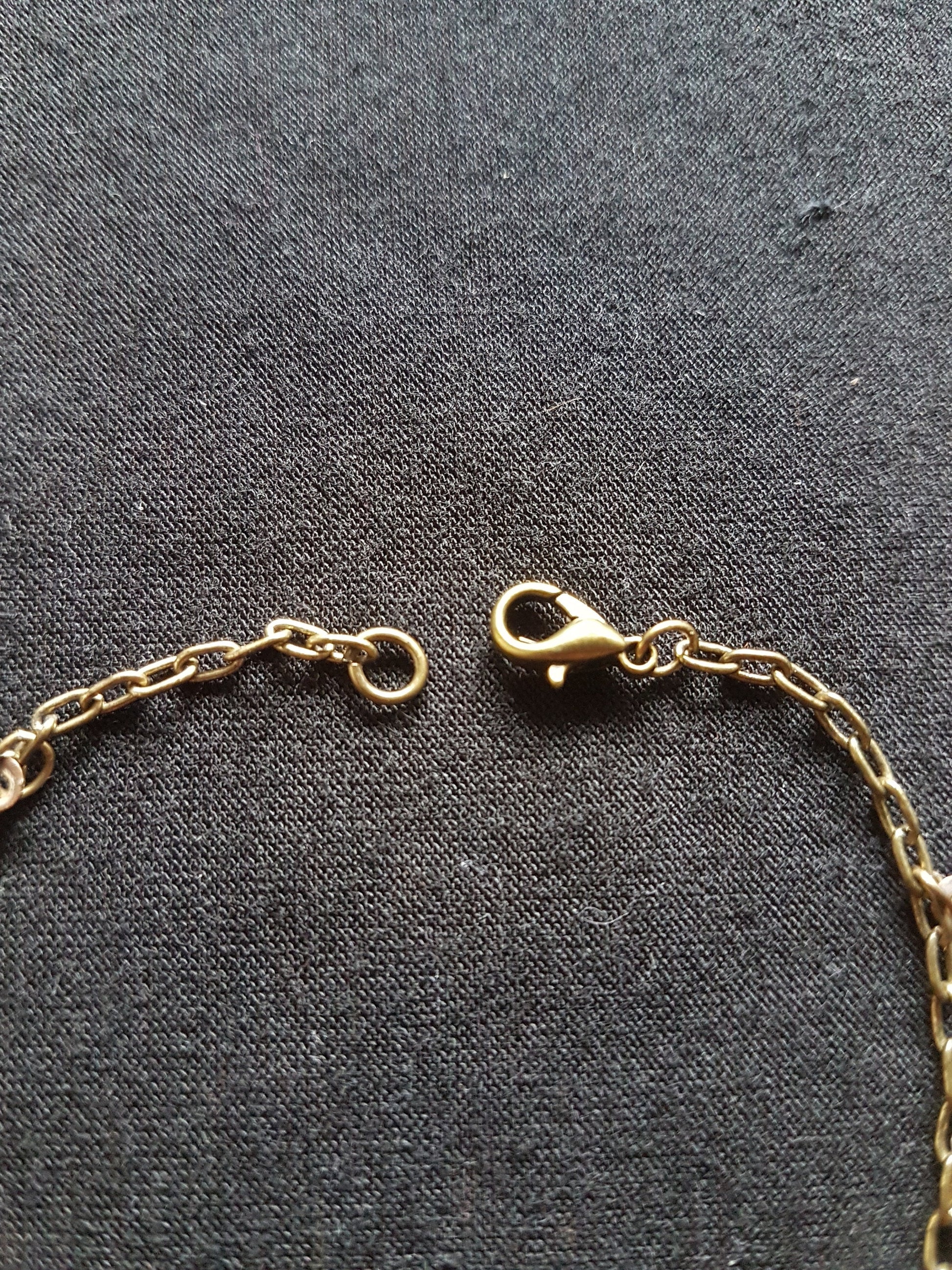 This bracelet has been upcycled from a broken necklace. It is made from a bronzed metal and brown gem stones.
