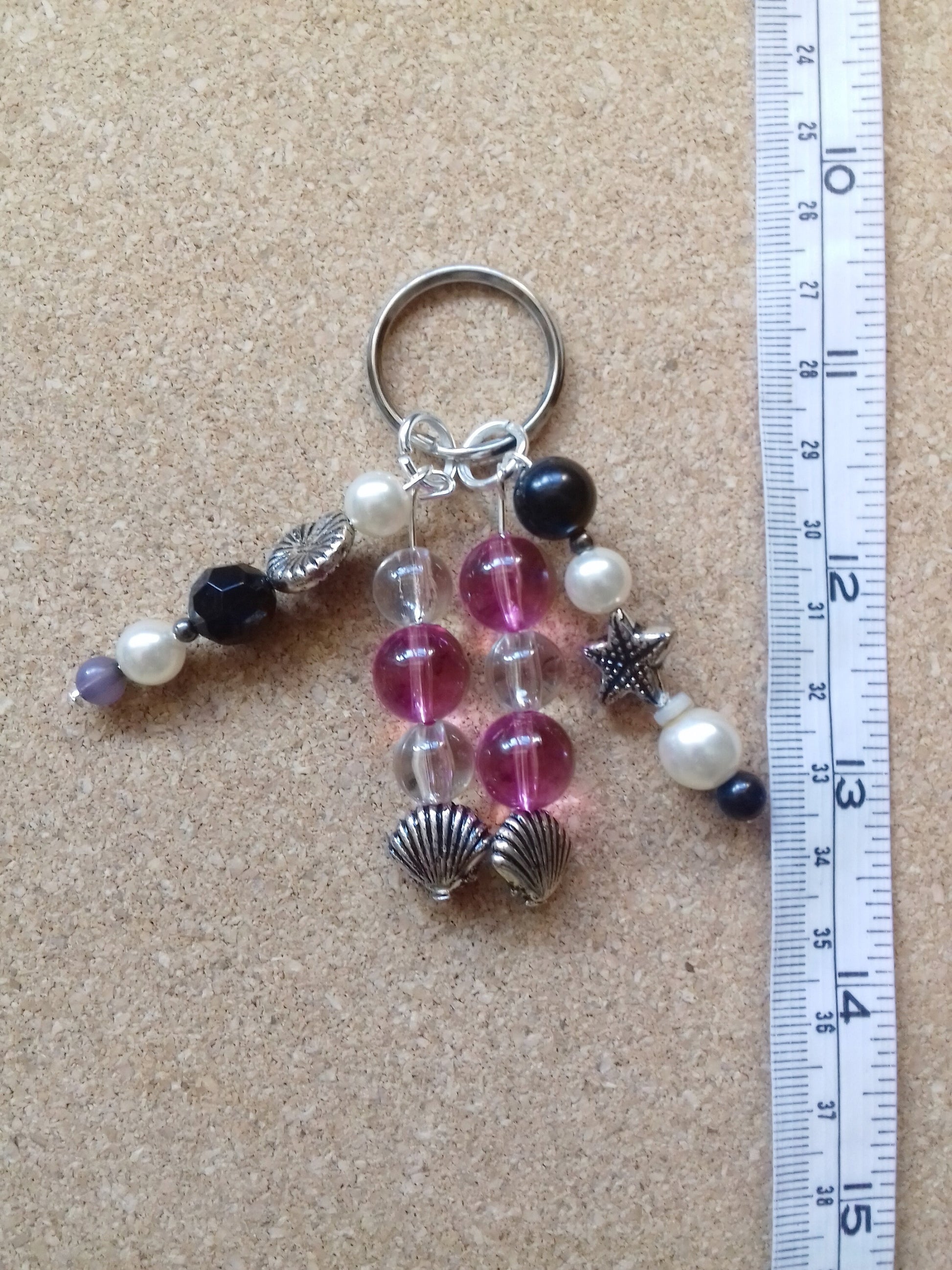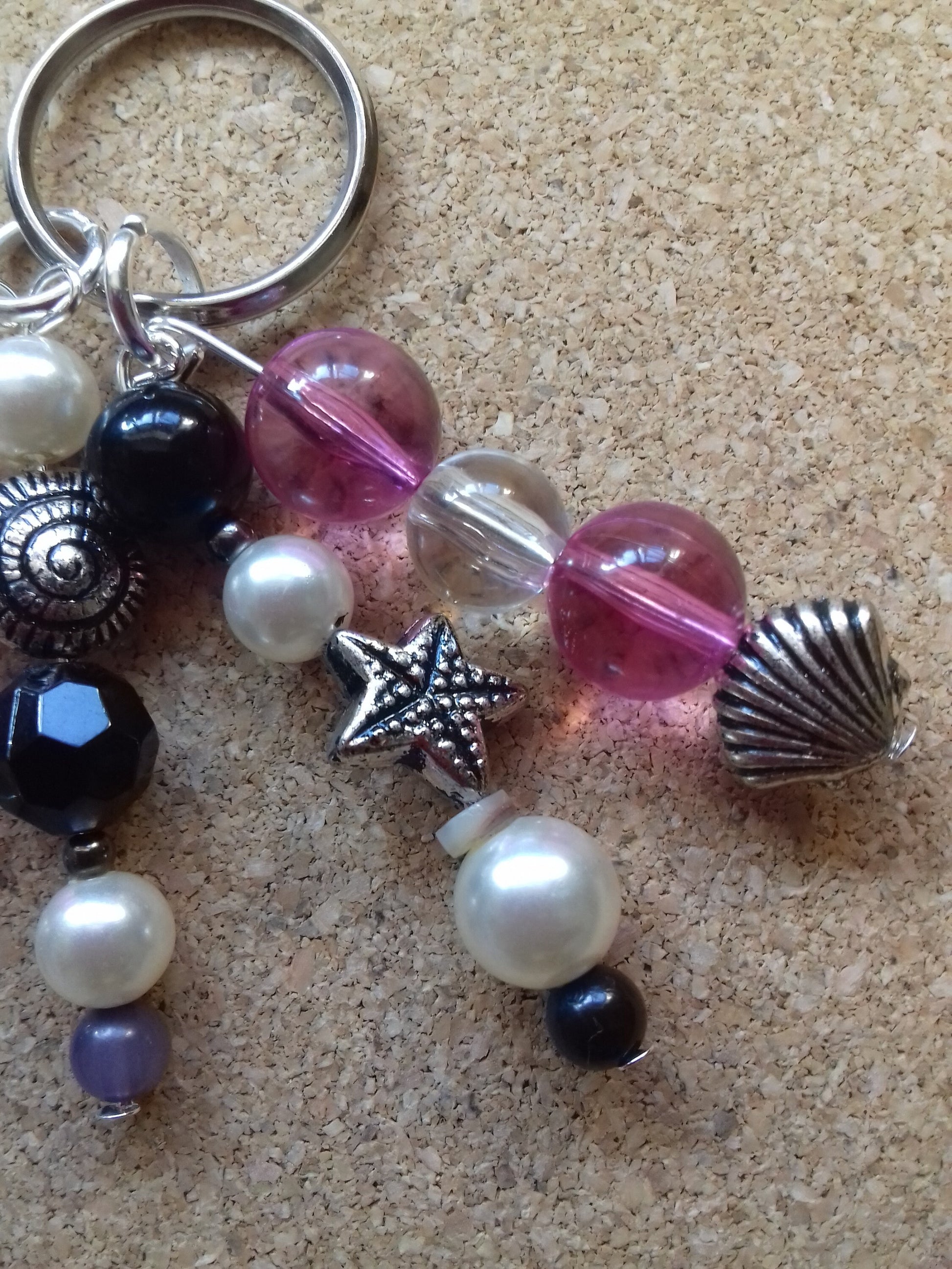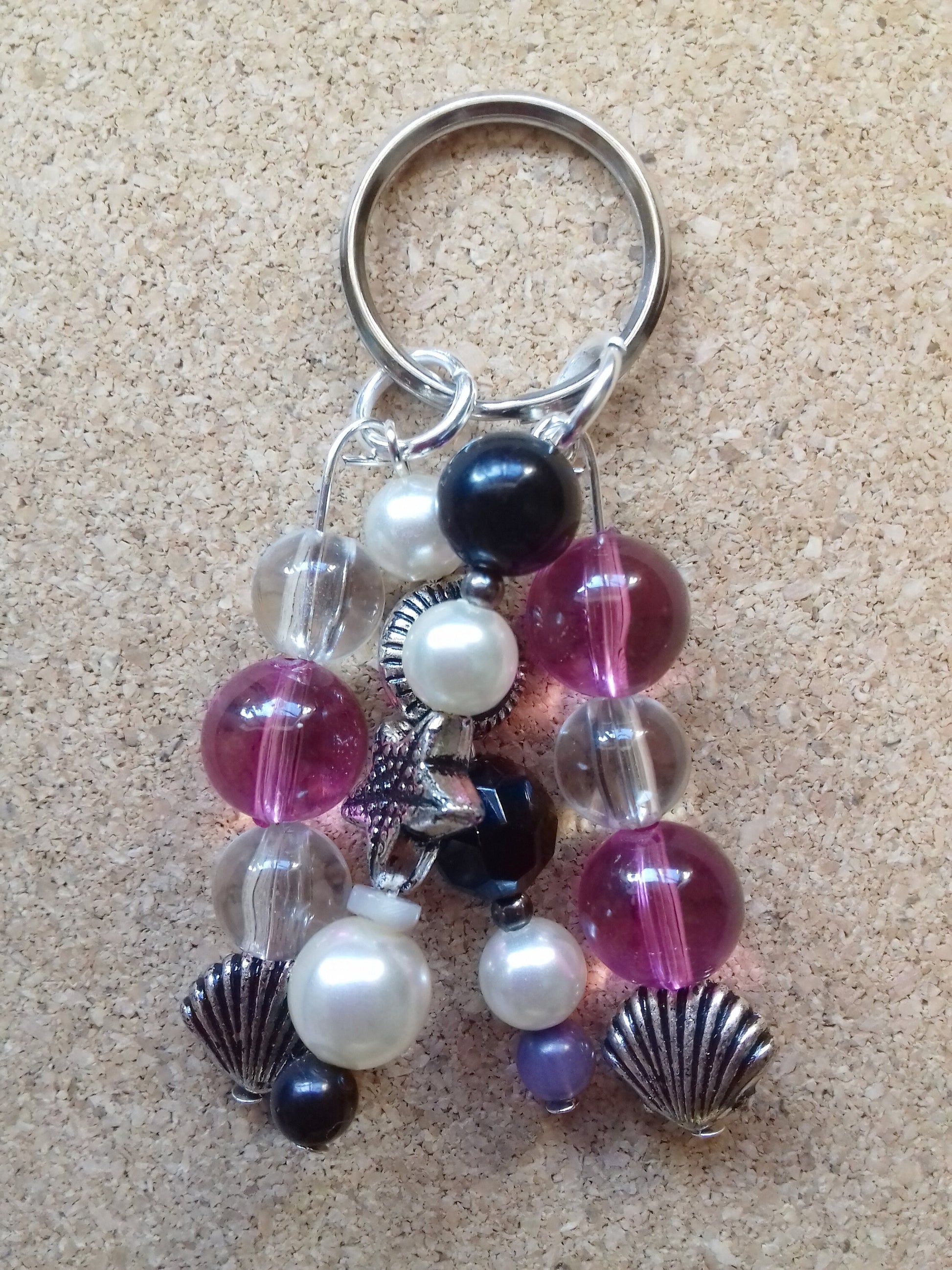 This is a gorgeous keychain with a seaside theme which incorporates resin beads in pink, clear, black and purple and sea-themed keepsakes including a starfish and shells on a silver keychain.
