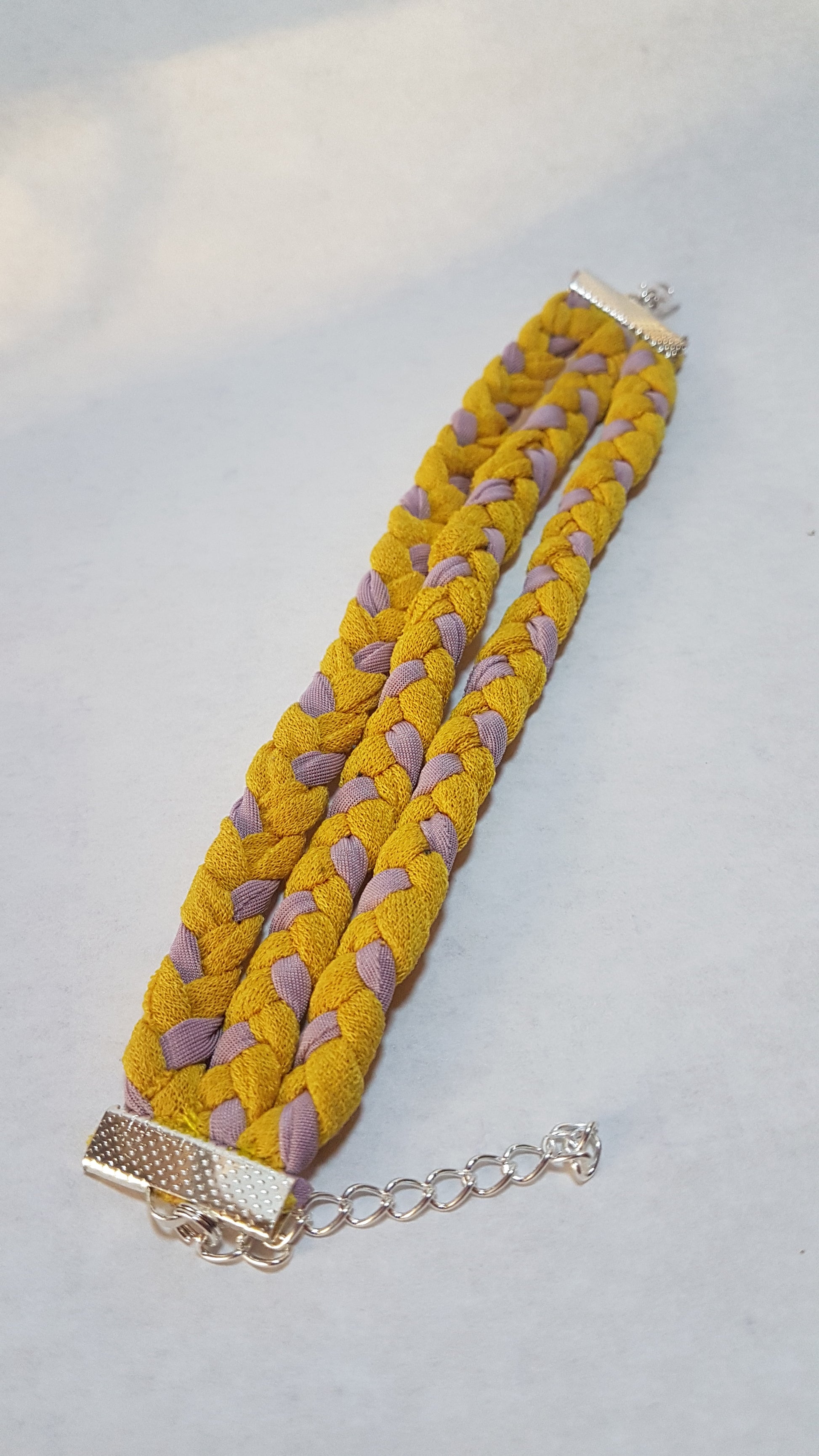 Each design has been made from fabrics left from my dress projects and braided into lengths that are fixed with silver clasps, to create a unique, attractive accessory. Each one is a unique one off and cannot be repeated.