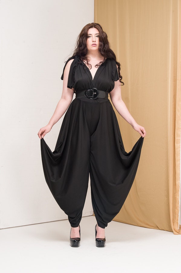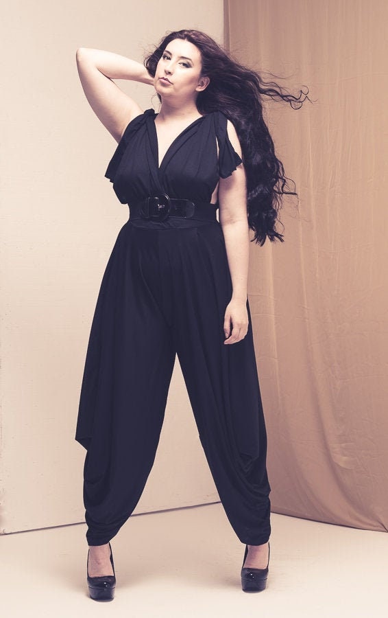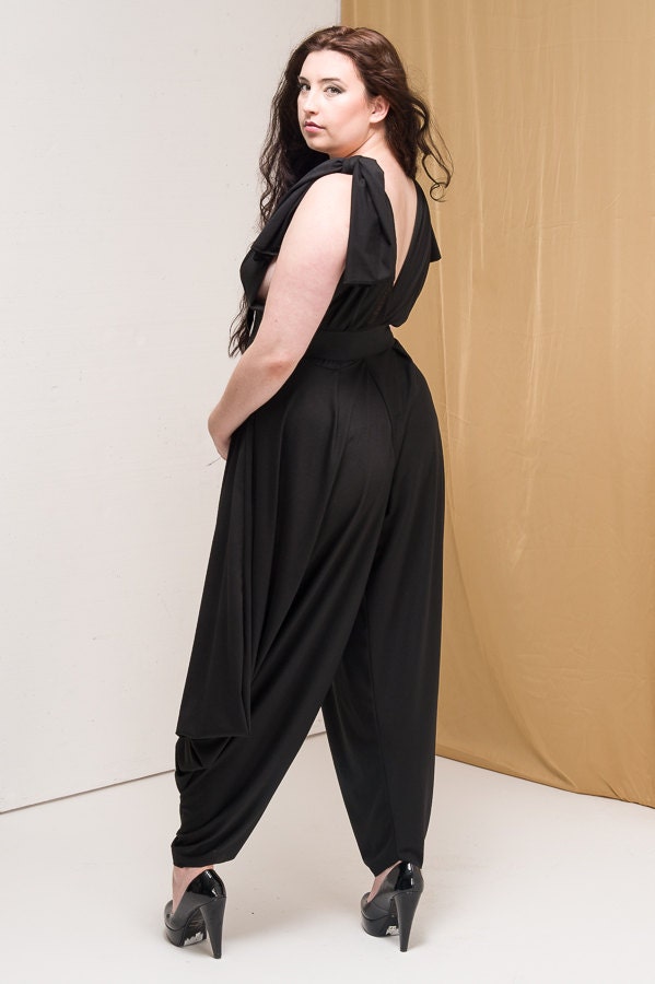 This fabulous harem pants jumpsuit is one of Falcieri Designs key pieces. Extra wide pants that hang beautifully on any figure in drapes that are elegant and stylish. The crossover front and V neck back make this the kind of garment you can dress with heels and a bit of bling for the evening or flats for an easy going day trip out.