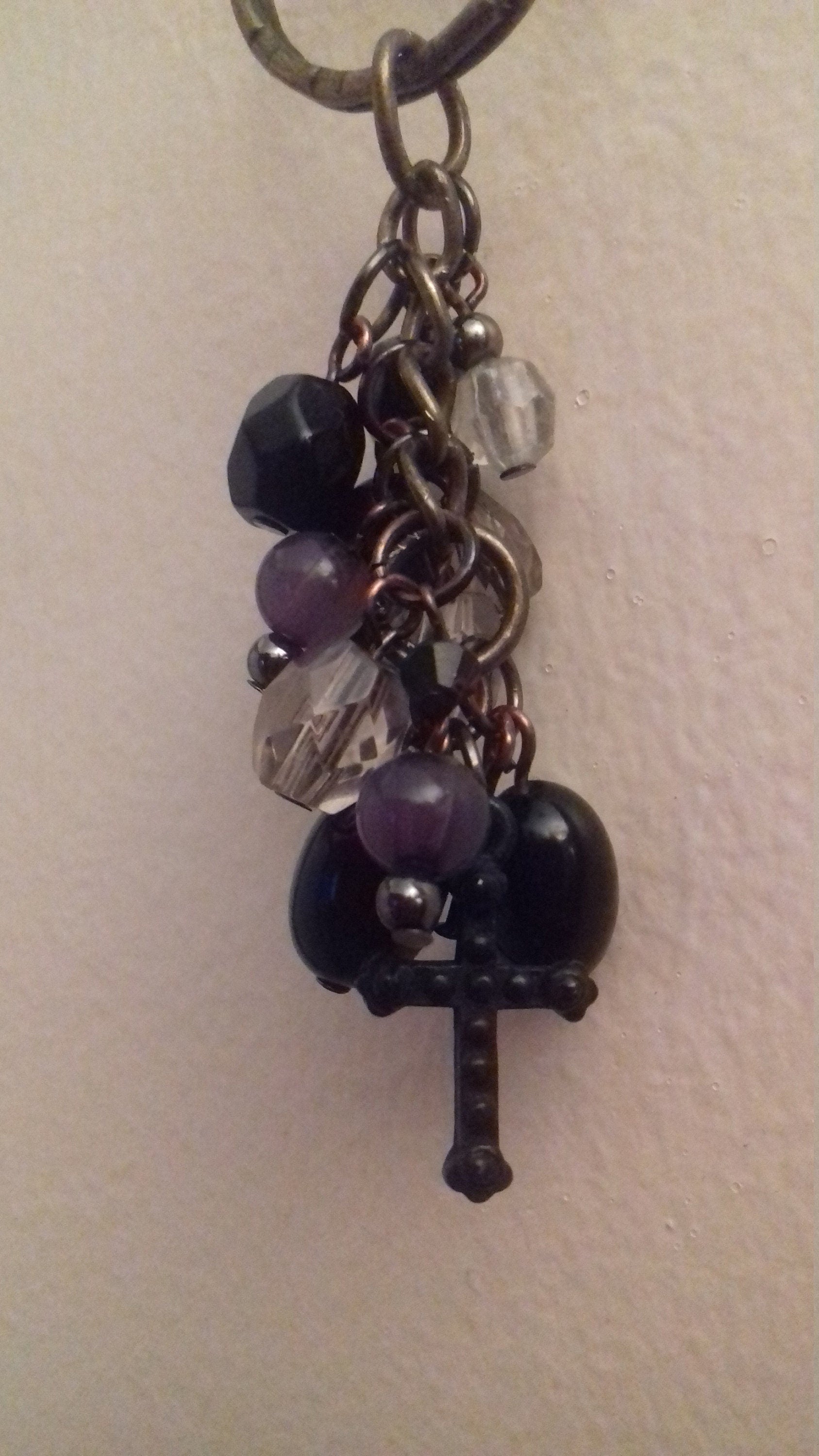 This is a gorgeous little keychain made from black, purple and clear beads and a little black cross on the end. The chain settings are bronze.