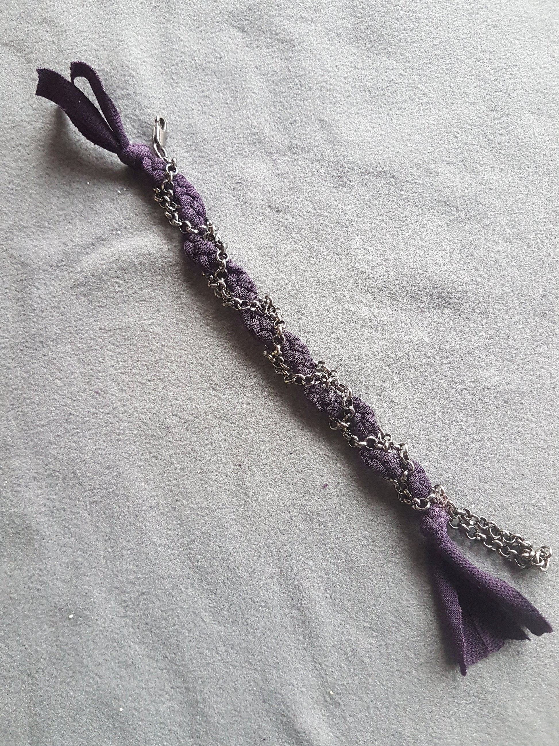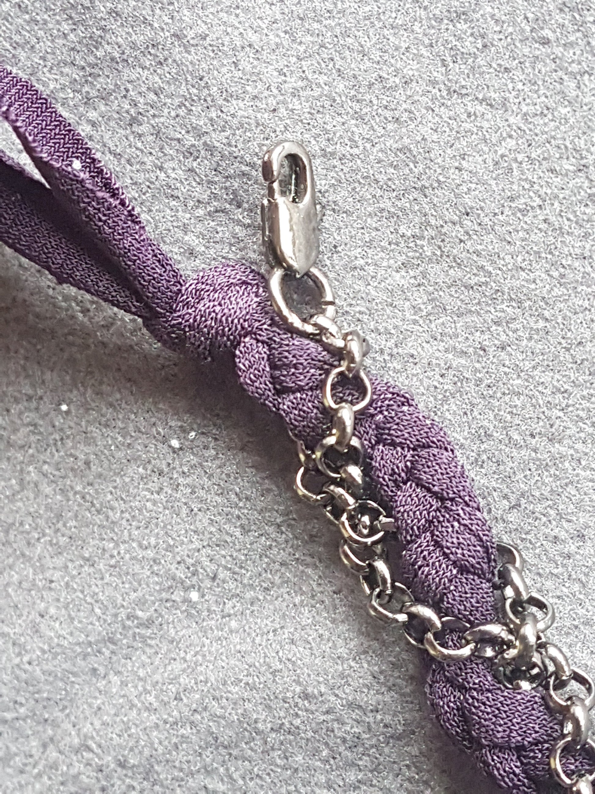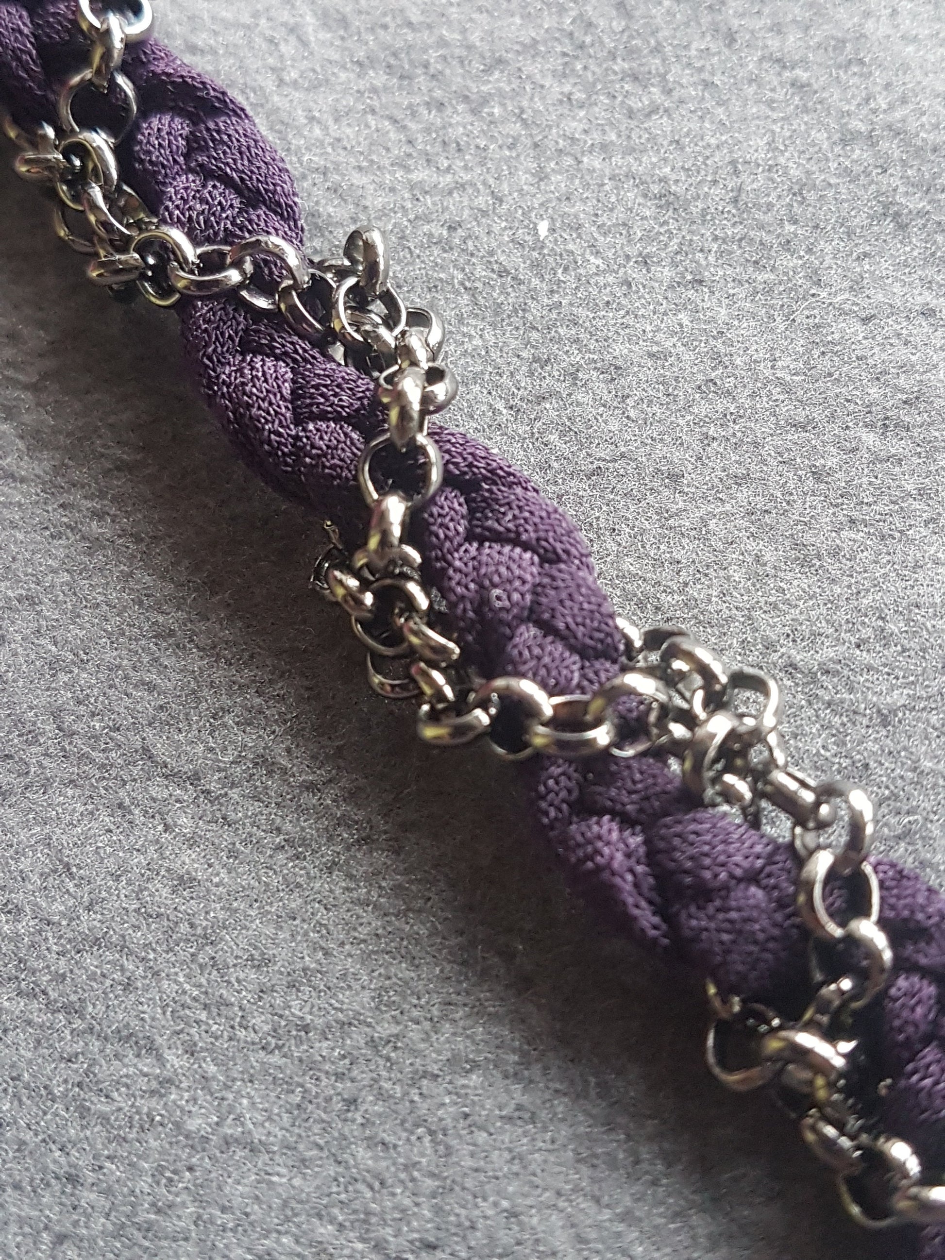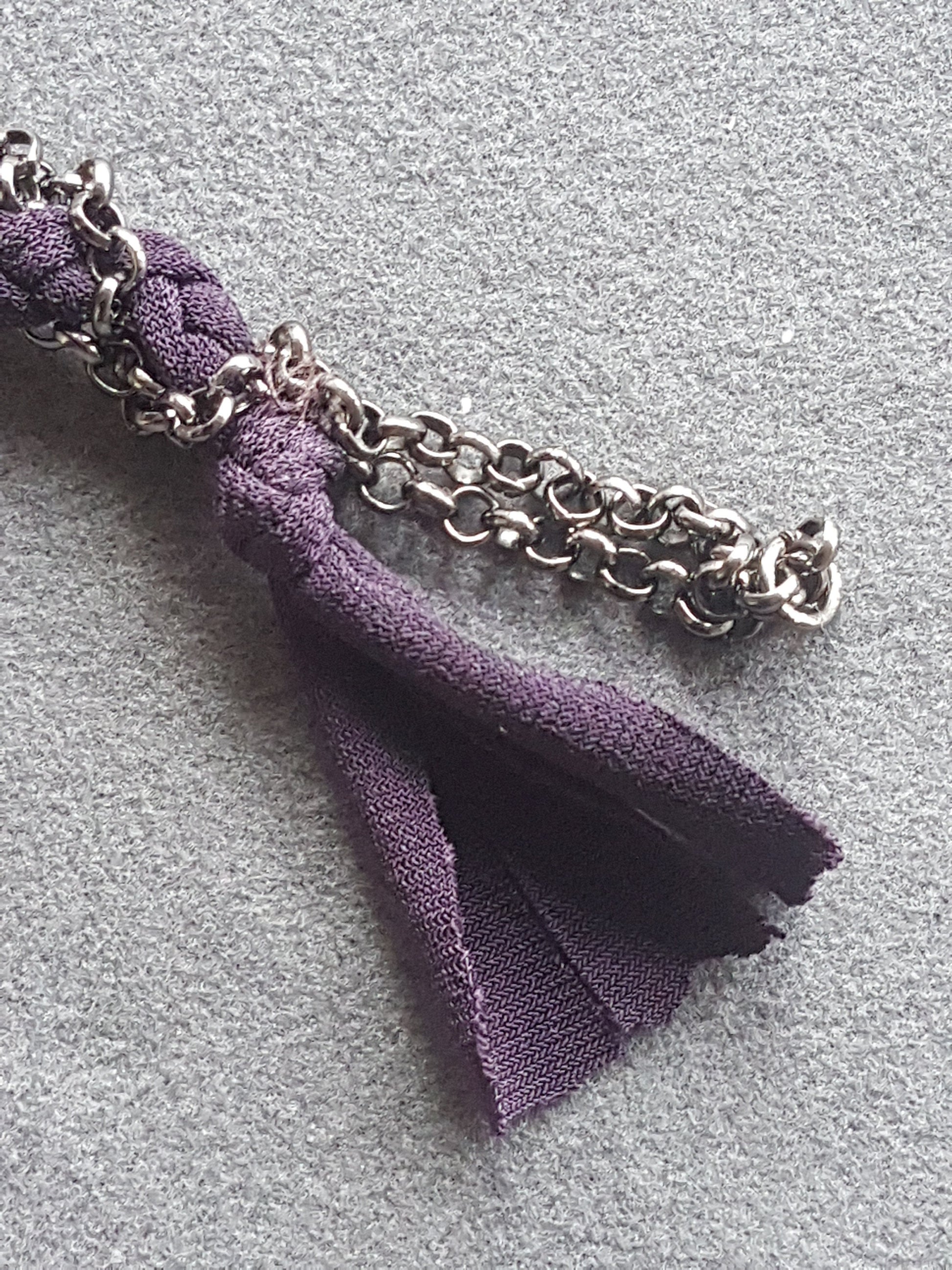 This one is 7 inches long, 8 inches including the tassel lengths. It is made from one strand of hand braided fabric in dark purple/aubergine fabric and two strands of gun metal grey chain.