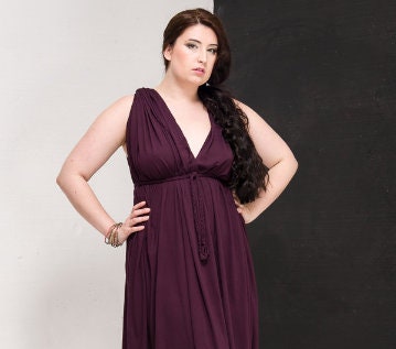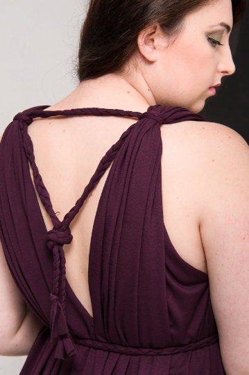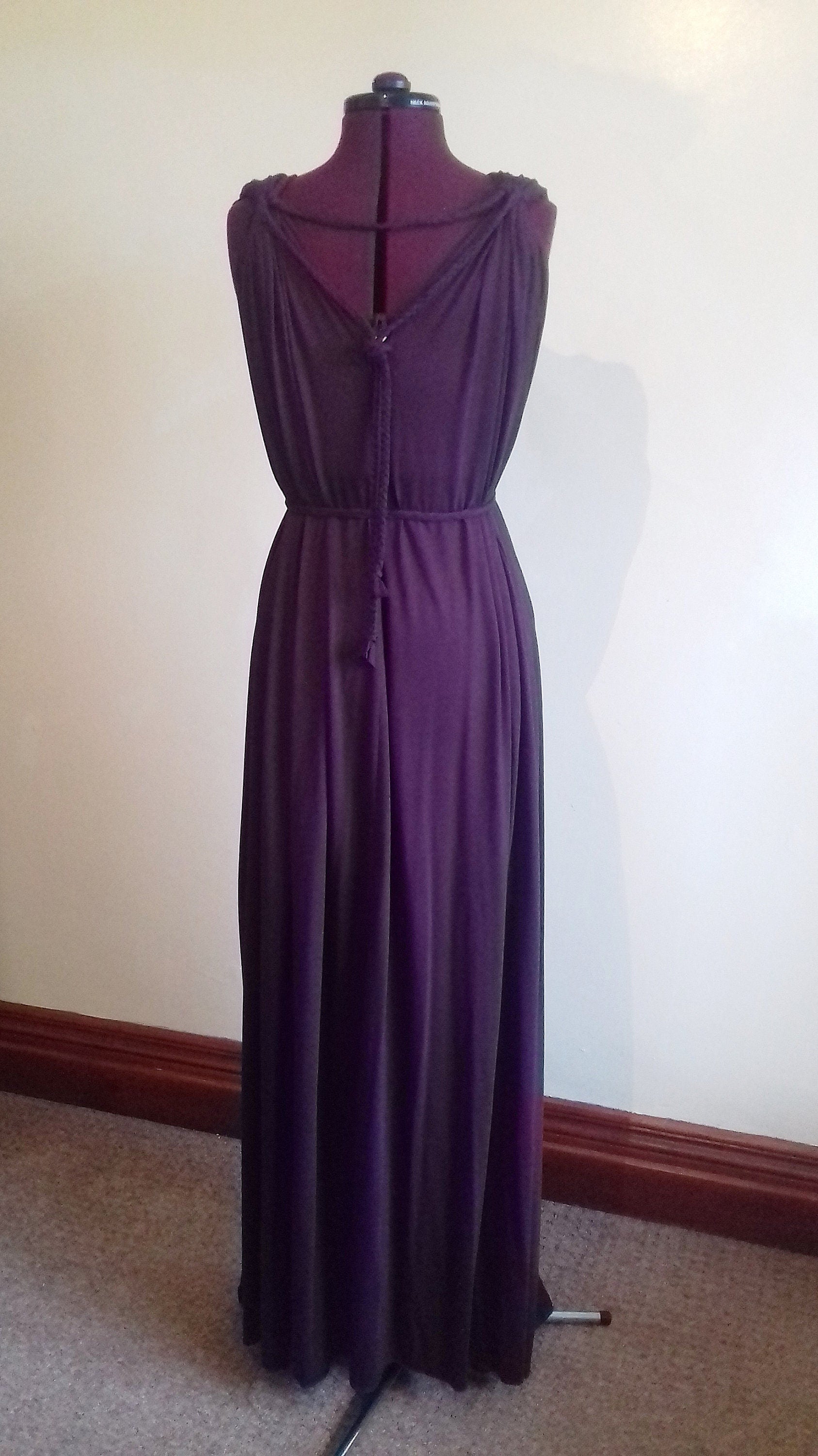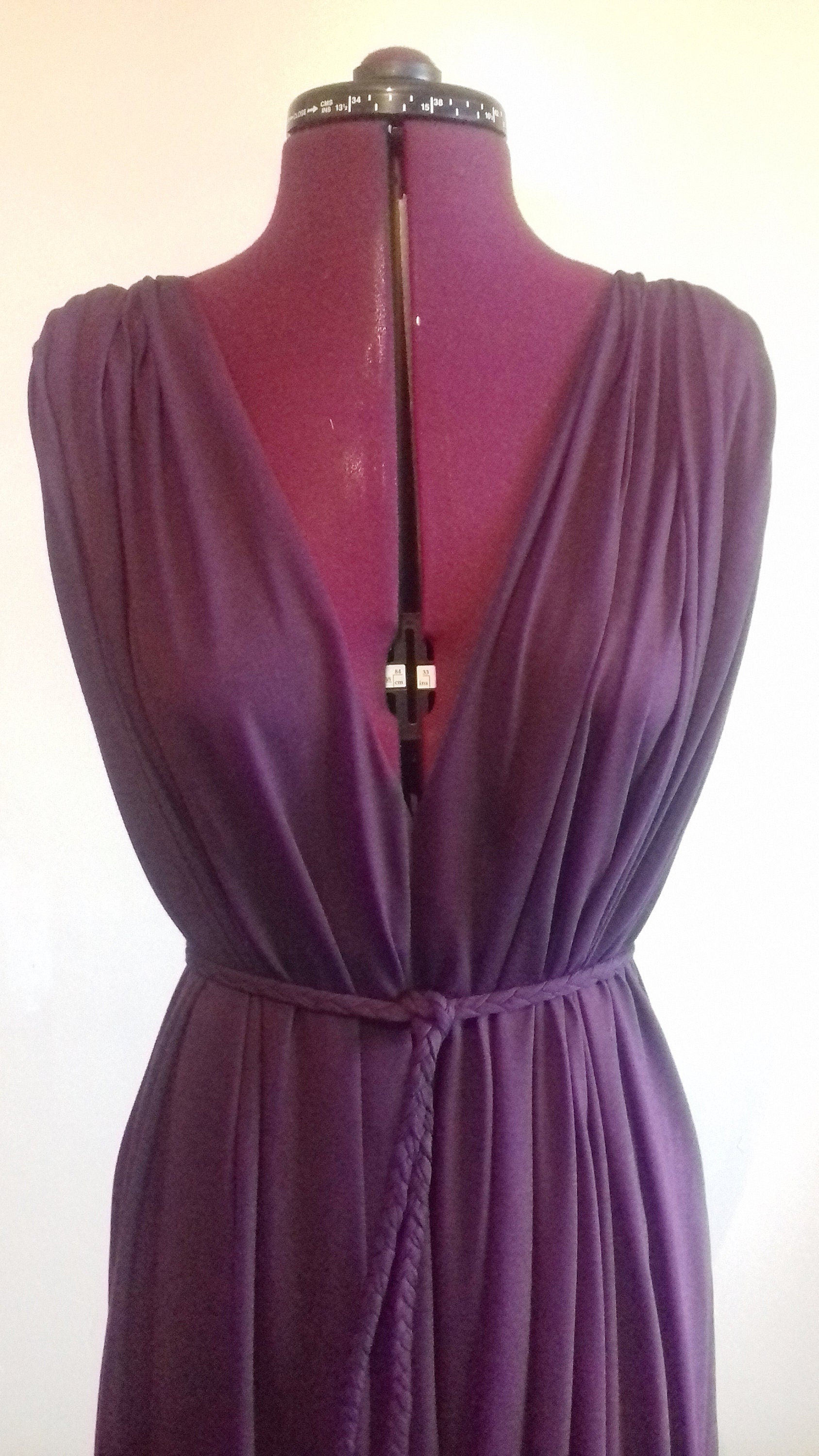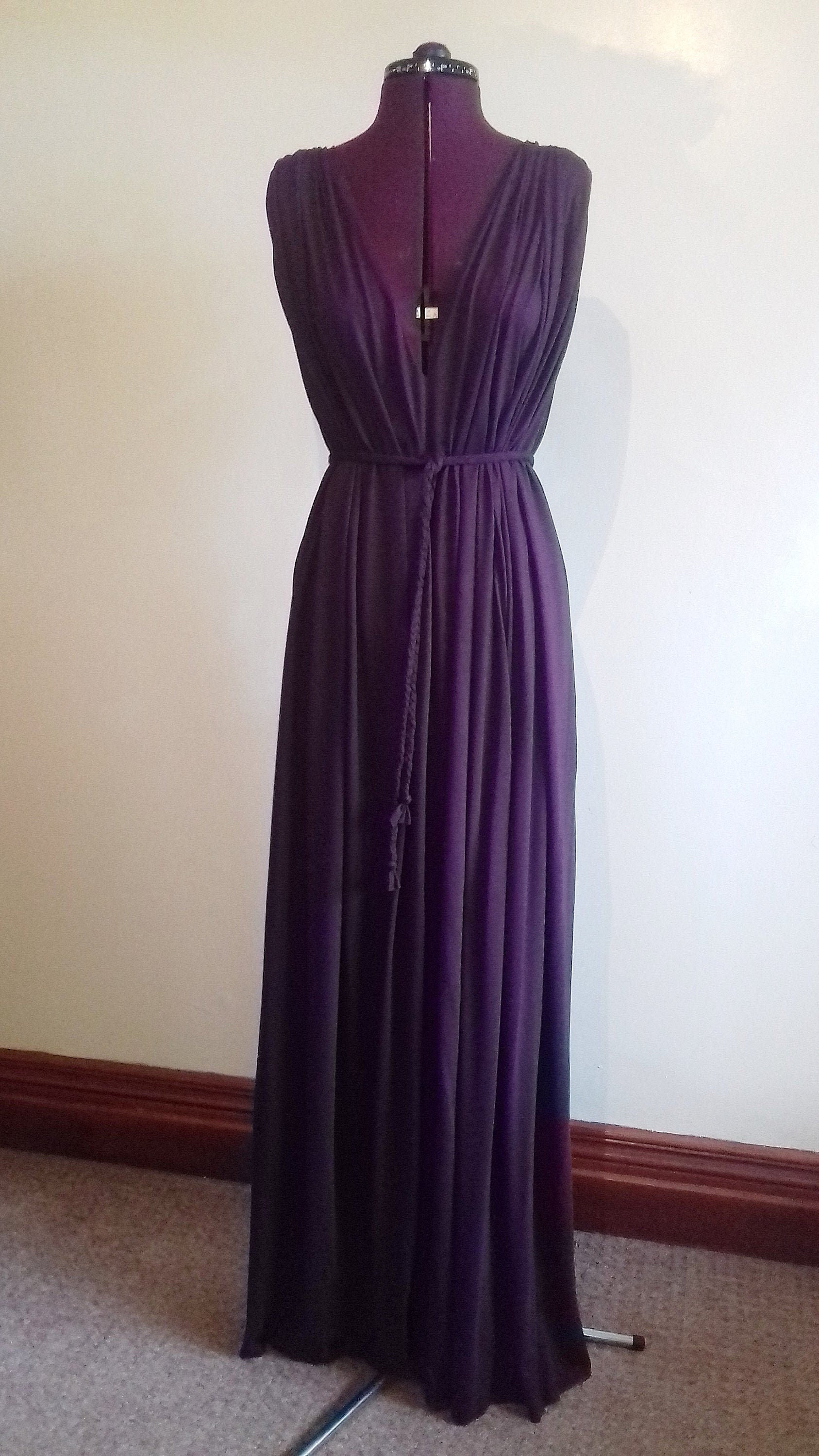 This is a gorgeous handmade purple jersey drape dress. It has a plunge front and back V neckline. Four splits half way up the front, back and sides just like the black version also shown here. It includes a wrap around belt and plaited tie detail on the back shoulders.