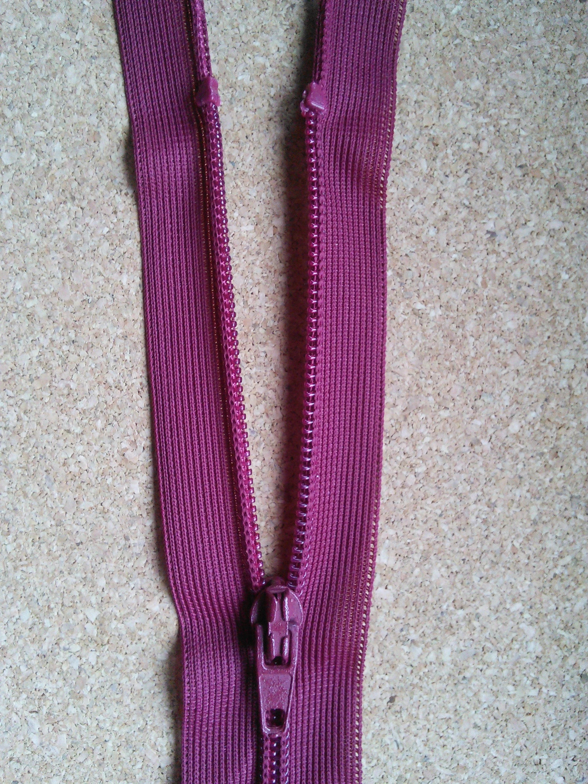 These zips are brand new. This one is a raspberry red 23.5 inches (zip part only), with nylon teeth and two different metal zipper ends.
