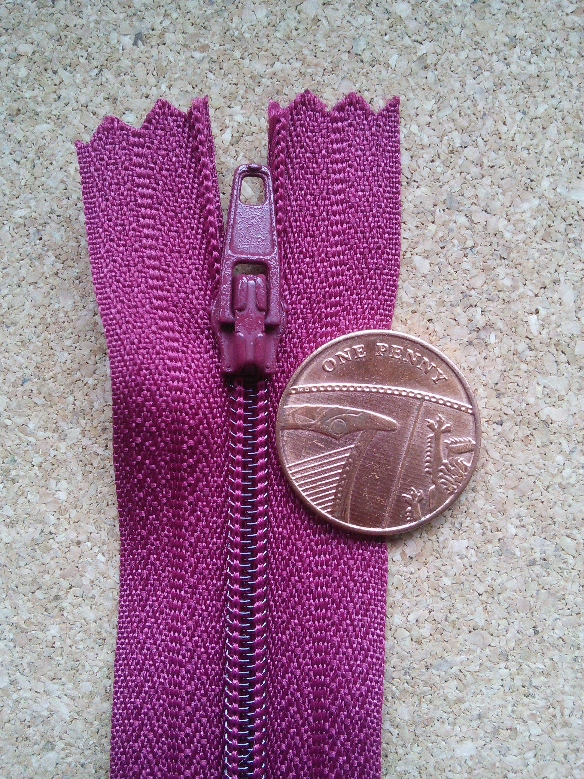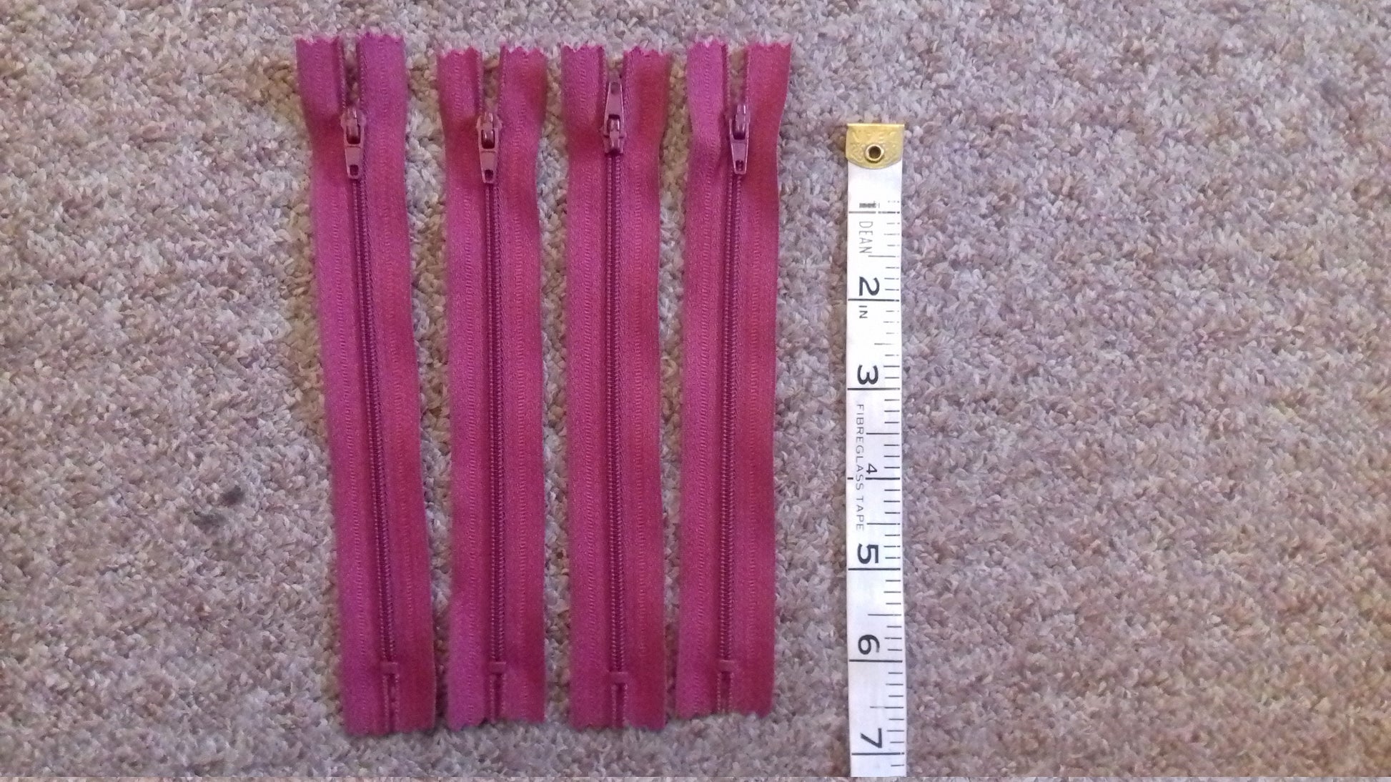 These zips are brand new. This one is a raspberry red 6 inches (zip part only), with nylon/plastic teeth and and end and metal zipper.
