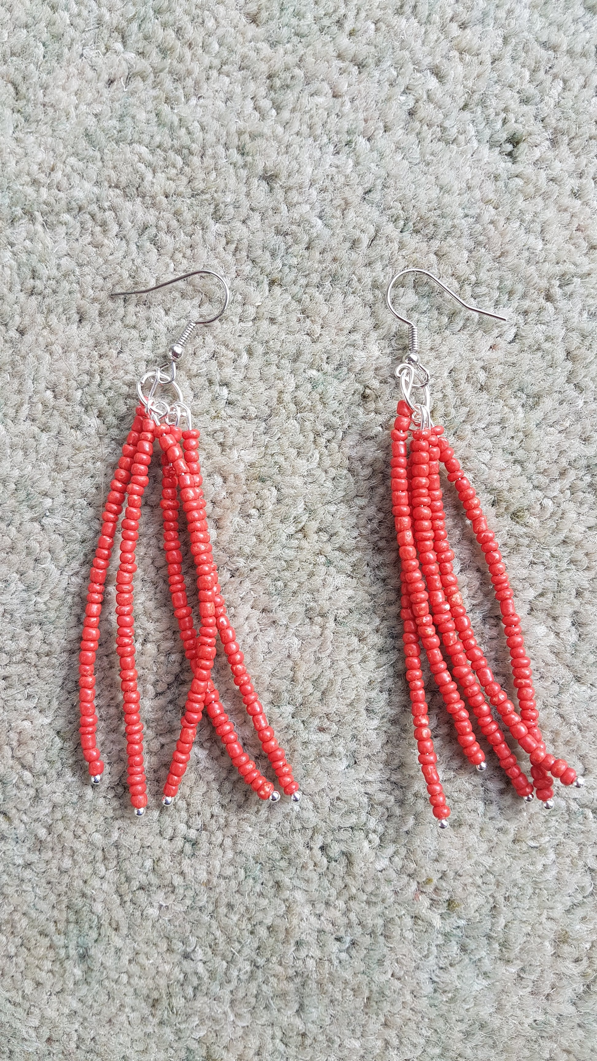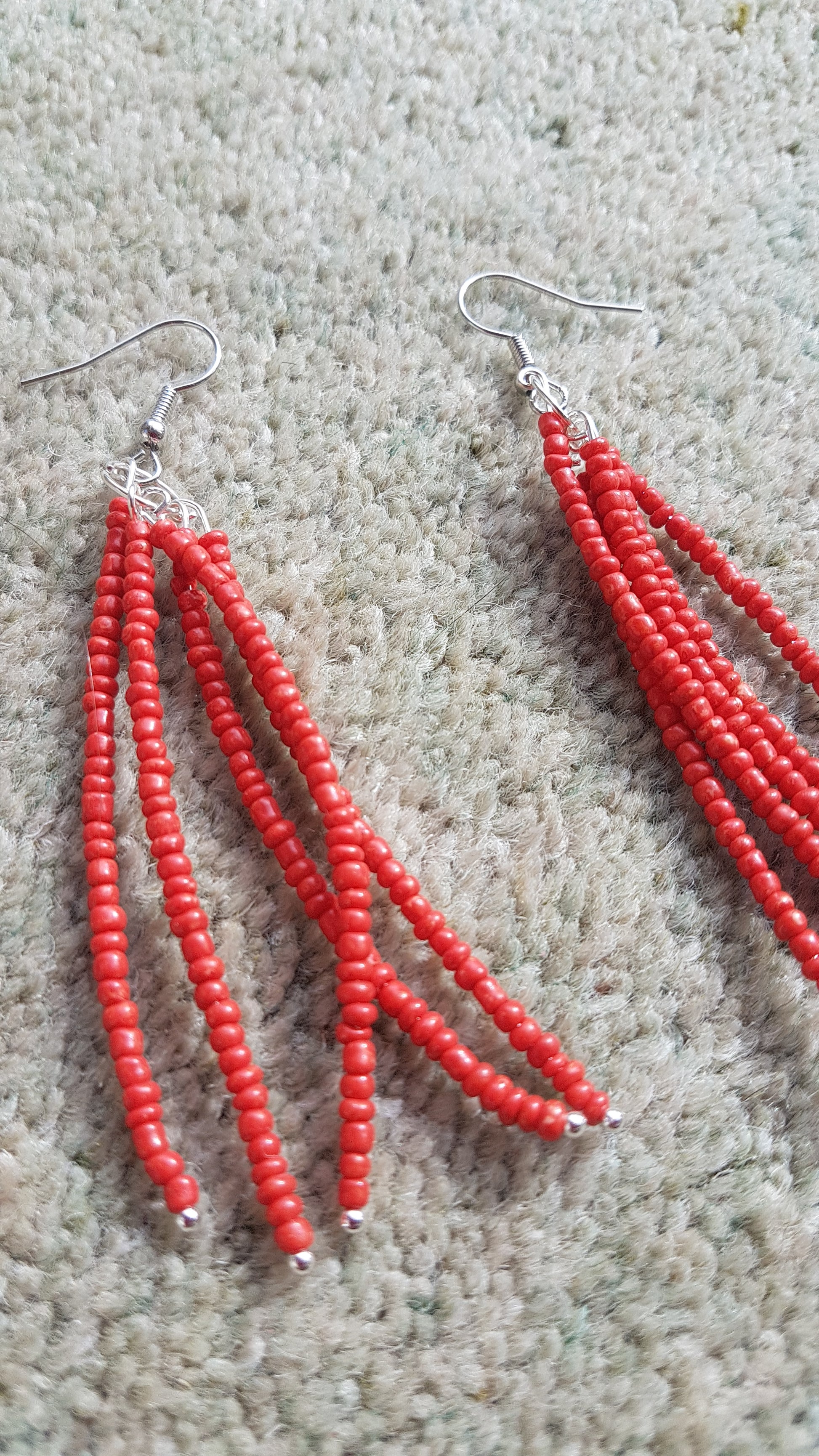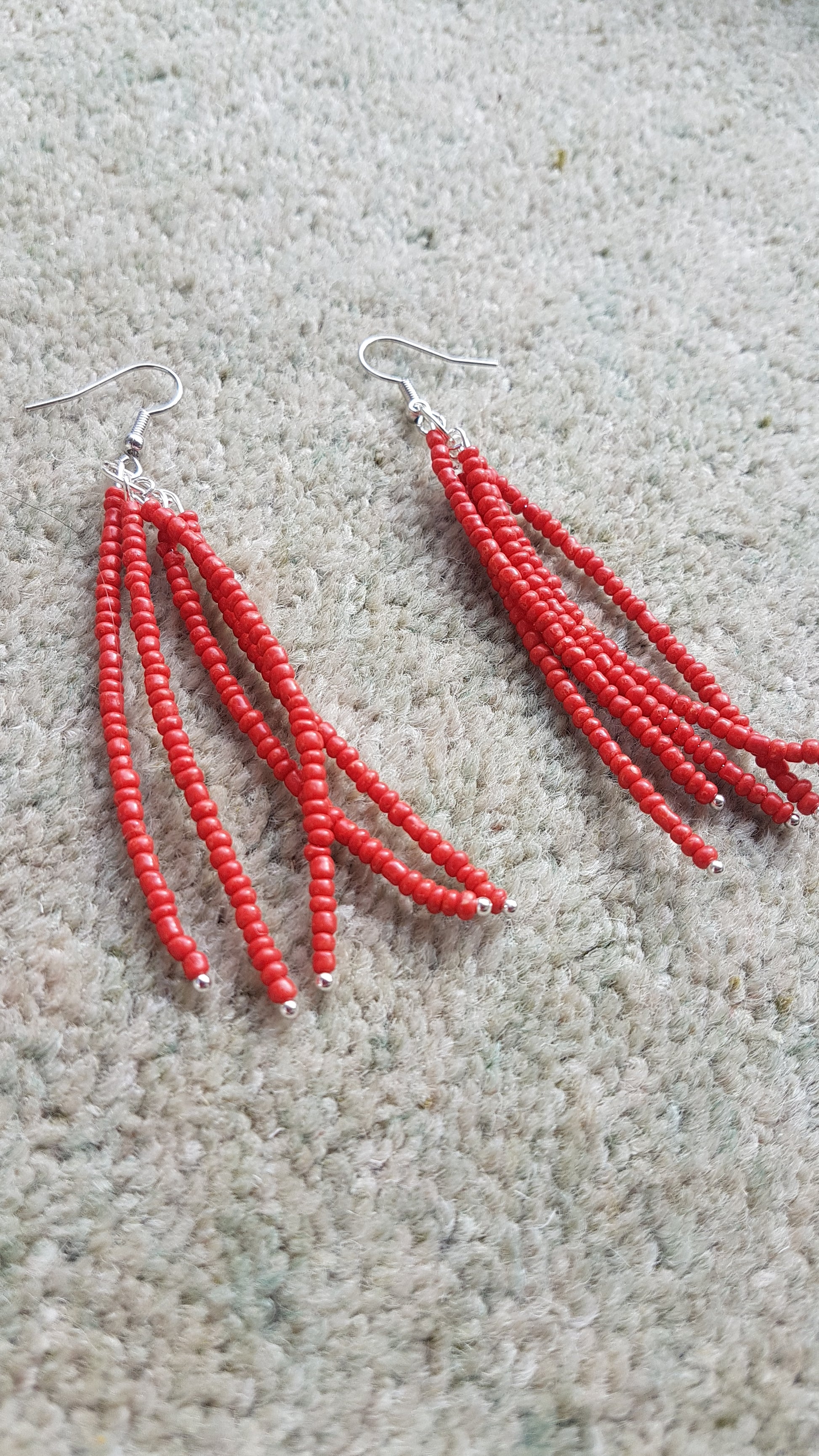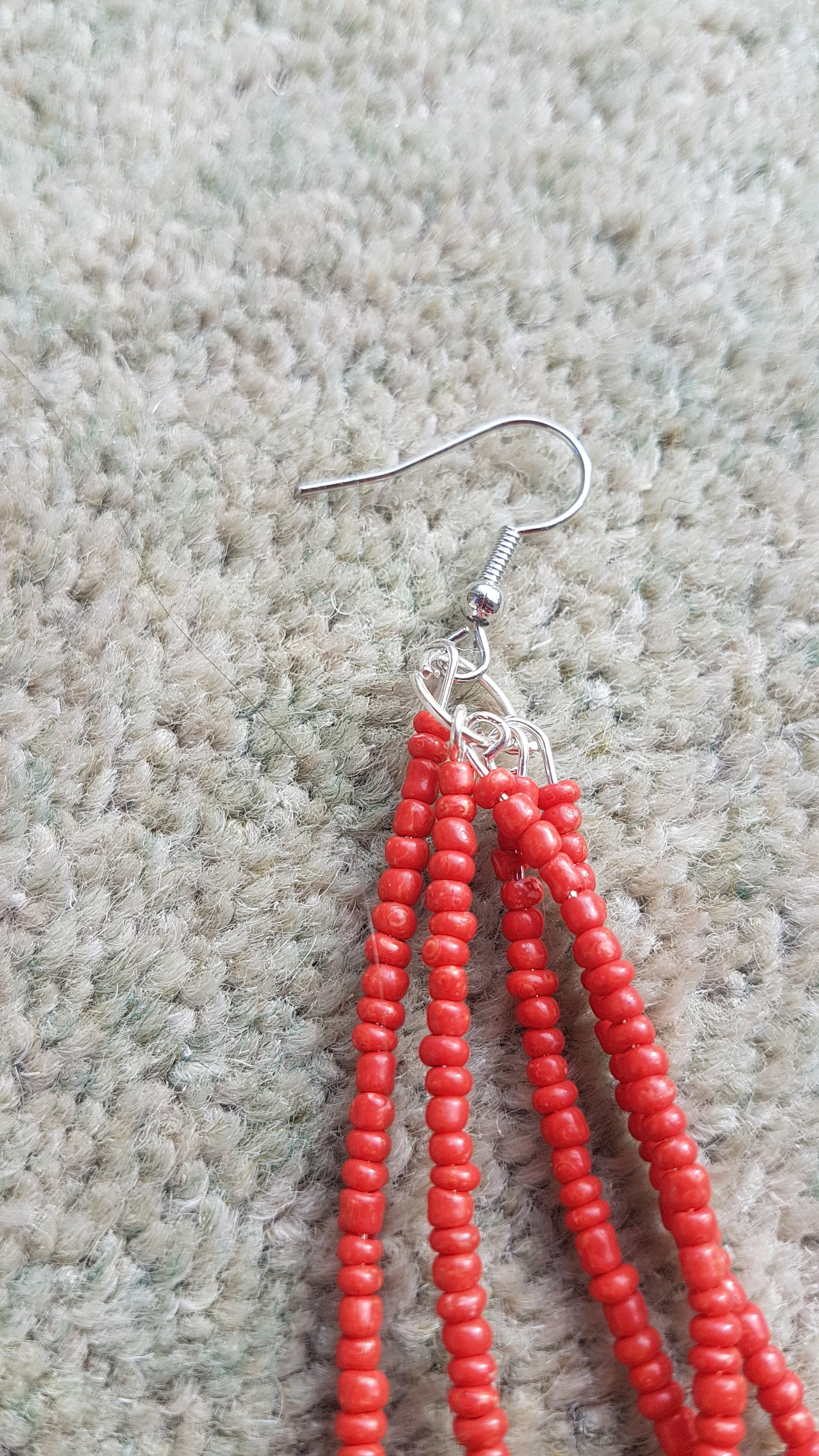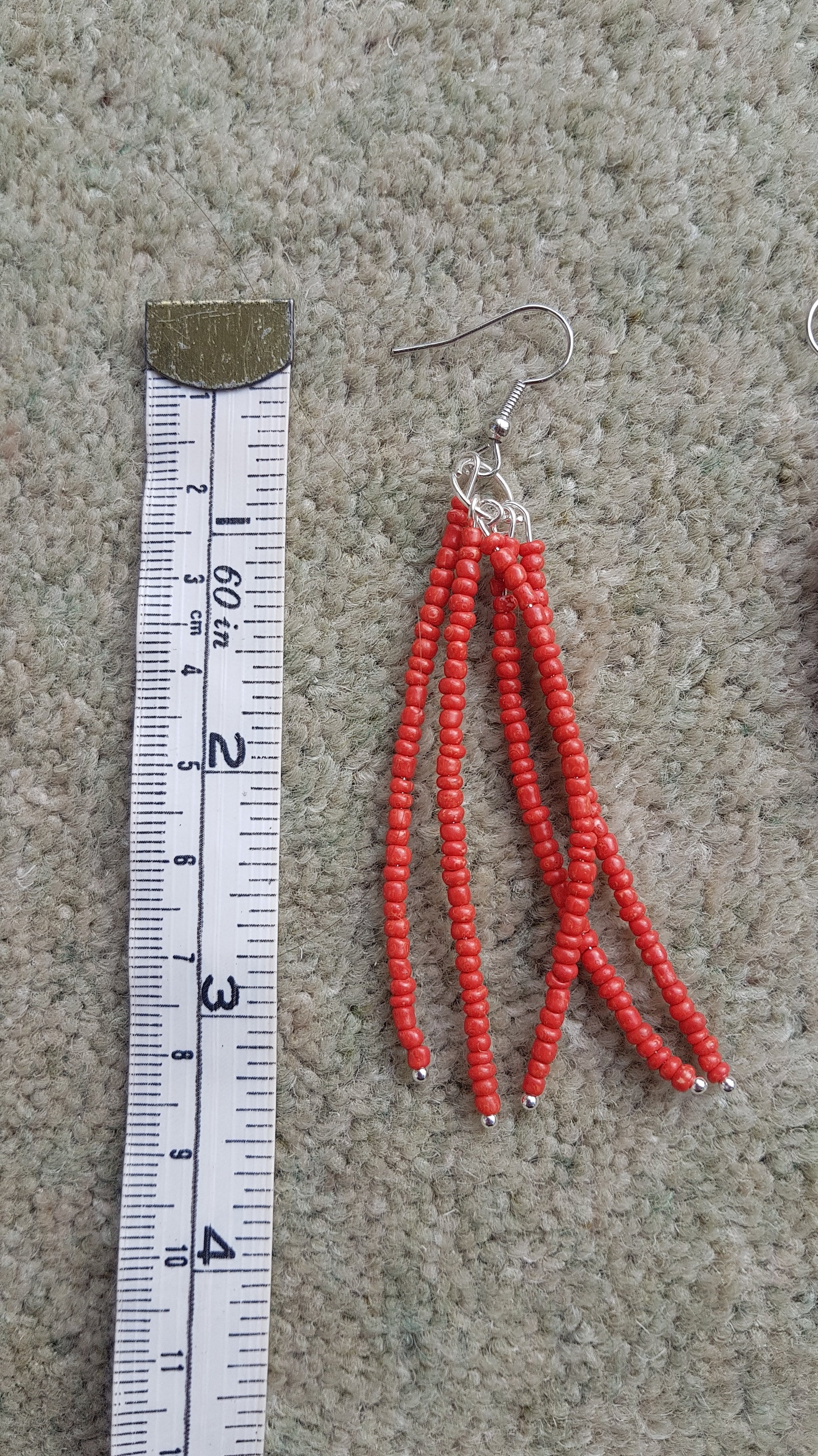 This pair have a length approx 3.5 inches and comprise a silver effect earring with tiny red seed beads.