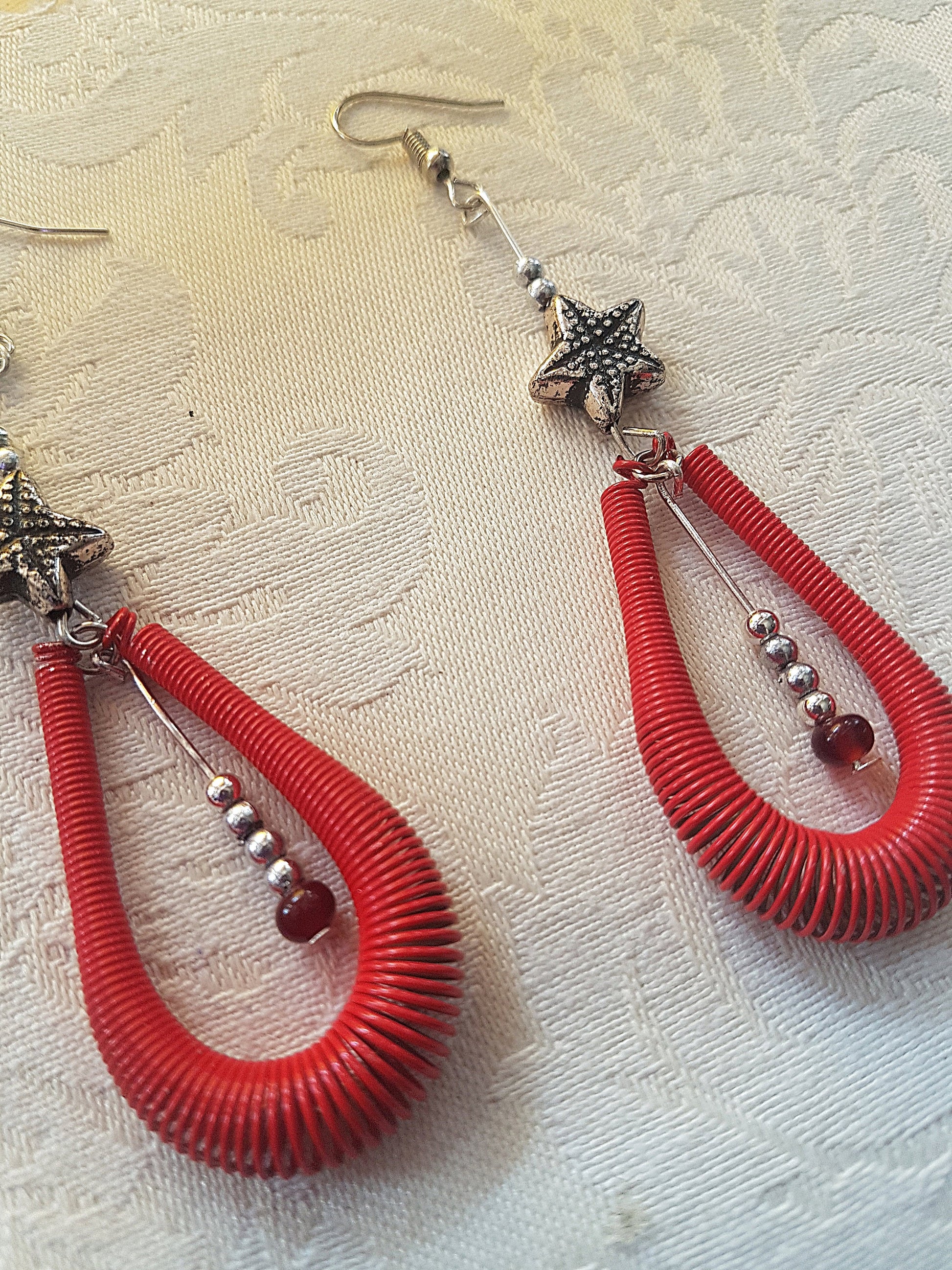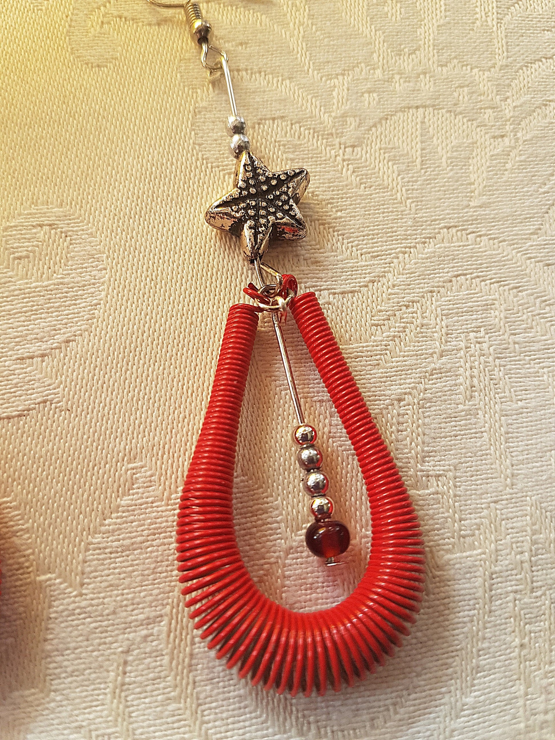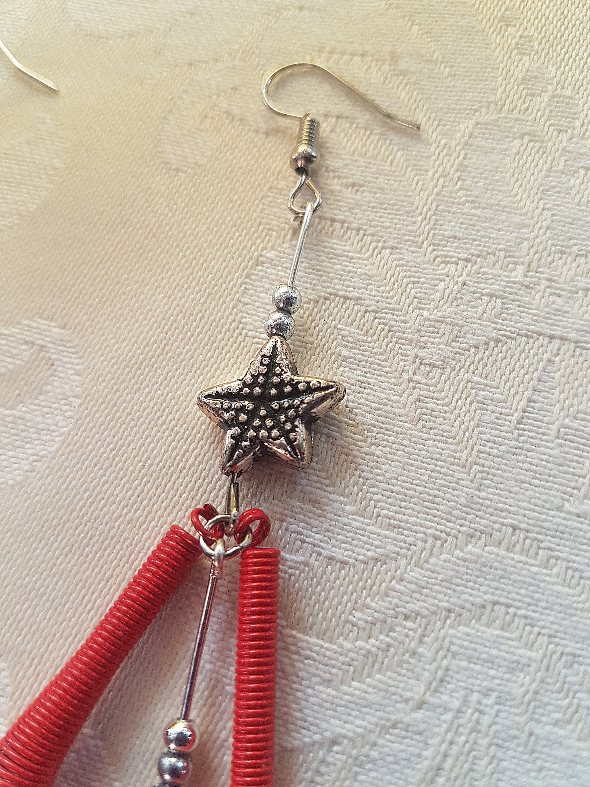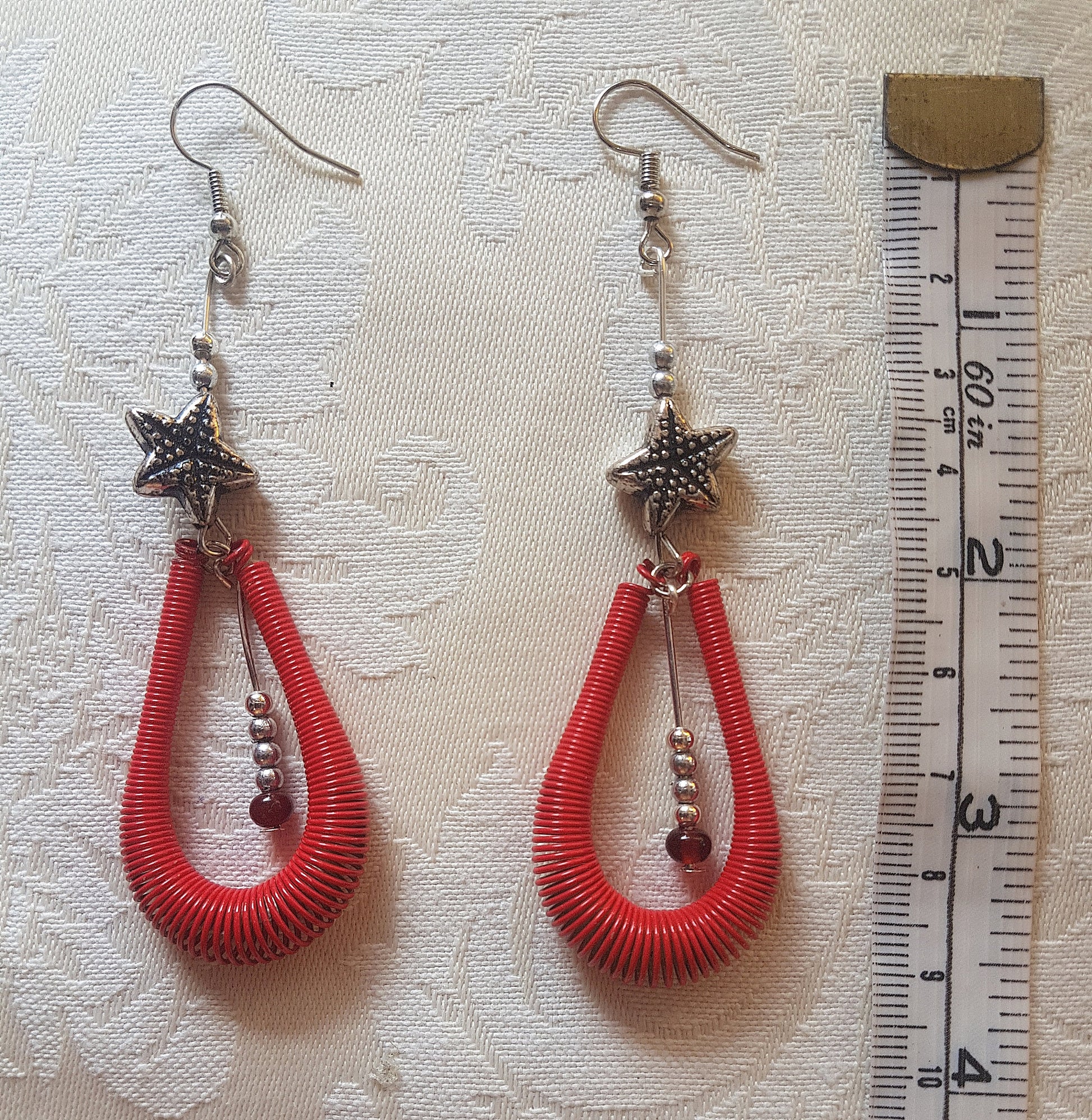 This pair have a length approx 3.5 inches and comprise beads, a faux silver starfish and a red spiral feature.