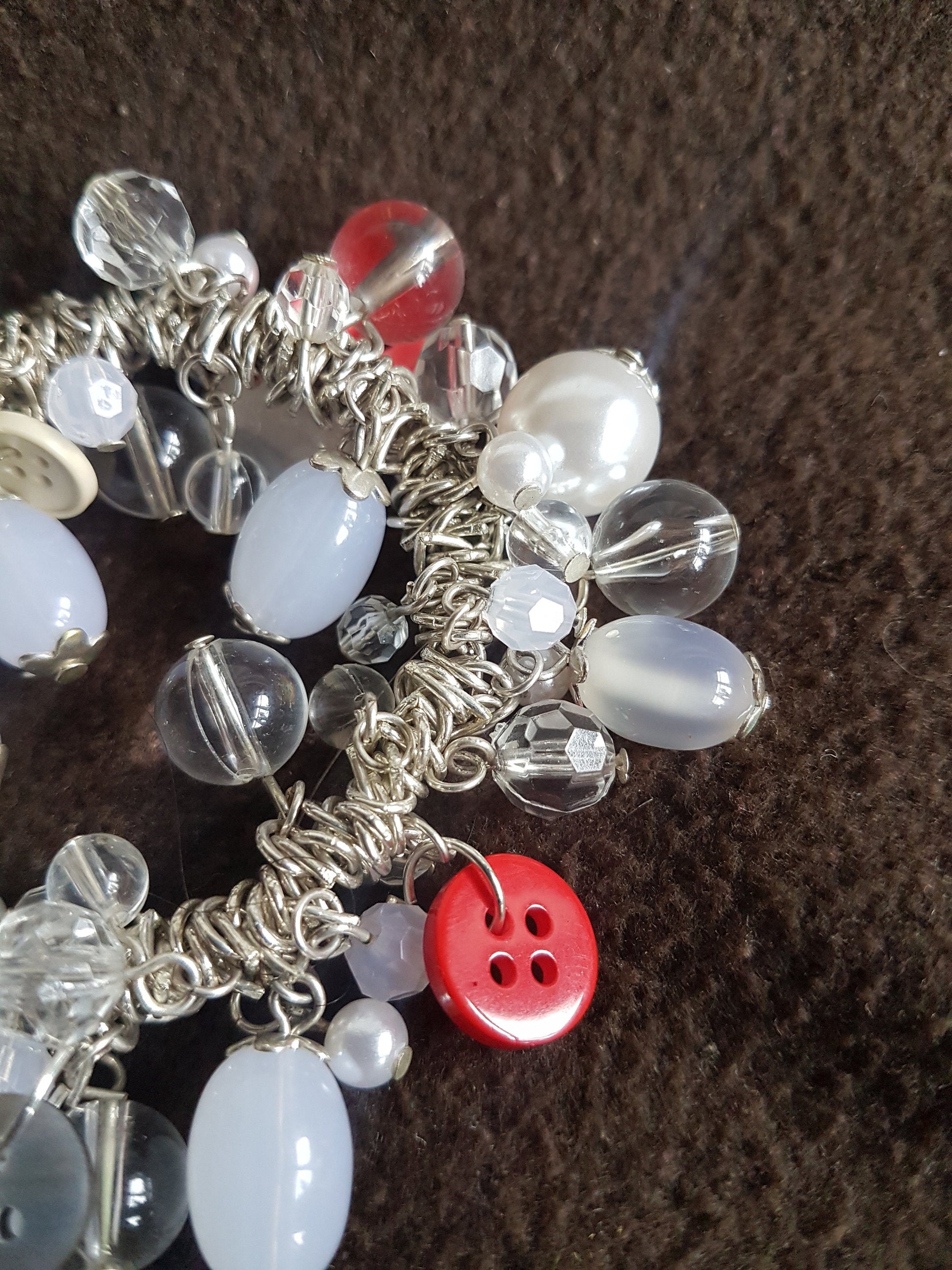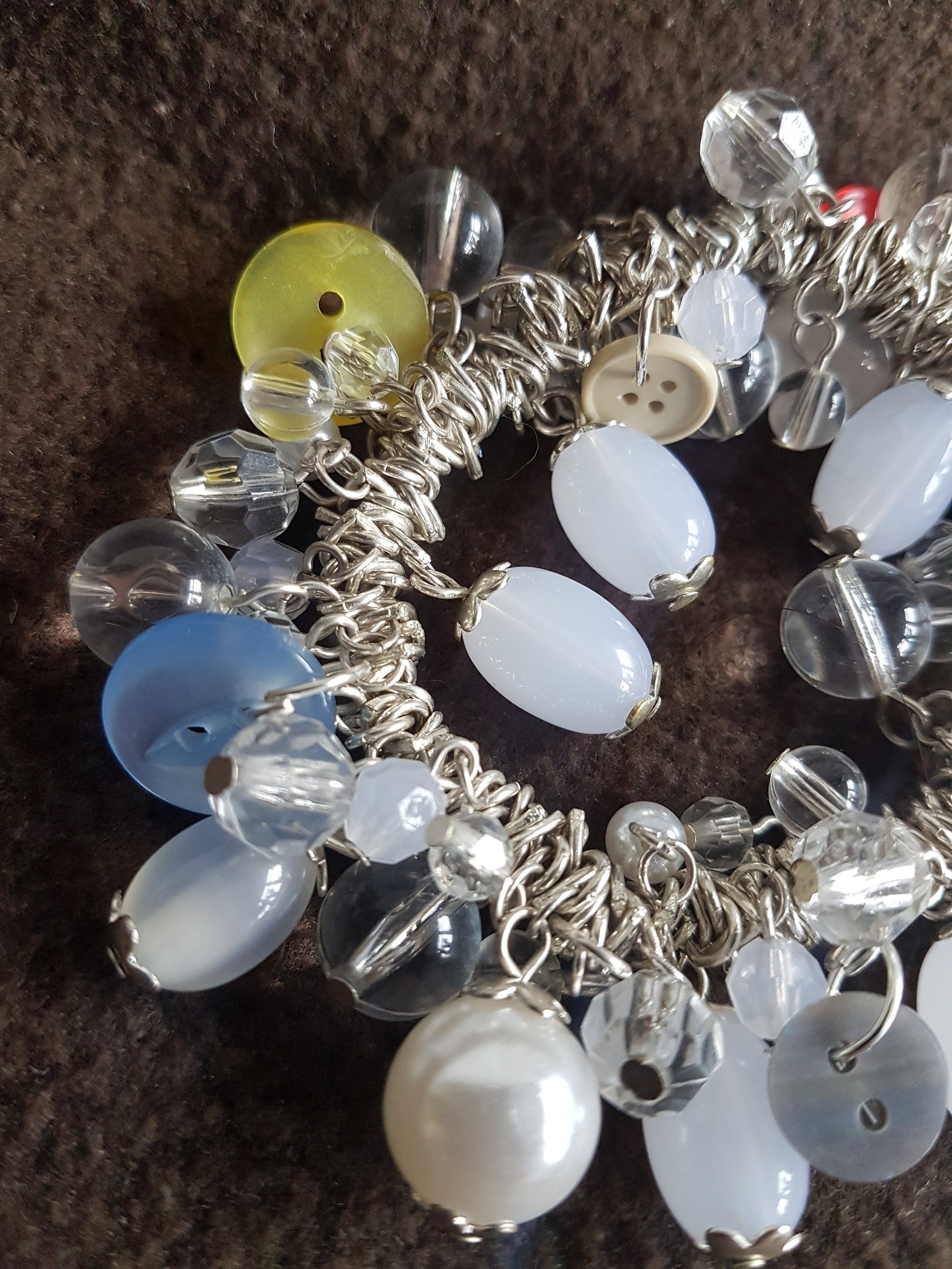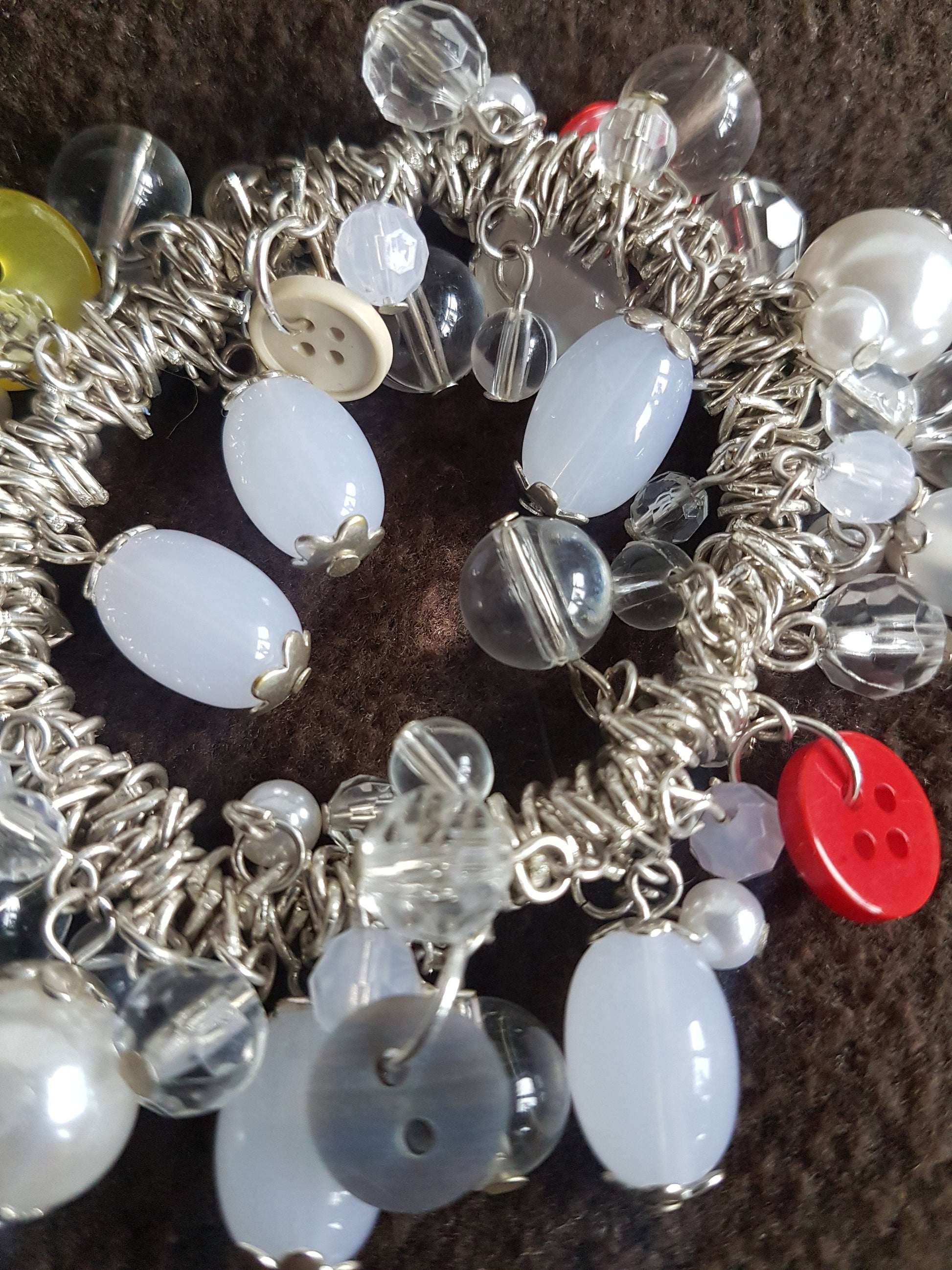 This bracelet is on elastic, so it will fit all sizes. It is made with clear, white and silver resin beads and vintage buttons in various colours. It's a wonderful statement bracelet and one of a kind!