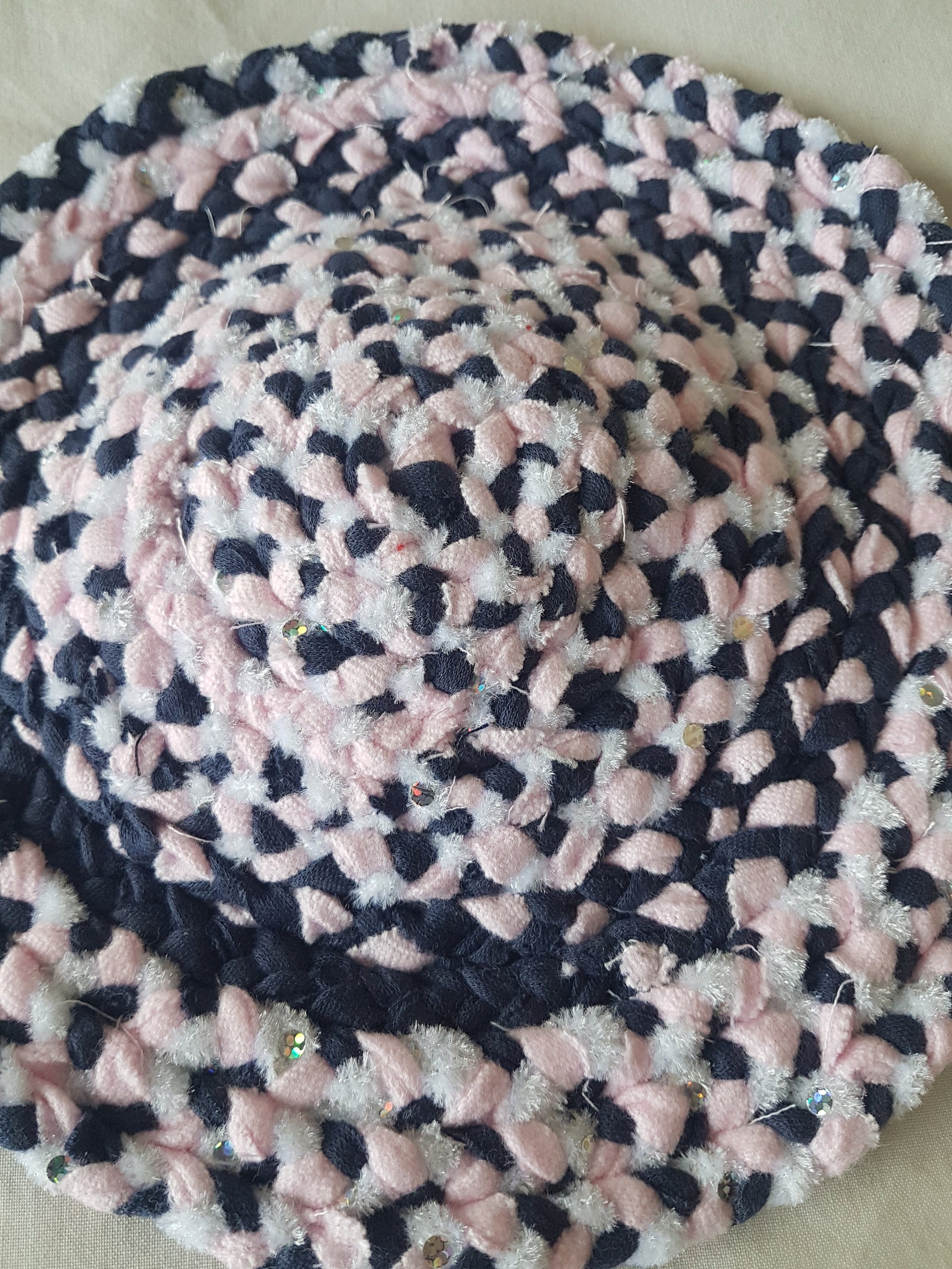 Up for sale here is a single hand-braided coaster place mat made with navy blue, baby pink, white and silver sequin fabric recycled from my design studio, braided and stitched together into a round coaster.