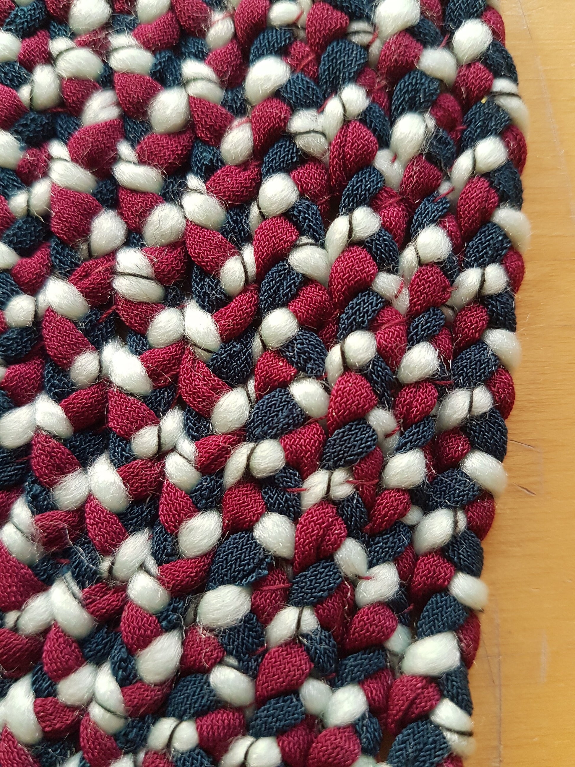 Up for sale here is a single hand-braided coaster place mat made with dark and light green and burgundy/red fabric recycled from my design studio, braided and stitched together into a round coaster.