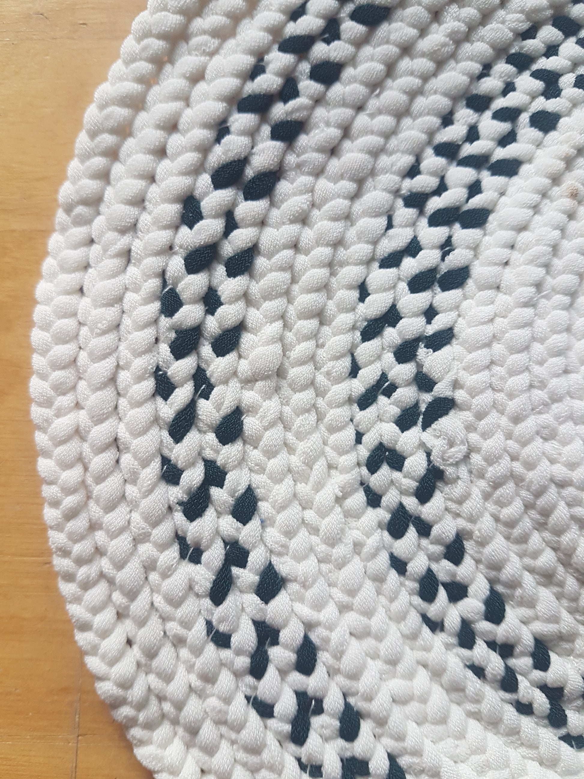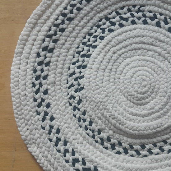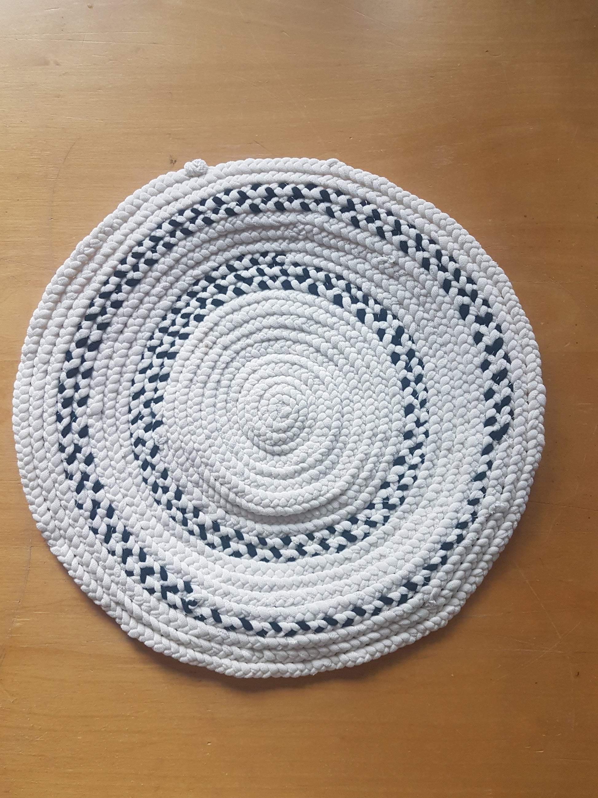 Up for sale here is a single hand-braided coaster place mat made with fabrics recycled from my design studio, braided and stitched together into a round coaster.